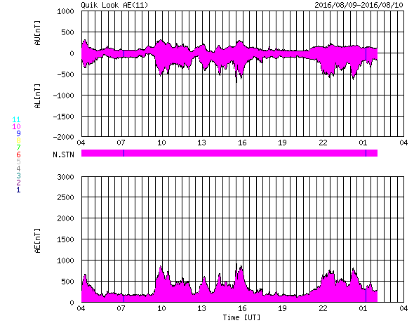 (c) SDO (NASA) ![]() ACEが観測した太陽風の磁場(1番上の枠、白線は全体の強度、赤線は南北成分) および、太陽風の密度(3番目の橙線)、速度(4番目の黄線) (c) NOAA/SWPC ![]() リアルタイムAE指数 下段のAEグラフの値が高くなると、オーロラ活動が活発化しています。 (c) 京都大学, NICT ![]() 27日の太陽周期に合わせたデータプロット 太陽が同じ面を地球に向けていた27日前の変化から、今後を予想することができます。 (c) 作図:宇宙天気ニュース