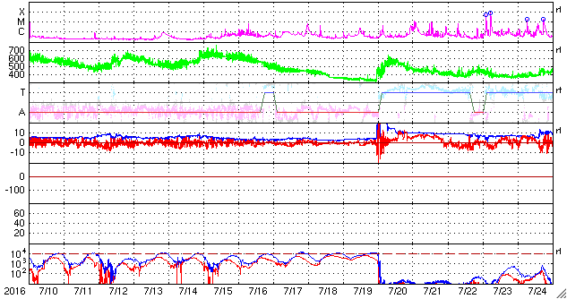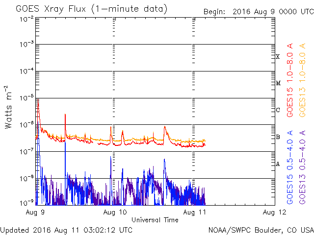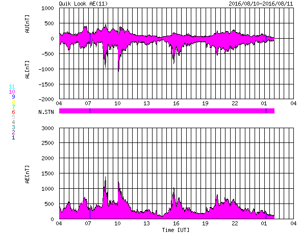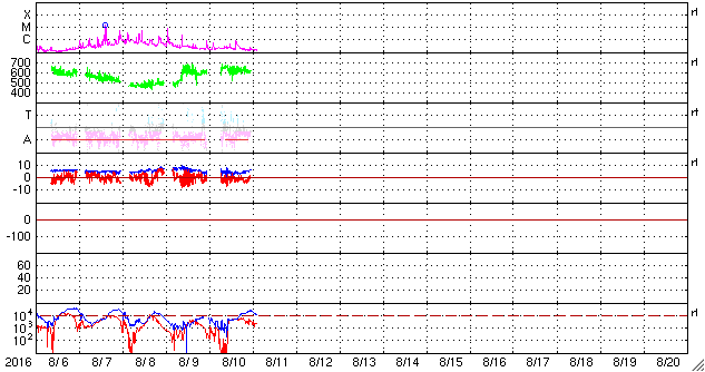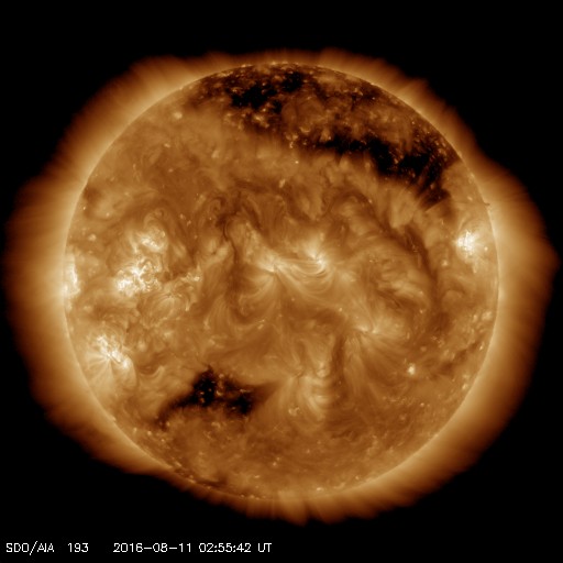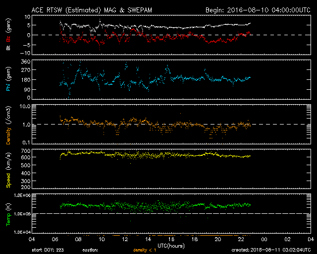 2016/ 8/11 12:03 更新 600km/秒の高速太陽風は続いています。磁気圏も活動的です。 担当 篠原 太陽風の速度は、 昨日のニュースの後、650km/秒へ上がりました。 今日にかけて少し下がっていますが、 現在も600km/秒と高い速度を保っています。 太陽風の磁場強度は、5nT付近で安定しています。 磁場の南北成分は、振れ幅は小さいですが、 南寄りになっています。 速度が高いことと重なって、 磁気圏の活動は活発に続いているようです。 AE指数では、500nT前後の変化が続き、 1000nTに達する激しい活動も、3回ほど発生しています。 今日は、SDO衛星AIA193の写真が更新されています。 これによると、コロナホールは西側に通り過ぎていて、 太陽風は次第に落ち着いて行きそうです。 27日周期の前周期のように、 3日くらいで高速の太陽風は終わるかもしれません。 太陽は、Bクラスの小さいフレアが起きている程度で、 比較的穏やかです。 2574群の隣りに新しい黒点が出現しています。 放射線帯の高エネルギー電子は、 昨日よりも少し増加しています。 太陽風の高まりが影響したようです。 ![]() SDO衛星のAIA193カメラによる太陽コロナの様子 (c) SDO (NASA) ![]() SDO衛星による太陽の可視光写真。マウスの矢印を写真に重ねると、黒点番号付きの写真に切り替わります。 (c) SDO (NASA) ![]() ACEが観測した太陽風の磁場(1番上の枠、白線は全体の強度、赤線は南北成分) および、太陽風の密度(3番目の橙線)、速度(4番目の黄線) (c) NOAA/SWPC ![]() リアルタイムAE指数 下段のAEグラフの値が高くなると、オーロラ活動が活発化しています。 (c) 京都大学, NICT ![]() 27日の太陽周期に合わせたデータプロット 太陽が同じ面を地球に向けていた27日前の変化から、今後を予想することができます。 (c) 作図:宇宙天気ニュース