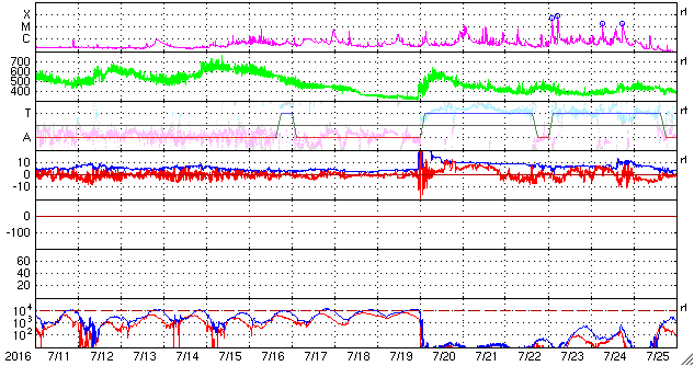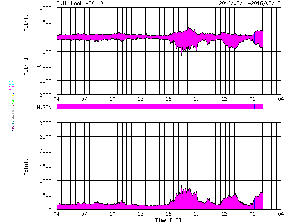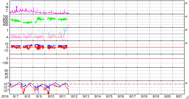 2016/ 8/12 12:06 更新 太陽風は600km/秒の高速状態を保っています。ニュージーランドのオーロラをどうぞ。 担当 篠原 ニュージーランド南島・ダニーデンの中村太一さんより、 現地10日22時(世界時10日10時)に撮影された、 オーロラの写真を2枚と、 一週間ほど遡りますが、 4日に撮影されたオーロラの写真を2枚いただきました。 世界時10日10時頃は、 昨日のニュースのAE指数のグラフでは、 1200nTに達する大きな変化が起きています。 太陽風の速度は650km/秒、磁場は -3nT程度の南向きになっていて、 オーロラの活動に良い条件となっていたようです。 中村さんによると、 観測の初めは、はっきりとは見えていなかったそうですが、 気がつくとオーロラの柱が数本立ち、 みるみるうちに、長くなり、明るくなりして、 立派なオーロラの姿になったそうです。 撮影場所は、ダニーデンのセカンドビーチという、 波の荒い玉砂利の浜だとのことです。 写真の前景としてとても目立っている円錐状の物体は、 背の高さの2倍ほどの大きさの鳥の絵が描いてある コンクリート製の排水路の出口だそうです (Google map でどうぞ)。 現地人のマオリ族の言い伝えで、 写真の奥の丘から人が亡くなった後、 魂が来たところへ旅立つところなのだそうです。 後半の2枚は、8月4日、 雪が降っているときに、雲の合間から見たオーロラだそうです。 鹿児島は、猛烈な暑さに包まれている最中で、 ちょっとうらやましくなるような、雪景色のオーロラです。 とても素敵な写真たちを、どうもありがとうございます。 現在の太陽風は、600km/秒の高速状態が続いています。 磁場強度も、5nTと平均的な値で安定しています。 磁場がやや北寄りになっているためか、 磁気圏の活動は少し静かになっていて、 AE指数のグラフは、後半に中規模の山が2つある程度です。 27日周期の図の前周期を見ると、 今日くらいから、太陽風の速度は下がり始めるかもしれません。 太陽は、2574黒点群でC2.4の小規模フレアが起きました。 その他は目立った活動はありません。 新しい黒点には、2577群と番号がついています。 ![]() ニュージーランド南島ダニーデンで、現地10日22時6分(世界時10日10時6分)に撮影されたオーロラ。 (c) 中村太一氏 ![]() ニュージーランド南島ダニーデンで、現地10日22時6分(世界時10日10時6分)に撮影されたオーロラ。 (c) 中村太一氏 ![]() ニュージーランド南島ダニーデンで、4日に撮影されたオーロラ。 (c) 中村太一氏 ![]() ニュージーランド南島ダニーデンで、4日に撮影されたオーロラ。 (c) 中村太一氏 ![]() SDO衛星のAIA193カメラによる太陽コロナの様子 (c) SDO (NASA) ![]() SDO衛星による太陽の可視光写真。マウスの矢印を写真に重ねると、黒点番号付きの写真に切り替わります。 (c) SDO (NASA) ![]() ACEが観測した太陽風の磁場(1番上の枠、白線は全体の強度、赤線は南北成分) および、太陽風の密度(3番目の橙線)、速度(4番目の黄線) (c) NOAA/SWPC ![]() リアルタイムAE指数 下段のAEグラフの値が高くなると、オーロラ活動が活発化しています。 (c) 京都大学, NICT ![]() 27日の太陽周期に合わせたデータプロット 太陽が同じ面を地球に向けていた27日前の変化から、今後を予想することができます。 (c) 作図:宇宙天気ニュース