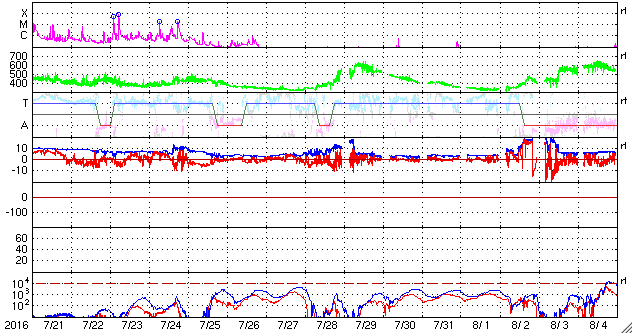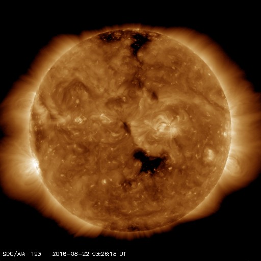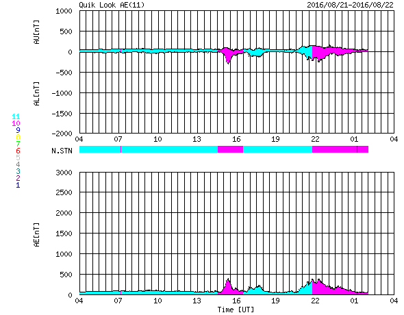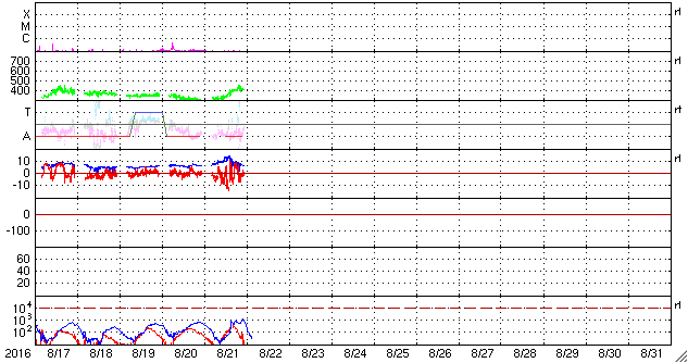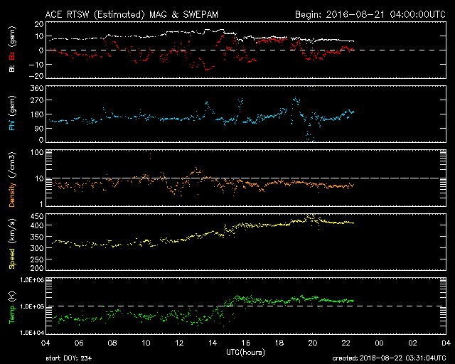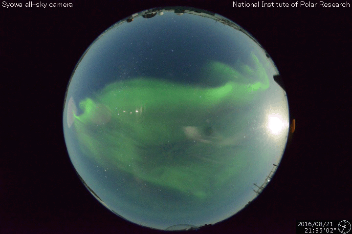 2016/ 8/22 12:31 更新 太陽風が平均的な速度に高まっています。太陽は新しい黒点が出現しています。 担当 篠原 昨日の午後より、太陽風の磁場が10nTに強まり、 夜に入ると、速度も上昇して、 今朝くらいに、400km/秒と平均的な速度に戻りました。 速度と反対に、磁場強度は5nTへ下がっています。 太陽風磁場が強まった頃、 南北成分は南向きに大きく振れて、 -10nTを超える変化も起きています。 この影響で、磁気圏の活動も高まりそうですが、 AE指数のグラフは、300nTの小規模の変化が2回程度と、 変化は起きていますが、規模は小さいものに留まっています。 世界時21日21時半頃のオーロラの様子を、 南極の昭和基地の動画で紹介します。 AE指数のグラフの、後ろ側の高まりの頃の撮影です。 夜空を横切る光の帯が美しく躍動しています。 一方、この動画でも、 オーロラの活動は特に激しくはなっていません。 SDO衛星AIA103の太陽コロナ写真では、 南半球のコロナホールが少し西に進んでいます。 この領域の影響は、まだこれからだと思います。 太陽は、2578黒点群は見えなくなりましたが、 中央部の東側(左側)に小さい黒点が、 また、南東の端(左下)に新しい黒点が現れています。 活動は穏やかで、X線グラフは変化が見られません。 ![]() 南極の昭和基地で、世界時21日21時半頃に撮影されたオーロラ。 (c) 国立極地研究所、(動画加工 : 宇宙天気ニュース) ![]() SDO衛星のAIA193カメラによる太陽コロナの様子 (c) SDO (NASA) ![]() SDO衛星による太陽の可視光写真。マウスの矢印を写真に重ねると、黒点番号付きの写真に切り替わります。 (c) SDO (NASA) ![]() ACEが観測した太陽風の磁場(1番上の枠、白線は全体の強度、赤線は南北成分) および、太陽風の密度(3番目の橙線)、速度(4番目の黄線) (c) NOAA/SWPC ![]() リアルタイムAE指数 下段のAEグラフの値が高くなると、オーロラ活動が活発化しています。 (c) 京都大学, NICT ![]() 27日の太陽周期に合わせたデータプロット 太陽が同じ面を地球に向けていた27日前の変化から、今後を予想することができます。 (c) 作図:宇宙天気ニュース