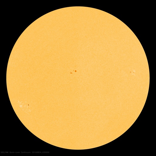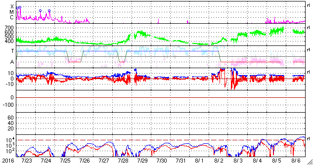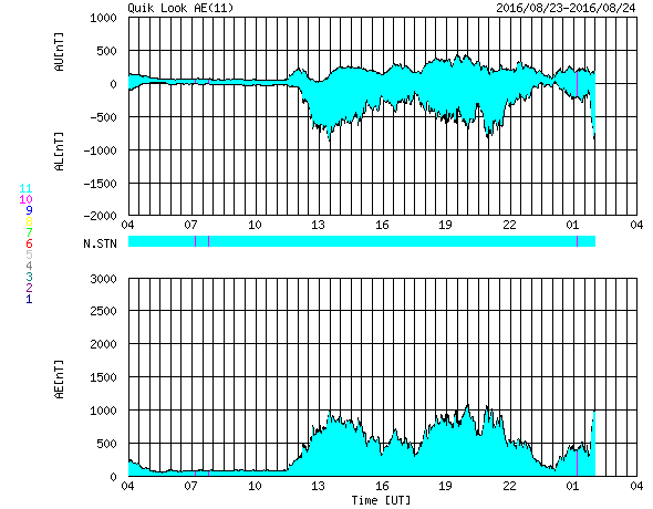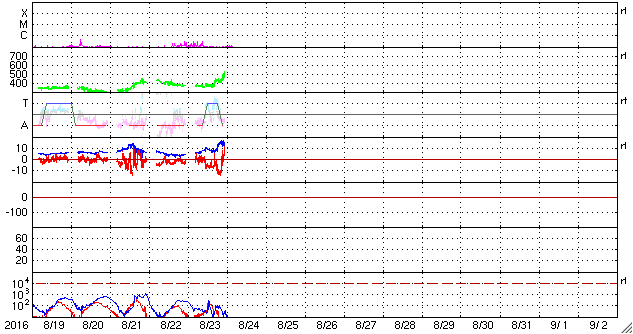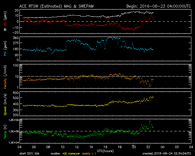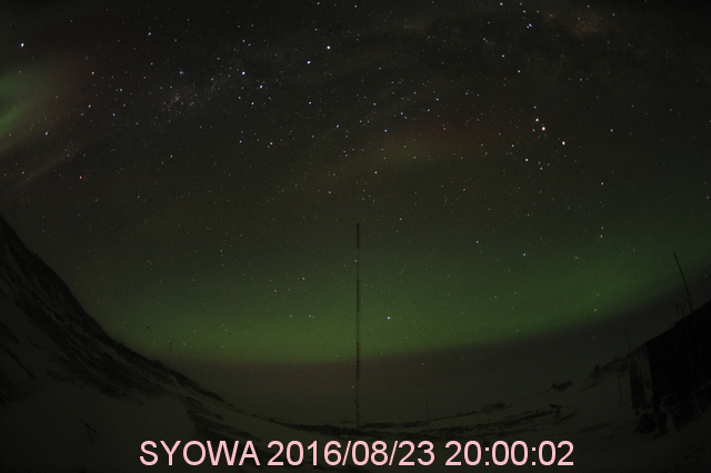 2016/ 8/24 12:35 更新 太陽風の速度が500km/秒に高まり、磁気圏の活動も強まっています。 担当 篠原 コロナホールによる太陽風の高まりが始まりました。 昨夜、23日20時(世界時23日11時)頃から、 太陽風の磁場強度は10nT近くに上がり、 更に、今朝にかけて15nTへ強まっています。 24日に入った頃から、速度も上昇を始め、 380km/秒とやや低速だった状態から、 現在は500km/秒の高速風に変化しています。 この高まりに関係していると思われるコロナホールは、 SDO衛星AIA193の写真で、南西側(右下)に進んでいます。 太陽風の磁場強度が強まった頃から、 南北成分は南向きに振れて、-5nTの状態が続き、 今日の早朝には、-10nTを超える強い南向きになりました。 このため、磁気圏の活動度は一気に高まり、 AE指数では、23日22時(世界時23日13時)頃以降、 500〜1000nTの中規模の変化が連続的に発生しています。 その様子を、南極昭和基地のオーロラ動画で紹介します。 世界時23日17時から23時にかけて、 6時間にわたる活発な活動の様子です。 太陽風は、現在も磁場強度が高まっているため、 速度はこの後も上昇を続けるかもしれません。 一方、磁場の南北成分は、北向きに変化しています。 この状態が続くと、オーロラの活動は弱まるでしょう。 引き続き、太陽風の変化、磁気圏の活動に注目して下さい。 太陽は、中央の2579黒点群の発達は止まり、 X線グラフの小さい変化もなくなっています。 黒点群は3つ見えていますが、活動は穏やかです。
