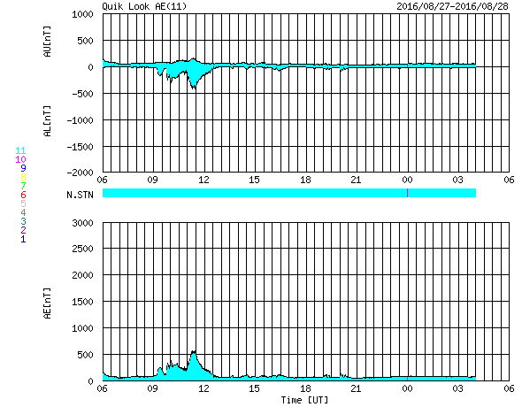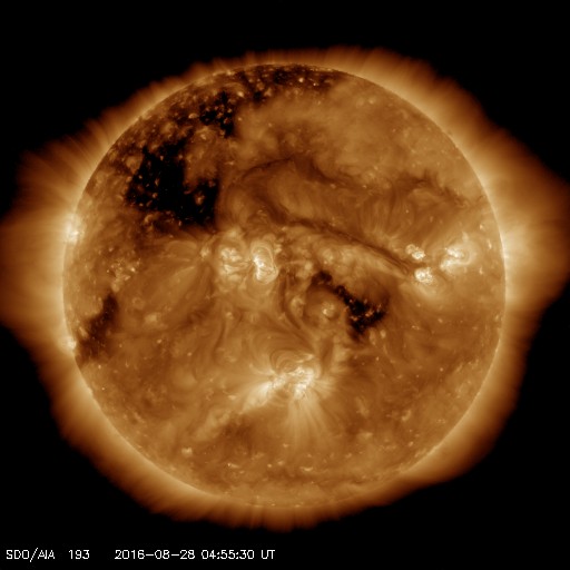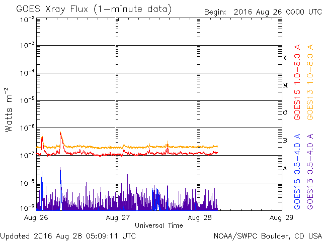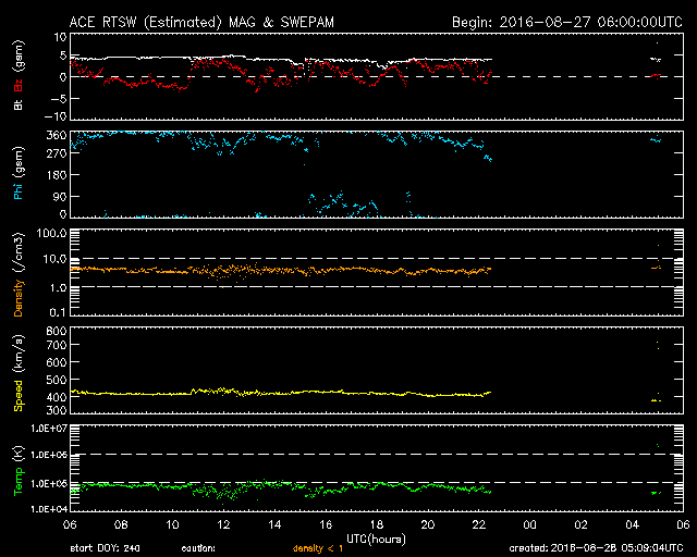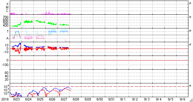 2016/ 8/28 14:09 更新 太陽風は平均的な状態です。明日くらいから速度が高まるかもしれません。 担当 篠原 太陽風は、速度は420km/秒、磁場強度は5nTと、 どちらも平均的な値で安定しています。 磁場の南北成分は、比較的北寄りになっていて、 オーロラの活動度を示すAE指数のグラフは、 500nTの変化も起きていますが、 全体としては静かな状態が続いています。 SDO衛星AIA193では、 中央部の南寄りに見えていたコロナホールは西に進み、 明日くらいから影響が始まりそうです。 一方、それに続く領域を見ると、 2581黒点群が発生したため、コロナホールは一旦途切れて、 東側で再び大きく広がっています。 27日前は、この部分全体にコロナホールが広がっていたため、 太陽風の高まりは長く続いたのですが、 今回は、2〜3日で一旦途切れて、 その後再び高まるという経過になるかもしれません。 太陽は、X線グラフに変化はなく、 とても穏やかです。 新しい黒点に、2582群と番号が付いています。