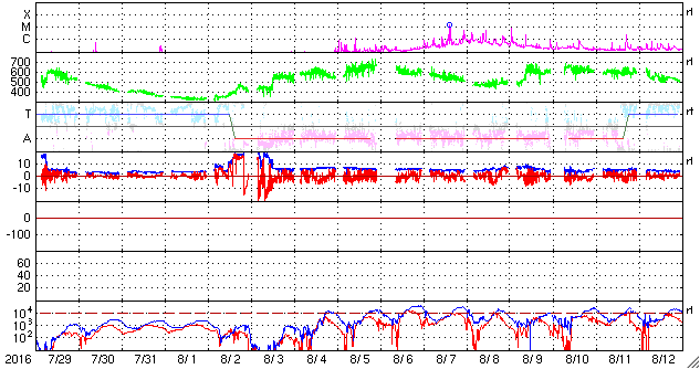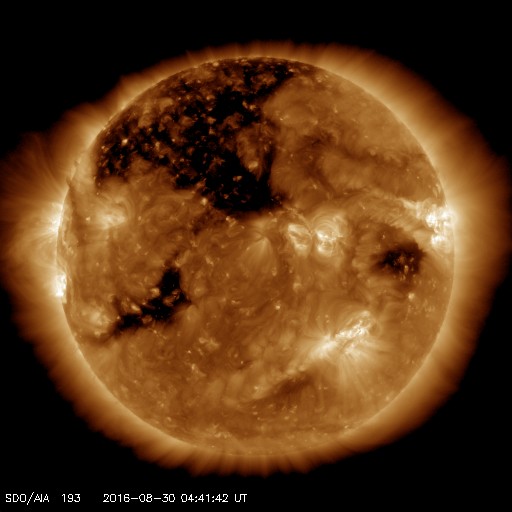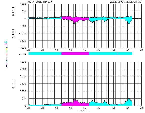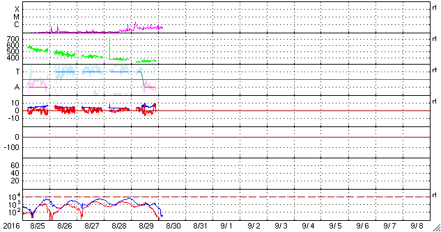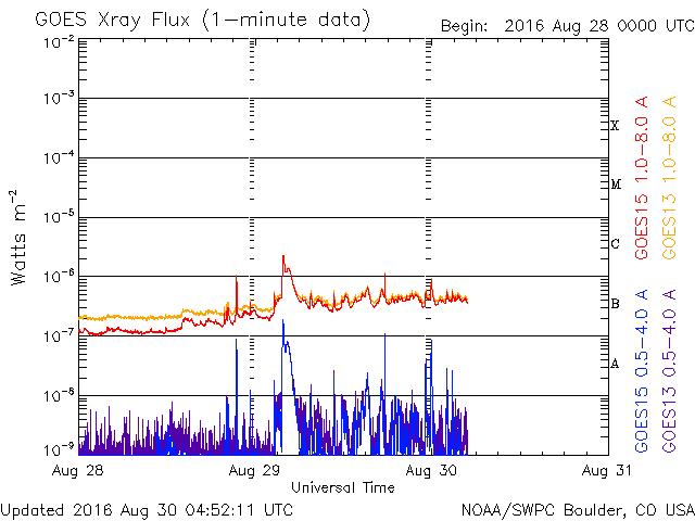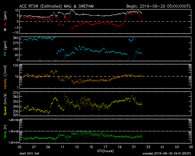 2016/ 8/30 13:52 更新 太陽風は低速風です。カナダのオーロラをどうぞ。 担当 篠原 高坂雄一さんより、 カナダ・イエローナイフで撮影された オーロラの写真をいただきました。 27日は、朝から曇りで、雨も降って、 見事な二重虹(5枚目の写真)も現れたそうですが、 晴れ間を探して西へ移動すると、 現地28日1時半(世界時28日7時半)頃から晴れ始めて、 見事なオーロラが空中に舞ったとのことです。 そのまま薄明まで、オーロラは消えることなく見えていたそうで、 いただいた写真の1枚目の全天カメラの空は真っ暗ですが、 3枚目は、薄明で空が明るくなりかけています。 オーロラの活動が長い時間続いていたことが分かります。 昨日のニュースのデータを見ると、 太陽風はやや低速でしたが、磁場が弱く南に振れ、 AE指数のグラフを世界時28日10時半から14時にかけて、 小規模の活動が発生しています。 イエローナイフでは、 もう少し早い時間からオーロラの輝きが現れていたのでしょう。 5枚目の二重虹の写真は、 緑のイエローナイフの景色も見ることができて、 興味深いです。 どうもありがとうございます。 太陽風は、350km/秒と低速の状態が続いています。 磁場強度は、昨夜くらいから変化が見られ、 今日の未明には、8nTと少し強まっています。 データが途切れているので、その後の変化は分かりませんが、 高速風の到来となっているのでしょうか。 AE指数は、小規模の活動が見られています。 最後に500nTの変化が発生していて、 太陽風に乱れが見え始めているのかもしれません。 太陽は、新しい黒点に2583群と番号が付きました。 C2.2、C1.3、C1.1と、小規模フレアを3回起こしています。 また、東の端に新しい黒点が現れています。 もうひとつ、続いて現れそうな領域もあります。 X線グラフは、全体の強度が少し上がり、 小さい変化が目立っています。 活動の規模は高まっていくでしょうか。