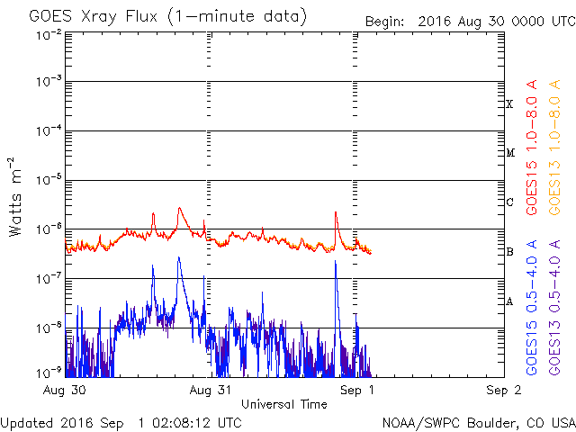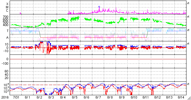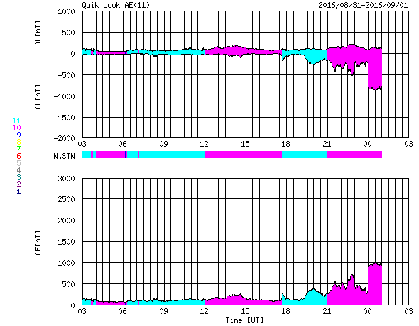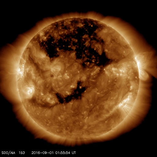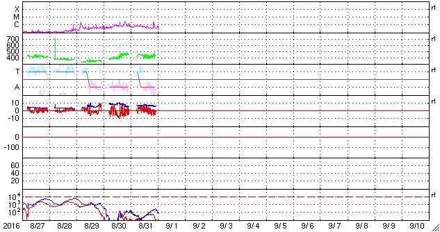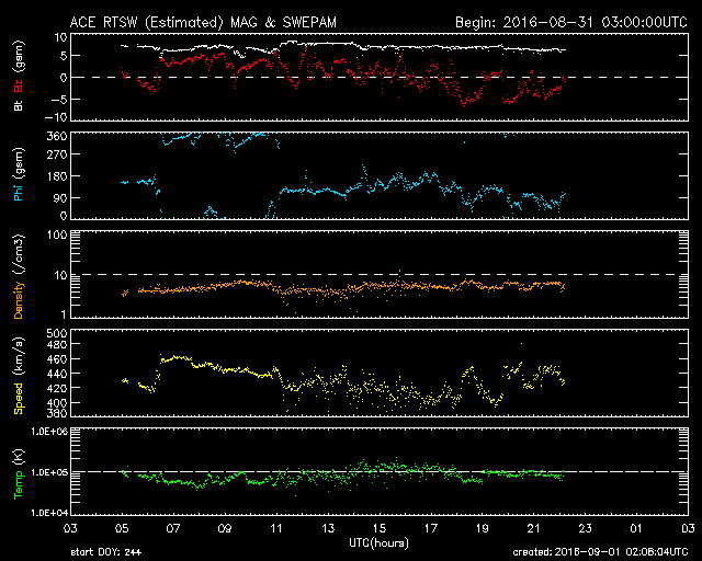 2016/ 9/ 1 11:08 更新 太陽風はやや強まった状態が続いています。今後、一段と高まりそうです。 担当 篠原 昨日、太陽の東端に現れた黒点は、 北は2585群、南は2584群と番号がつけられてました。 そして、今日も中央部に新しい黒点が現れています。 2585群は、全体が見えるようになっています。 昨日は、C1.1、C2.2と小規模フレアが2回起きた程度で、 それほど活発な様子は見られません。 太陽風は、速度は440km/秒、磁場強度は7nTと、 少し高まりが残ったまま推移しています。 磁場の南北成分は、北寄りから南寄りにゆっくりと変化しています。 このため、AE指数は前半は静かですが、 後半に300〜600nTの中規模の変化が発生しています。 SDO衛星AIA193の太陽写真を見ると、 北半球のコロナホールが西に進んで、 影響が及び始める目安の位置に達しつつあります。 これから、太陽風は再び高まりそうです。 27日周期の図を見ると、 前周期の太陽風の速度は、650km/秒に達しています。 今回も同じくらいの乱れが到来するかもしれません。 今日から9月4日にかけて、愛媛県新居浜市で 「高専スペースキャンプ」という高専生向けの研修会を行います。 初心者向けのモデルロケット、缶サットの製作講習会や、 各校で製作してきたモデルロケットの打ち上げ、 缶サットの投下実験などを行います。 鹿児島高専物理部チームは、 モデルロケット1機、缶サット3機を携えて、 新居浜に向かっているところです(そろそろ広島です)。 このため、日曜日にかけて更新時刻が不安定になります。 ![]() SDO衛星のAIA193カメラによる太陽コロナの様子 (c) SDO (NASA) ![]() SDO衛星による太陽の可視光写真。マウスの矢印を写真に重ねると、黒点番号付きの写真に切り替わります。 (c) SDO (NASA) ![]() GOES衛星の太陽X線データ (c) NOAA/SWPC ![]() ACEが観測した太陽風の磁場(1番上の枠、白線は全体の強度、赤線は南北成分) および、太陽風の密度(3番目の橙線)、速度(4番目の黄線) (c) NOAA/SWPC ![]() リアルタイムAE指数 下段のAEグラフの値が高くなると、オーロラ活動が活発化しています。 (c) 京都大学, NICT ![]() 27日の太陽周期に合わせたデータプロット 太陽が同じ面を地球に向けていた27日前の変化から、今後を予想することができます。 (c) 作図:宇宙天気ニュース