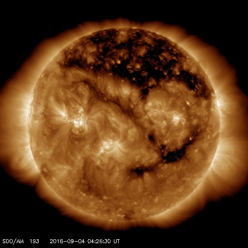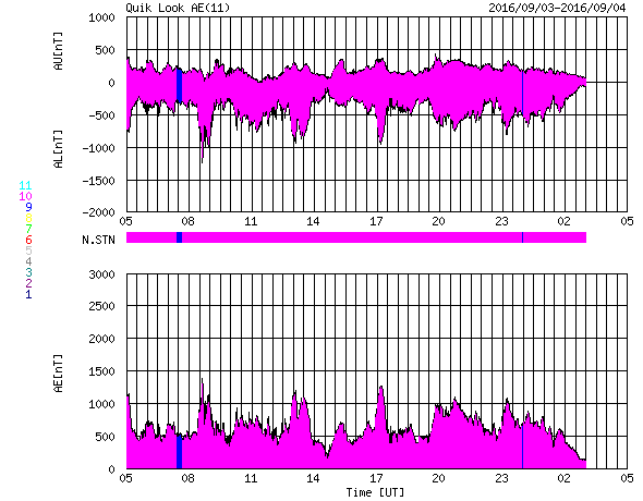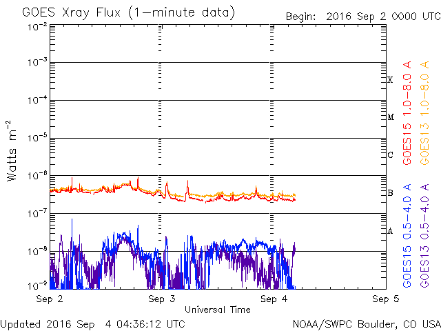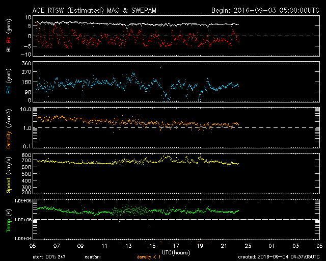 2016/ 9/ 4 14:00 更新 650km/秒と高速の太陽風は続いています。磁気圏の活動も活発です。 担当 篠原 太陽風の速度は、700km/秒から650km/秒へ、 少し下がる変化を見せていますが、 高い速度の風が続いています。 磁場強度は、6nTと平均的な状態で安定しています。 磁場の南北成分は、南寄りの傾向が続いています。 このため、磁気圏の活動は高まった状態が続いていて、 AE指数は、500〜1300nTと大きな変化が一日中続いています。 SDO衛星AIA193の太陽写真では、 コロナホールが東西に大きく広がっています。 太陽風の高まりは、このまま続きそうです。 太陽は、2585黒点群が目立っていますが、 X線グラフは、小さい変化が見られる程度で、 太陽は穏やかな状態です。 高専スペースキャンプは、無事に終了し、 新居浜から鹿児島へ帰路についたところです。 明日の午後には、通常の運用に戻れると思います。 ![]() SDO衛星のAIA193カメラによる太陽コロナの様子 (c) SDO (NASA) ![]() SDO衛星による太陽の可視光写真。マウスの矢印を写真に重ねると、黒点番号付きの写真に切り替わります。 (c) SDO (NASA) ![]() ACEが観測した太陽風の磁場(1番上の枠、白線は全体の強度、赤線は南北成分) および、太陽風の密度(3番目の橙線)、速度(4番目の黄線) (c) NOAA/SWPC ![]() リアルタイムAE指数 下段のAEグラフの値が高くなると、オーロラ活動が活発化しています。 (c) 京都大学, NICT ![]() GOES衛星の太陽X線データ (c) NOAA/SWPC ![]() | ||||||||||||||||||||||||||||||||||||||||||||||||||||||||