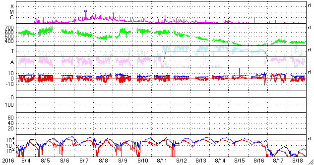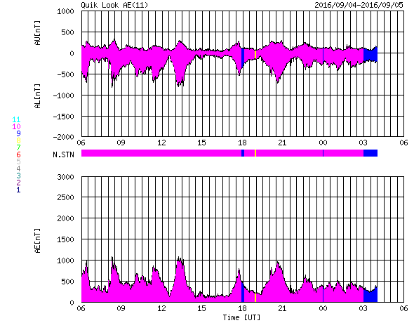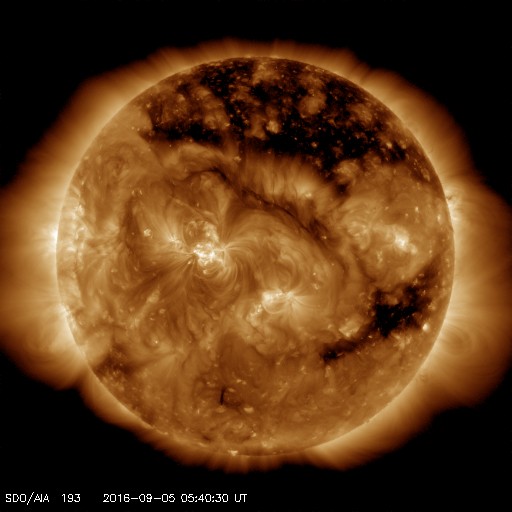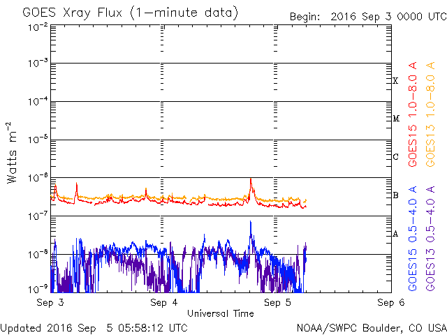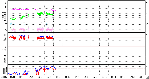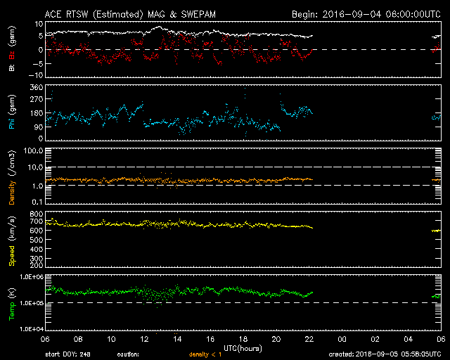 2016/ 9/ 5 14:59 更新 600km/秒台の高速太陽風が続いています。磁気圏の活動も高まっています。 担当 篠原 太陽風は、650km/秒の高い速度の風が続いています。 磁場強度は、5nTに少し下がっているようですが、 平均的な強さが続いています。 太陽風磁場の南北成分は、南北に変化をしています。 磁気圏の活動も活発な状態が続き、 オーロラの活動度を示すAE指数は、 500〜1000nTと中規模の変化が連続的に発生しています。 9月1〜2日頃から始まった高速の太陽風は、 4日目に入っています。 27日周期の図では、前周期の太陽風の高まりは、 8月13日まで続いていて、今回も同様とすると、 9日頃まで速度の高まりは続くかもしれません。 太陽は、中央部で2585黒点群が大きく目立っています。 Bクラスの小さいフレアが起きた程度で、活動は穏やかです。 放射線帯の高エネルギー電子が、かなり高まっています。 GOES15(青線)は、世界時9月2日に10,000を超え、 3日、4日は、100,000まで強まっています。 GOES13(赤線)も、30,000に達しています。 今日は鹿児島から更新しています。 台風の影響は既になく、晴れた暑い日になっています。 午後に高専のLANが回復して、ニュースも復帰しつつあります。 出張とも重なって、ご迷惑をおかけしました。 ![]() SDO衛星のAIA193カメラによる太陽コロナの様子 (c) SDO (NASA) ![]() SDO衛星による太陽の可視光写真。マウスの矢印を写真に重ねると、黒点番号付きの写真に切り替わります。 (c) SDO (NASA) ![]() ACEが観測した太陽風の磁場(1番上の枠、白線は全体の強度、赤線は南北成分) および、太陽風の密度(3番目の橙線)、速度(4番目の黄線) (c) NOAA/SWPC ![]() リアルタイムAE指数 下段のAEグラフの値が高くなると、オーロラ活動が活発化しています。 (c) 京都大学, NICT ![]() 27日の太陽周期に合わせたデータプロット 太陽が同じ面を地球に向けていた27日前の変化から、今後を予想することができます。 (c) 作図:宇宙天気ニュース