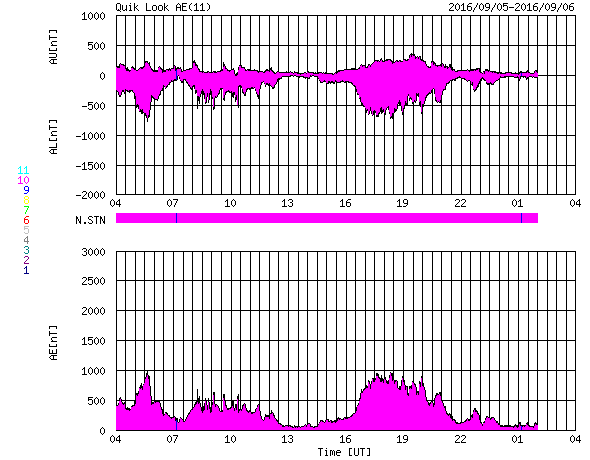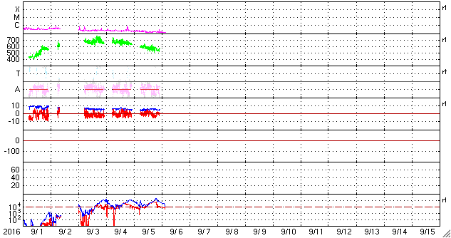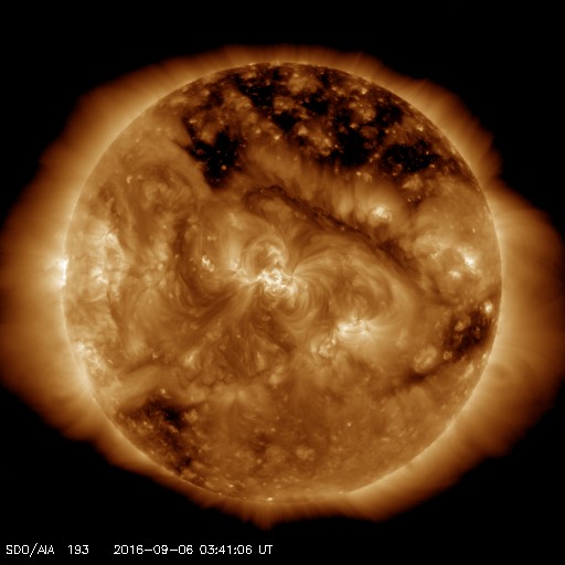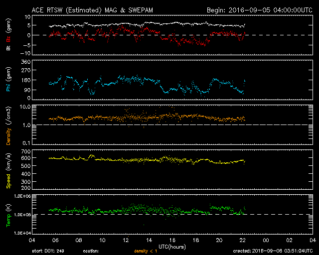 2016/ 9/ 6 12:51 更新 太陽風の速度は少し下がりましたが、高速の状態は続いています。 担当 篠原 太陽風の速度は、ゆっくりと低下して、 現在は550km/秒です。 高速の風は続いていますが、ピークは越えたようです。 太陽風の磁場強度は、5nTと平均的な値で安定しています。 南北成分は、南北両方に振れていて、 速度が高まっていることと重なって、 磁気圏の活動を高めています。 AE指数のグラフでは、 500〜900nTの中規模の変化が続いています。 ただ、太陽風の勢いが下がってきたことにより、 こちらの変化も次第に小さくなっているようです。 SDO衛星AIA193の太陽写真では、 コロナホールはさらに西に進み、 中心部は、北半球の高緯度側に残るだけになっています。 太陽風への影響は次第に弱くなっていくでしょう。 太陽は、中央に2585群が見えるだけで、 目立ったフレアの発生もなく、穏やかな状態です。 東端からやや活動的な領域が近づいているようで、 新しい黒点群が現れるでしょうか。 放射線帯の高エネルギー電子は、 GOES15(青線)は、100,000に達し、 GOES13(赤線)も、50,000まで増加しています。 ![]() SDO衛星のAIA193カメラによる太陽コロナの様子 (c) SDO (NASA) ![]() SDO衛星による太陽の可視光写真。マウスの矢印を写真に重ねると、黒点番号付きの写真に切り替わります。 (c) SDO (NASA) ![]() ACEが観測した太陽風の磁場(1番上の枠、白線は全体の強度、赤線は南北成分) および、太陽風の密度(3番目の橙線)、速度(4番目の黄線) (c) NOAA/SWPC ![]() リアルタイムAE指数 下段のAEグラフの値が高くなると、オーロラ活動が活発化しています。 (c) 京都大学, NICT ![]() 27日の太陽周期に合わせたデータプロット 太陽が同じ面を地球に向けていた27日前の変化から、今後を予想することができます。 (c) 作図:宇宙天気ニュース