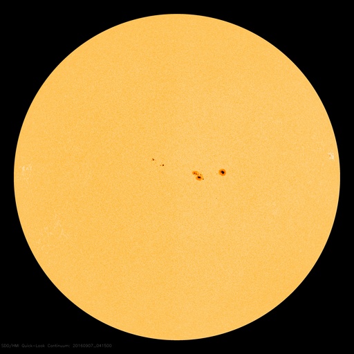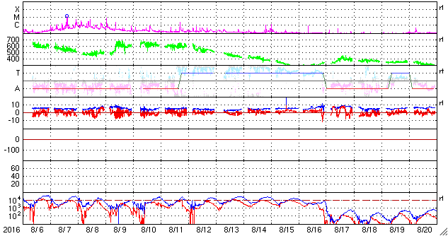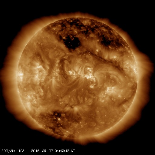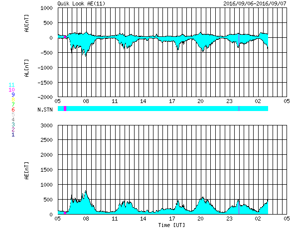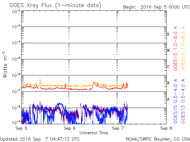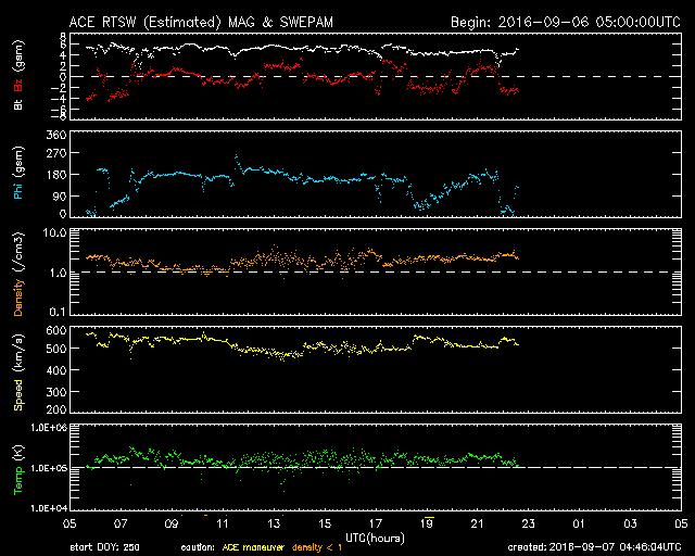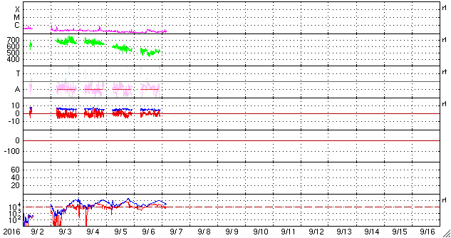 2016/ 9/ 7 13:47 更新 高速の太陽風は続いていますが、ゆっくりと弱まっています。 担当 篠原 太陽風の速度は、500km/秒近くに下がっています。 まだ、時々、550km/秒に上がる変化も見られますが、 高速太陽風は、次第に勢いを失っています。 磁場強度は、4〜5nT付近で推移しています。 変化がゆっくりなので目立ちませんが、 磁場強度もゆっくりと下がってきています。 磁場の南北成分は、南北両方に変化しています。 このため、磁気圏も活動的な状態が続いていて、 AE指数のグラフは、変化は次第に小規模になっていますが、 500nT前後の変化が繰り返し発生しています。 27日周期の図の前周期のように、 太陽風の高まりは、2〜3日程度で終わりを迎えそうです。 太陽は、2585群の左に、2588黒点群が出現しています。 フレアの発生は特になく、太陽は穏やかです。 放射線帯の高エネルギー電子は、高まった状態が続いていますが、 GOES15(青線)は、100,000の線を割っていて、 低下が始まっています。 太陽風が落ち着いてくると、ゆっくりと減少を続けます。
