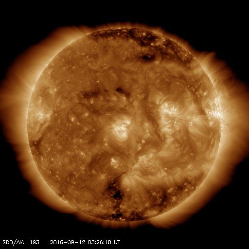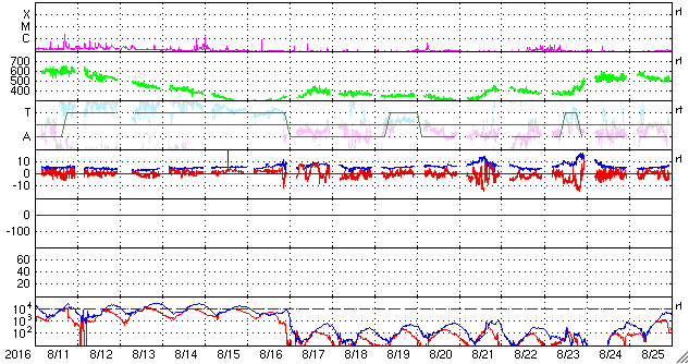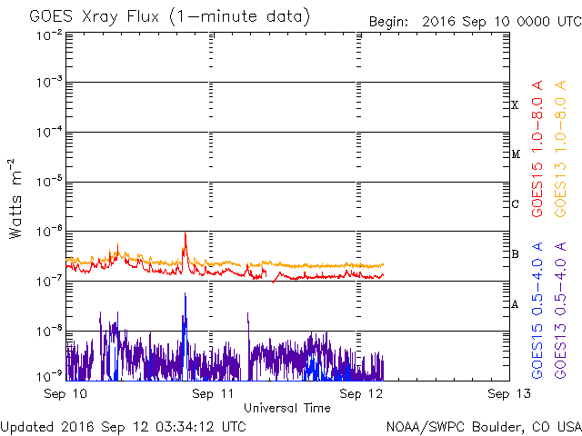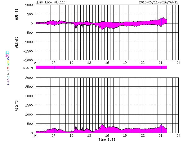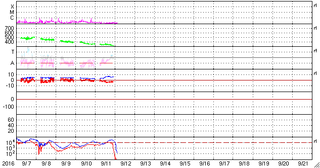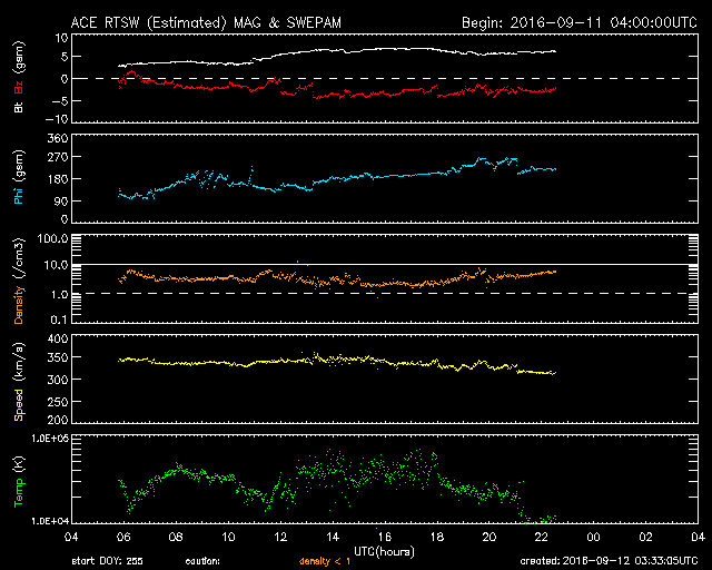 2016/ 9/12 12:32 更新 太陽風は低速ですが、磁場が南向きの状態が続いています。 担当 篠原 太陽風の速度は、350km/秒から320km/秒へ、 更に遅くなっています。 反対に、磁場強度は、3nTから6nTへ戻っていますが、 南北成分が南向きに振れ続けるようになっています。 南向きの変化は -3nT程度と振れ幅は小さく、 速度が下がっていることもあって、磁気圏への影響は限定的で、 AE指数は、300nTの小規模の変化が起きている程度です。 穏やかな太陽風はこの後も続きそうです。 太陽は、2585黒点群が西の端に近づき、 新しく現れた2591群も小さくなって、 可視光写真は全体的に寂しくなっています。 X線のグラフも変化が少なくなり、太陽は穏やかです。 放射線帯の高エネルギー電子は、 今日にかけて、GOES15、13ともに10,000の線に上がりましたが、 太陽風の影響を受けて、その後大きく減少しています (27日周期の図を参照)。