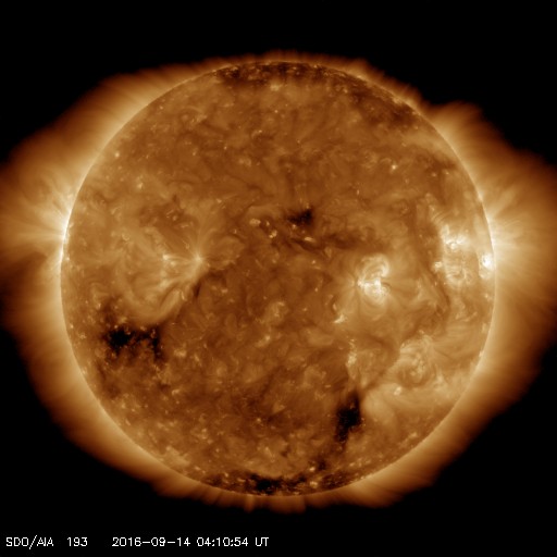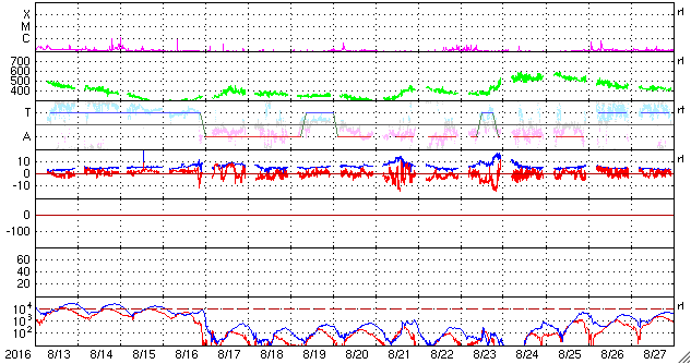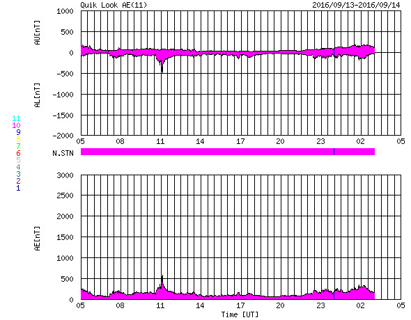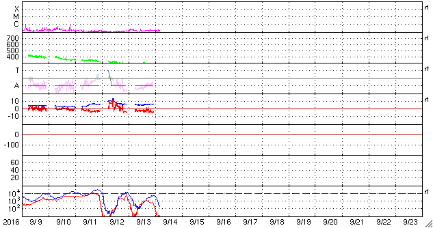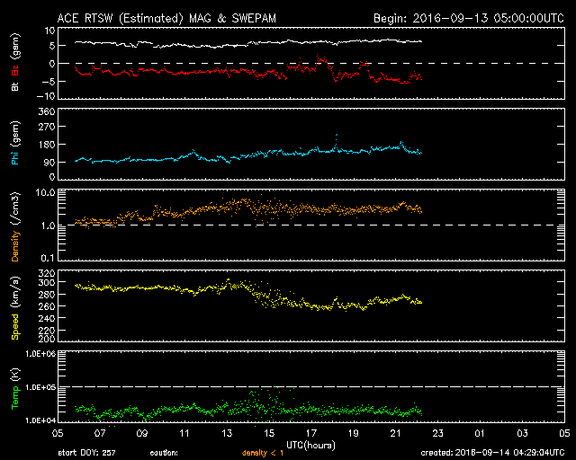 2016/ 9/14 13:29 更新 太陽風は270km/秒とかなり低速です。フィンランドのオーロラをどうぞ。 担当 篠原 谷口直樹さんより、続きのオーロラ写真をいただきました。 昨日の撮影地よりさらに北上して、サーリセルカ(1枚目)と、 国境を越えてノルウェー最北端のノールカップ近く(2枚目)の撮影です。 すると、2枚目に写っている水面は、北極海のようです。 この頃も、太陽風は強まっていて、オーロラの活動は活発で、 AE指数は頻繁に1000nTに達する変化をしていました。 現地では、緑が強烈で動きの激しいオーロラが観測できたとのことです。 谷口さんによると、その後は天候の悪化のため観測できず、 8日にヘルシンキを発ったところ、 途中のロシア、イルクーツク辺りで、 機内から強いオーロラを見ることができたそうです。 写真の左上に、北斗七星が写っています。 美しいオーロラだけでなく、旅情も含んだ素敵な写真です。 どうもありがとうございます。 現在の太陽風は、更に速度が低下して、 270km/秒まで下がっています。 27日周期の図では、速度の緑色の線が見えなくなっています。 磁場強度は、5nTと平均的な状態です。 太陽風磁場の南北成分は、弱い南向きになっています。 このため、AE指数は小さい変化が時々起きています。 太陽風は、引き続き穏やかな状態が続きそうです。 太陽は、2589群、2591群が小さく見えるだけです。 X線グラフも目立った変化はなく、静かな状態が続いています。