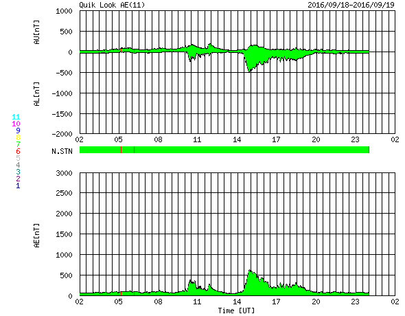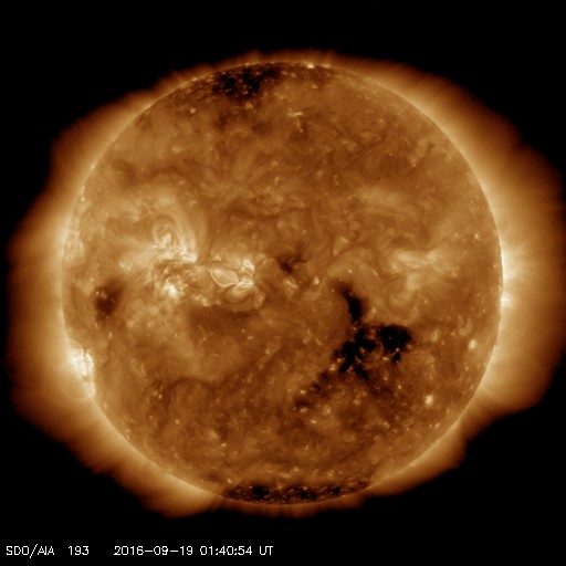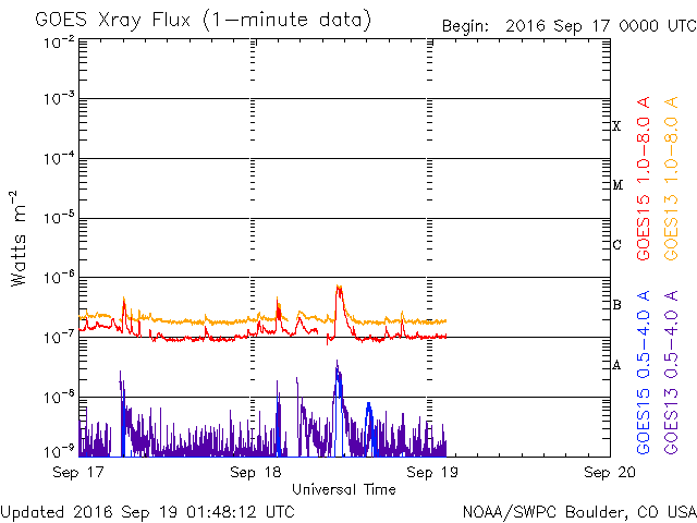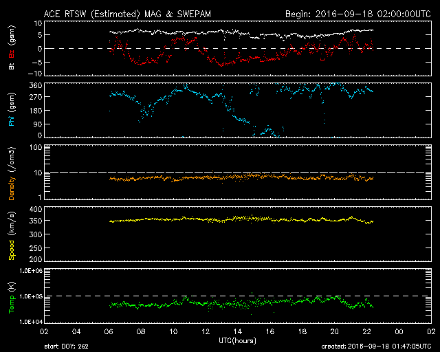 2016/ 9/19 10:48 更新 太陽風の速度は350km/秒に少し上がっています。コロナホールの影響が近付いています。 担当 篠原 太陽風の速度は、 昨日の午後に350km/秒に少し上がりました。 平均よりも遅い状態は続いています。 磁場強度は5nT付近で安定しています。 磁場の南北成分は、グラフの中盤は南寄り、 後半は0nT付近となっています。 AE指数の変化もこれと同様で、 中盤に300〜500nTの小中規模の変化があって、 後半は静かになっています。 SDO衛星AIA193では、コロナホールは更に西に進み、 影響の到来が近付いています。 今回はどの程度の太陽風の高まりがやって来るでしょうか。 太陽風磁場が強まり始めると、変化の始まりです。 太陽は、2592黒点群の右に、 2593群と2594群が現れています。 今後の変化に注目して下さい。 ![]() SDO衛星のAIA193カメラによる太陽コロナの様子 (c) SDO (NASA) ![]() SDO衛星による太陽の可視光写真。マウスの矢印を写真に重ねると、黒点番号付きの写真に切り替わります。 (c) SDO (NASA) ![]() ACEが観測した太陽風の磁場(1番上の枠、白線は全体の強度、赤線は南北成分) および、太陽風の密度(3番目の橙線)、速度(4番目の黄線) (c) NOAA/SWPC ![]() リアルタイムAE指数 下段のAEグラフの値が高くなると、オーロラ活動が活発化しています。 (c) 京都大学, NICT ![]() GOES衛星の太陽X線データ (c) NOAA/SWPC ![]() | ||||||||||||||||||||||||||||||||||||||||||||||||||||||||
