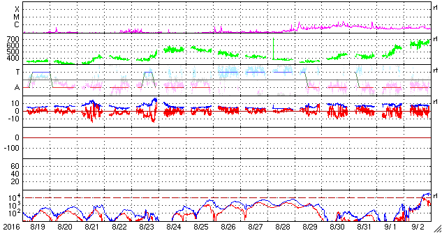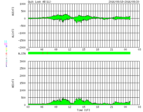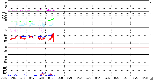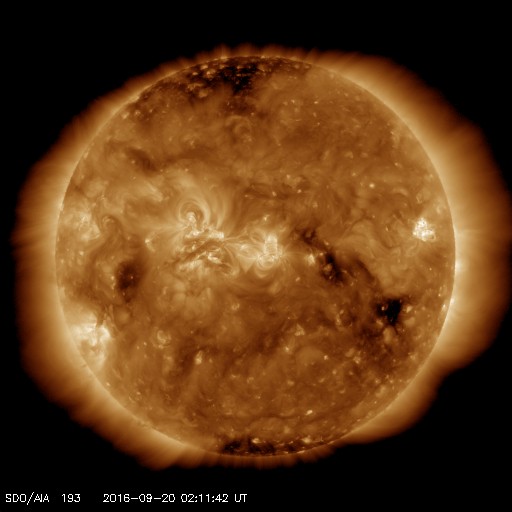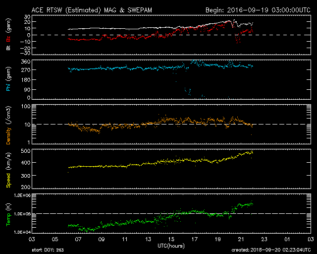 2016/ 9/20 11:24 更新 高速風が到来し、太陽風の速度は480km/秒に上がっています。 担当 篠原 昨日のニュースの後、太陽風の磁場強度は10nTに強まりました。 今日に入る頃からさらに高まって、 今朝早くには、20nTまで強まっています。 それに伴って、速度も上昇して、 今朝、20日7時(世界時19日22時)には480km/秒と、 高速風が始まっています。 太陽風のデータはそこで切れていて、 現在はもう一段高まっている可能性があります。 高速の太陽風は始まりましたが、 磁場の南北成分は、北寄りに強まっています。 このため、磁気圏への影響は限定的で、 AE指数のグラフは、 速度が高まる前は400nTの小規模の変化が起きていますが、 その後は、変化が目立たなくなっています。 前周期の太陽風の高まりは、3日程度続きました。 今回も同程度と考えると、 今後、太陽風磁場が南寄りに傾向が変われば、 オーロラの活動も高まっていくでしょう。 太陽は、西の端近くに2595黒点群が新しく発生しています。 X線のグラフは、Bクラスの小さい変化が起きている程度です。 9月に入って起きた、Cクラスに達するフレアは、 9月1日5時(世界時では8月31日20時)のC2.2だけです。 太陽は静かな状態が続いています。 ![]() SDO衛星のAIA193カメラによる太陽コロナの様子 (c) SDO (NASA) ![]() SDO衛星による太陽の可視光写真。マウスの矢印を写真に重ねると、黒点番号付きの写真に切り替わります。 (c) SDO (NASA) ![]() ACEが観測した太陽風の磁場(1番上の枠、白線は全体の強度、赤線は南北成分) および、太陽風の密度(3番目の橙線)、速度(4番目の黄線) (c) NOAA/SWPC ![]() リアルタイムAE指数 下段のAEグラフの値が高くなると、オーロラ活動が活発化しています。 (c) 京都大学, NICT ![]() 27日の太陽周期に合わせたデータプロット 太陽が同じ面を地球に向けていた27日前の変化から、今後を予想することができます。 (c) 作図:宇宙天気ニュース