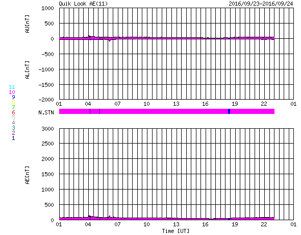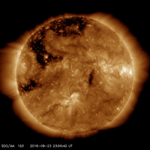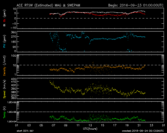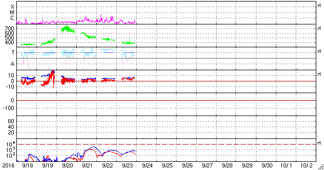 2016/ 9/24 09:11 更新 太陽風の速度はやや低速になっています。太陽は穏やかです。 担当 篠原 太陽風の速度は、昨日の午後に380km/秒まで下がり、 やや低速の風になっています。 磁場強度は、5nTと平均的な状態で安定しています。 磁場の南北成分は、ずっと北向きになっていて、 磁気圏はとても穏やかです。 AE指数は全く変化のないグラフになっています。 太陽風は、27日周期の図の前周期と同様に、 明日か明後日までは穏やかに推移しそうです。 その後、SDO衛星AIA193の太陽写真の中心部に見える、 小さいコロナホールの影響が、いくらか見られるかもしれません。 さらに、太陽の東側の南北に見えているコロナホールの影響が、 28〜29日くらいから始まりそうです。 前周期は、最高で700km/秒に達する高速の太陽風が、 一週間にわたって続きました。 今回はどのような高速風になるでしょうか。 太陽は、2595黒点群が沈んで、 X線グラフの変化は少なくなっています。 中央部の新しい黒点は、少し大きくなっていますが、 特に活動は見られません。