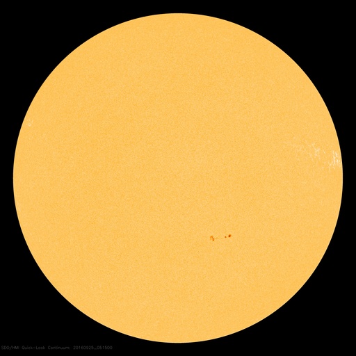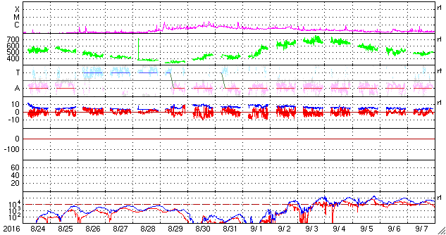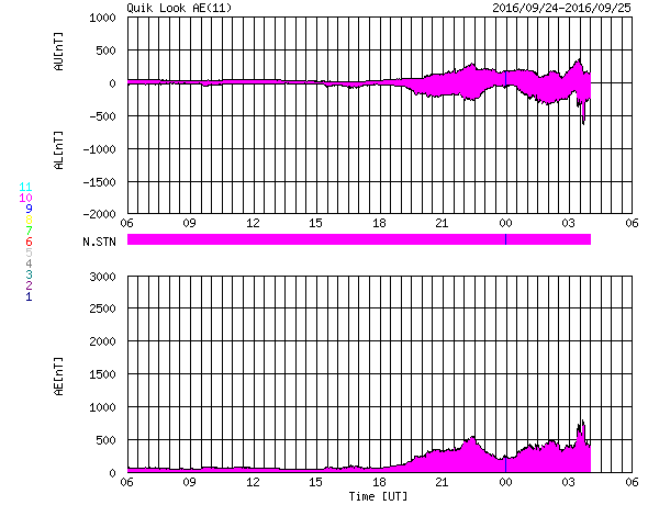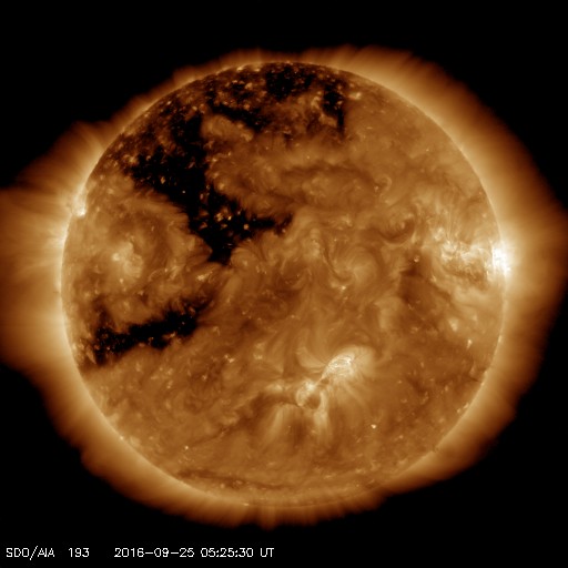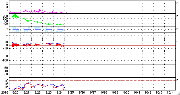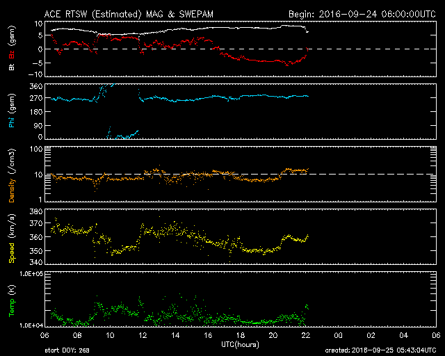 2016/ 9/25 14:41 更新 太陽風は350km/秒と低速です。磁場が南寄りになり、磁気圏の活動が少し高まっています。 担当 篠原 太陽風の速度は、350km/秒まで下がっています。 低速の状態が続いています。 磁場強度は、7〜8nTにやや強まっています。 南北成分は、グラフの初めは北向きでしたが、 中ほどから南向きに傾向が変わっています。 このため、オーロラの活動度を示すAE指数のグラフも、 前半は静かですが、後半になると、 500nT前後の活動が続いています。 太陽風磁場の南向きの変化は、どこまで続くでしょうか。 SDO衛星AIA193の太陽写真では、 東側(左側)の南北それぞれに、 コロナホールが広がっています。 先頭(右端)は、ちょうど太陽の中心線に達したところです。 これから、地球の方向に高速の太陽風が吹き始めるところです。 太陽は、新しい黒点に2697群と番号が付きました。 目立ったフレアの発生はなく、太陽は穏やかです。 ![]() SDO衛星のAIA193カメラによる太陽コロナの様子 (c) SDO (NASA) ![]() SDO衛星による太陽の可視光写真。マウスの矢印を写真に重ねると、黒点番号付きの写真に切り替わります。 (c) SDO (NASA) ![]() ACEが観測した太陽風の磁場(1番上の枠、白線は全体の強度、赤線は南北成分) および、太陽風の密度(3番目の橙線)、速度(4番目の黄線) (c) NOAA/SWPC ![]() リアルタイムAE指数 下段のAEグラフの値が高くなると、オーロラ活動が活発化しています。 (c) 京都大学, NICT ![]() 27日の太陽周期に合わせたデータプロット 太陽が同じ面を地球に向けていた27日前の変化から、今後を予想することができます。 (c) 作図:宇宙天気ニュース
