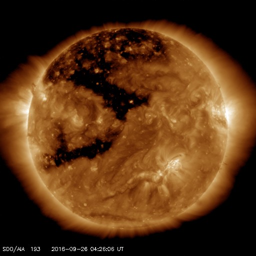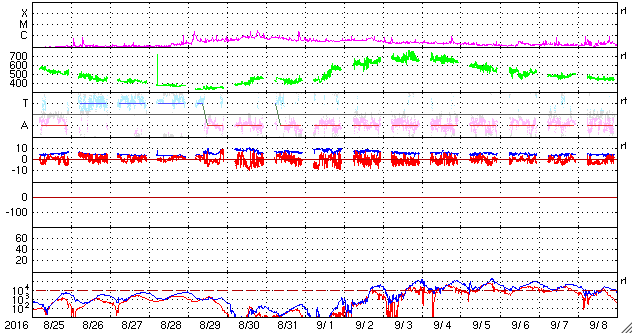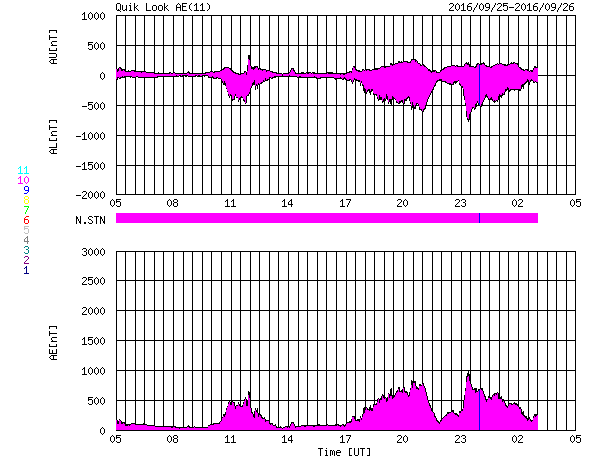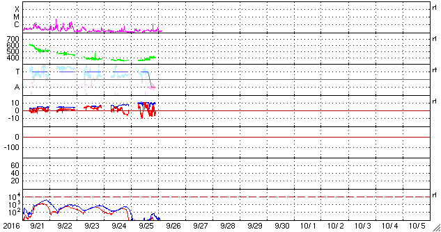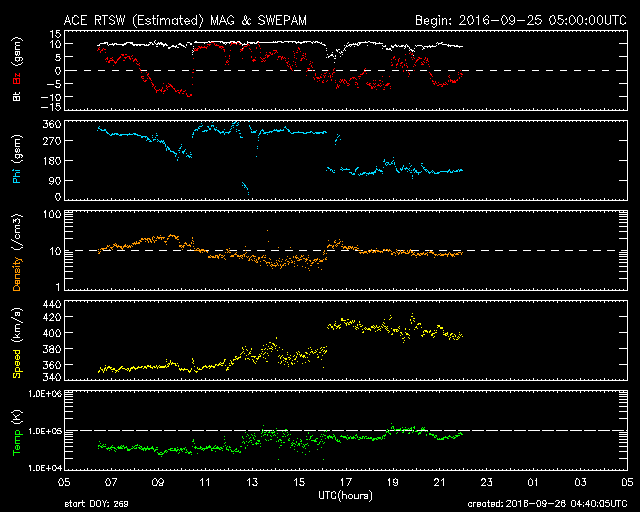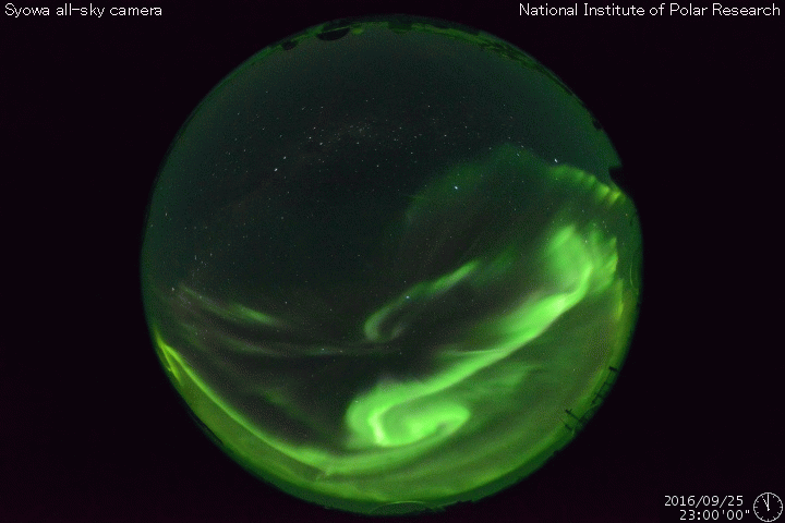 2016/ 9/26 13:38 更新 太陽風磁場が強まり、磁気圏の活動も高まっています。 担当 篠原 太陽風の磁場強度が、更に高まって、10nTに強まっています。 磁場の南北成分も、南北に大きく振れるようになり、 南を向いた時に、磁気圏の活動を強めています。 太陽風の速度も350km/秒から400km/秒に上がり、 平均的な速さに戻っています。 オーロラの活動度を示すAE指数のグラフは、 500〜1000nTの中規模の変化が、数時間おきに発生していて、 磁気圏は活動的になっています。 このうち、最後の高まりに当たる、 世界時25日23時頃の南極、昭和基地のオーロラの様子を 全天カメラの動画で紹介します。 27日周期の図を見ると、 前周期も今頃から太陽風の磁場強度が高まっていました。 同じ変化が回帰したようです。 SDO衛星AIA193では、 大きく広がったコロナホールが太陽の中心に進んでいます。 こちらの影響も、2〜3日後くらいから始まりそうです。 太陽は、2597黒点群でC1.3の小規模フレアが発生しています。 現在見えている黒点は、2597群だけのようです。 工事に伴うLANの停止期間が延長になり、 復帰は水曜日以降になるとの連絡がありました。 現在、最新情報の更新は維持していますが、 過去記事の閲覧やメールの送受信の再開については、 もうしばらくお待ち下さい。 ![]() 南極の昭和基地で、世界時25日23時頃に撮影されたオーロラ。 (c) 国立極地研究所、(動画加工 : 宇宙天気ニュース) ![]() SDO衛星のAIA193カメラによる太陽コロナの様子 (c) SDO (NASA) ![]() SDO衛星による太陽の可視光写真。マウスの矢印を写真に重ねると、黒点番号付きの写真に切り替わります。 (c) SDO (NASA) ![]() ACEが観測した太陽風の磁場(1番上の枠、白線は全体の強度、赤線は南北成分) および、太陽風の密度(3番目の橙線)、速度(4番目の黄線) (c) NOAA/SWPC ![]() リアルタイムAE指数 下段のAEグラフの値が高くなると、オーロラ活動が活発化しています。 (c) 京都大学, NICT ![]() 27日の太陽周期に合わせたデータプロット 太陽が同じ面を地球に向けていた27日前の変化から、今後を予想することができます。 (c) 作図:宇宙天気ニュース