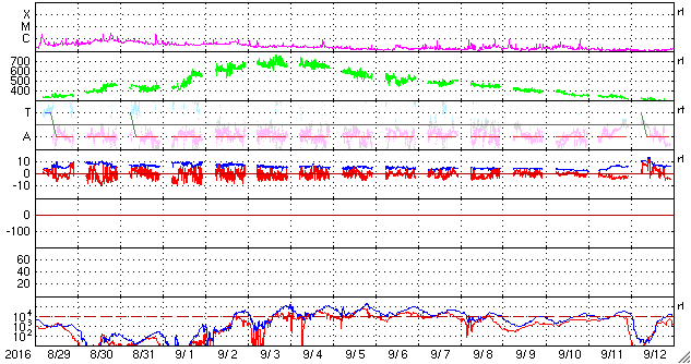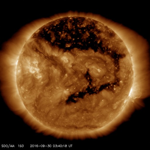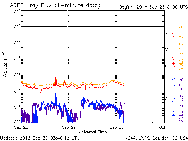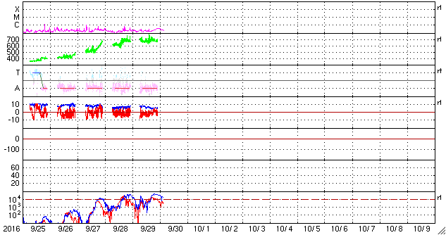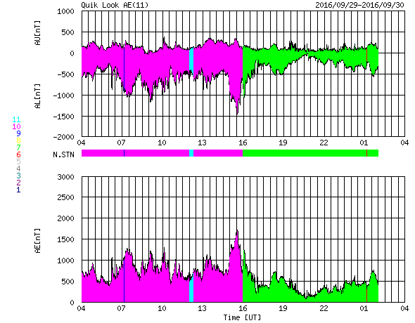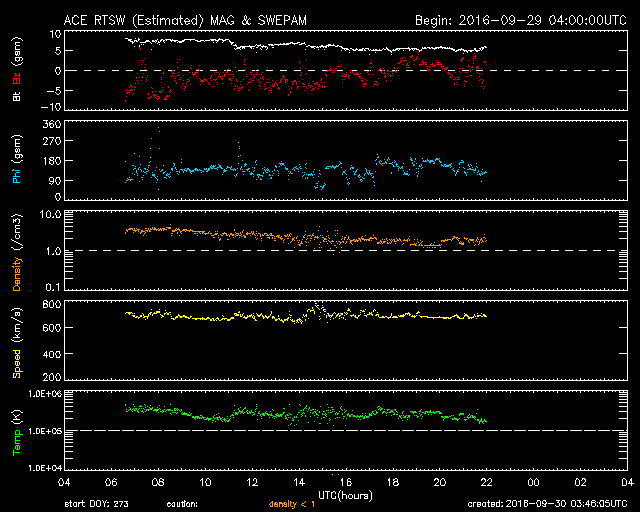 2016/ 9/30 12:46 更新 700km/秒近い高速の太陽風が続いています。アイスランドのオーロラをどうぞ。 担当 篠原 学校のネットワークが停止している間に、 高坂雄一さんより、 アイスランドで撮影されたオーロラの写真が届いていました。 撮影は、19日とのことで、10日遅れになってしまいましたが、 美しい写真をどうぞご覧下さい。 この頃は、太陽の南半球のコロナホールの影響で、 太陽風が強まっていました。 満月の直後でもあり、 地上の雄大な風景も写し込んだ見事な写真になっています。 どうもありがとうございます。 高坂さんからは、続いてフィンランドの写真もいただいています。 こちらも後ほど紹介します。 太陽風は、700km/秒近い高速の風が続いています。 磁場強度は、7nTから5nTに少し下がっていますが、 平均的な値を保っています。 磁場の南北成分は、 グラフの前半は南寄りの傾向が見られ、 後半は南北両方に振れるように変わっています。 速度がかなり高まっていることと重なって、 磁気圏の活動は活発で、 AE指数は、前半は1000〜1500nTの激しい変化が連続しています。 後半は、磁場の傾向が変わった影響を受けて、 500nT前後の中規模の変化にやや落ち着いています。 27日周期の図の前周期の変化を参考にすると、 高速太陽風は中盤を迎えているようです。 もう2日ほど経つと、速度はゆっくりと低下に向かいそうです。 太陽は、2597黒点群が西の端に沈みかけています。 その他に黒点は見られず、太陽は無黒点になるかもしれません。 放射線帯の高エネルギー電子は、 昨日と同程度の高い状態が続いています。 この週末で夏休みが終わり、月曜から後期の授業が始まります。 静かだった学校に、学生たちが戻って来ます。 10月は、高専ロボコン地方大会の開催(10年に1度の担当です)、 文化祭・体育祭と行事が続きます。 授業よりも、そちらの準備にエネルギーを吸い取られています・・・ ![]() アイスランドで現地9月19日に撮影されたオーロラ。 (c) 高坂雄一氏 ![]() アイスランドで現地9月19日に撮影されたオーロラ。 (c) 高坂雄一氏 ![]() アイスランドで現地9月19日に撮影されたオーロラ。 (c) 高坂雄一氏 ![]() SDO衛星のAIA193カメラによる太陽コロナの様子 (c) SDO (NASA) ![]() SDO衛星による太陽の可視光写真。マウスの矢印を写真に重ねると、黒点番号付きの写真に切り替わります。 (c) SDO (NASA) ![]() ACEが観測した太陽風の磁場(1番上の枠、白線は全体の強度、赤線は南北成分) および、太陽風の密度(3番目の橙線)、速度(4番目の黄線) (c) NOAA/SWPC ![]() リアルタイムAE指数 下段のAEグラフの値が高くなると、オーロラ活動が活発化しています。 (c) 京都大学, NICT ![]() 27日の太陽周期に合わせたデータプロット 太陽が同じ面を地球に向けていた27日前の変化から、今後を予想することができます。 (c) 作図:宇宙天気ニュース