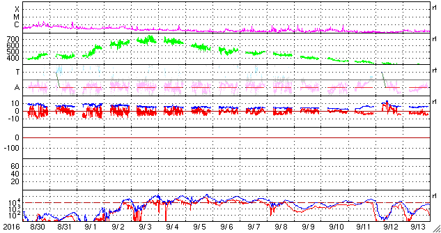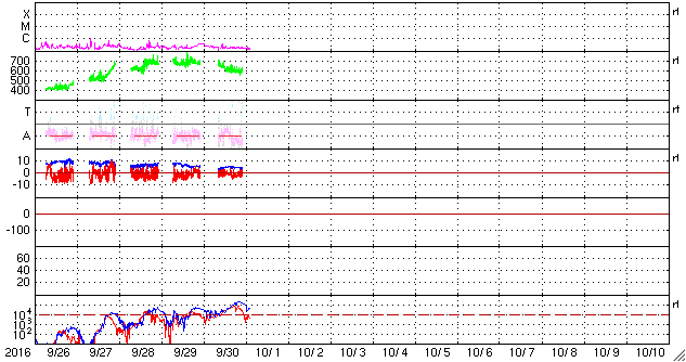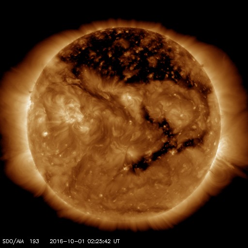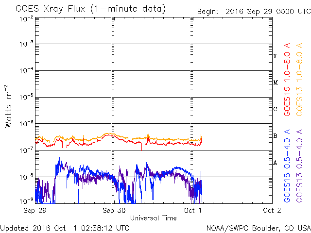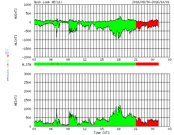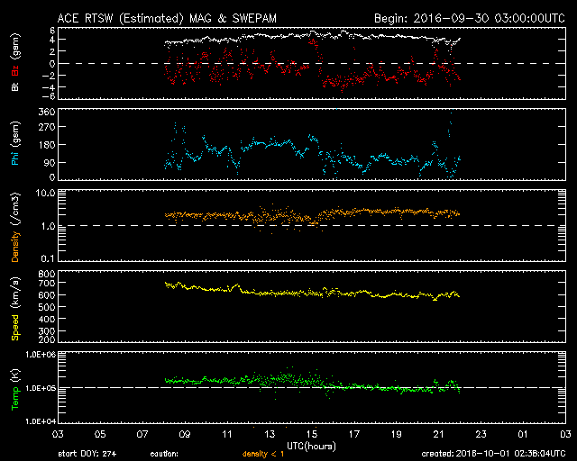 2016/10/ 1 11:38 更新 太陽風の速度は600km/秒に少し下がりましたが、高速風は続いています。 担当 篠原 太陽風の速度は、700km/秒から600km/秒へ一段低下しています。 高い速度は続いていますが、27日周期の図の前周期同様に、 高速風領域のピークは越えたのかもしれません。 一方、SDO衛星AIA193の太陽写真を見ると、 北半球のコロナホールは、中高緯度域にですが、 太陽の東端まで大きく広がっています。 太陽風が高まった状態は、当分続きそうです。 太陽風の磁場強度は、4nTくらいに少し下がっています。 南北成分は、南寄りの傾向になっていて、 磁気圏の活動も高まった状態が続いています。 オーロラの活動度を示すAE指数のグラフは、 500〜1000nTの中規模の変化が、頻繁に発生しています。 太陽は、2597黒点群が沈んで、 黒点の見えない状態になっています。 X線のグラフも変化がなく、太陽は穏やかです。 放射線帯の高エネルギー電子は、今日にかけて更に上昇し、 GOES15(青線)は、100,000を超えています。 GOES13(赤線)も、10,000を大きく超えています。 ![]() SDO衛星のAIA193カメラによる太陽コロナの様子 (c) SDO (NASA) ![]() SDO衛星による太陽の可視光写真。マウスの矢印を写真に重ねると、黒点番号付きの写真に切り替わります。 (c) SDO (NASA) ![]() ACEが観測した太陽風の磁場(1番上の枠、白線は全体の強度、赤線は南北成分) および、太陽風の密度(3番目の橙線)、速度(4番目の黄線) (c) NOAA/SWPC ![]() リアルタイムAE指数 下段のAEグラフの値が高くなると、オーロラ活動が活発化しています。 (c) 京都大学, NICT ![]() 27日の太陽周期に合わせたデータプロット 太陽が同じ面を地球に向けていた27日前の変化から、今後を予想することができます。 (c) 作図:宇宙天気ニュース