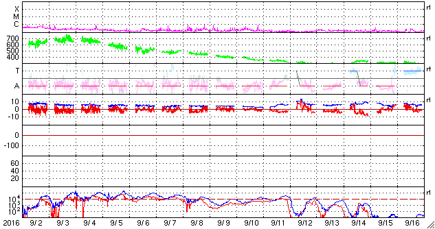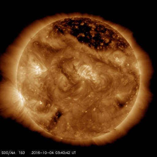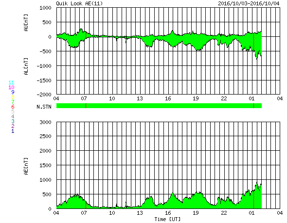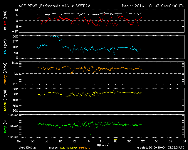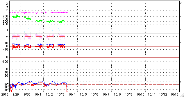 2016/10/ 4 12:58 更新 500km/秒台前半の高速太陽風が続いています。フィンランドのオーロラをどうぞ。 担当 篠原 先週の金曜日に続いて、 高坂さんよりいただいていたオーロラの写真を紹介します。 今日掲載しているのは、フィンランドのオーロラです。 9月24日にフィンランドに入り、1000km移動してラップランドに行き、 ロバニエミ北西の湖 Raanujärvi Lake での撮影です。 現地25日21時半頃に、少しの間雲が途切れて、 鮮やかなオーロラが現れたそうです。 この頃の太陽風は、速度は平均的な状態でしたが、 磁場が10nTに強まり、南向きの変化が発生して、 AE指数に800nT程度の中規模の変化が起きていました。 26日の宇宙天気ニュースでは、 同じ頃の昭和基地のオーロラの動画を掲載しています。 高坂さんによると、その後は曇ってしまい、 途切れたところからオーロラは見えていたそうです。 時間帯としては、昭和基地の動画のオーロラは、 こちらに対応するようです。 雲越しのオーロラの輝きですが、 手前の木々とともに、立体感を演出しているように感じます。 掲載が遅くなってしまいましたが、 どうもありがとうございます。 現在の太陽風の速度は、 500〜550km/秒の範囲を推移していて、 高速の状態は続いています。 磁場強度も、5nTで安定しています。 磁場の南北成分は、小さく南北に変化しています。 磁気圏の活動もある程度高めていて、 AE指数は、500nT前後の活動が頻繁に発生しています。 27日周期の図の前周期を見ると、 この後、2日くらいで高速太陽風は終わっています。 SDO衛星AIA193のコロナホールの広がり方が 27日前と同様なので、高速風も同様に終わりに向かいそうです。 太陽は、昨日、東端に見えかけていた黒点が姿を現し、 2599黒点群となっています。 2598群とともに、小さい活動は頻繁に起きているようです。