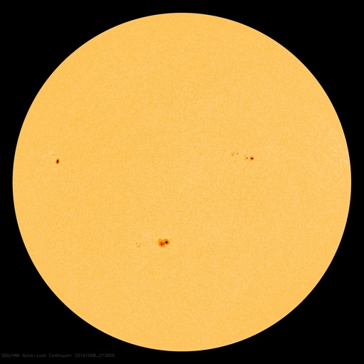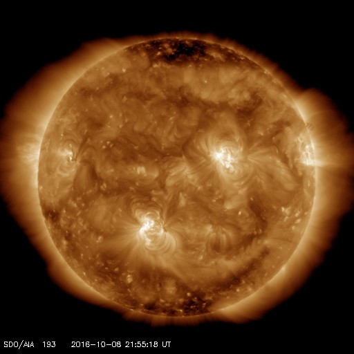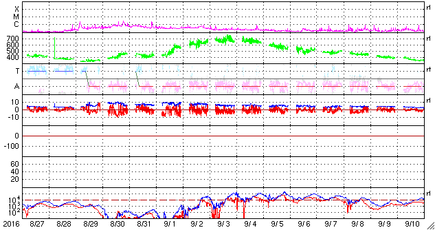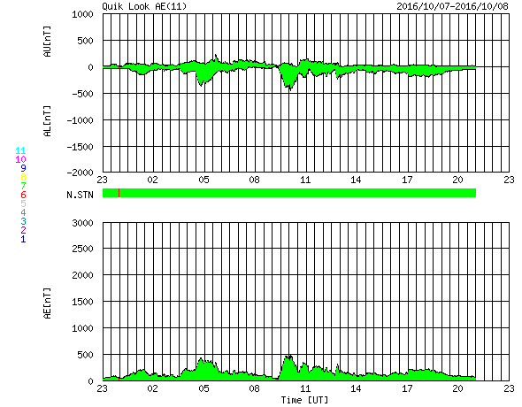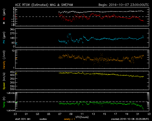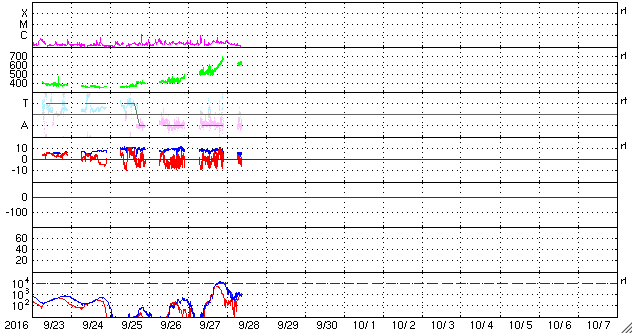 2016/10/ 9 07:05 更新 太陽風は低速風に変わりかけています。太陽は穏やかです。 担当 篠原 太陽風の速度は、430km/秒から370km/秒へゆっくり下がり、 低速の風に変わりつつあります。 磁場強度は、4〜5nTと平均的な状態です。 磁場の南北成分は、0nT付近で小さく南北に変化しています。 このため、小規模ながら磁気圏への影響は見られ、 AE指数は、200〜400nT程度の小規模の変化が続いています。 SDO衛星AIA193の太陽写真では、 低緯度域にコロナホールは見られません。 このため、太陽風はこれから更に低速になり、 磁気圏も穏やかな状態が続きそうです。 27日周期の図の前周期を参考にすると、 次の太陽風の高まりは、10月17日と、 1週間ほど先になりそうです。 太陽は、3つの黒点群が見えていますが、 目立った活動はなく、静かな状態が続いています。 いよいよ今日は高専ロボコンの本番です。 残念なことに夜から雨が降り始め、夕方まで続きそうな予報です。 昨日の試走では、素晴らしいロボットがいくつも登場して、 今日の大会がとても楽しみです。 今日は、学校の工事による停電があり、 夜まで最新データの更新はできなくなります。 今回は1日だけの予定です。
