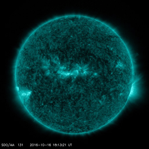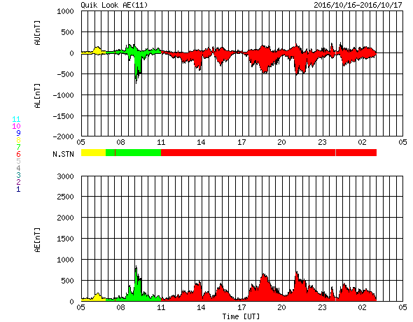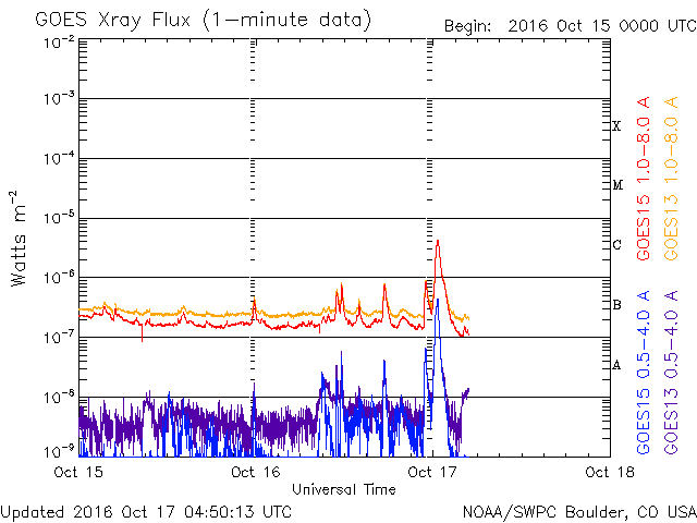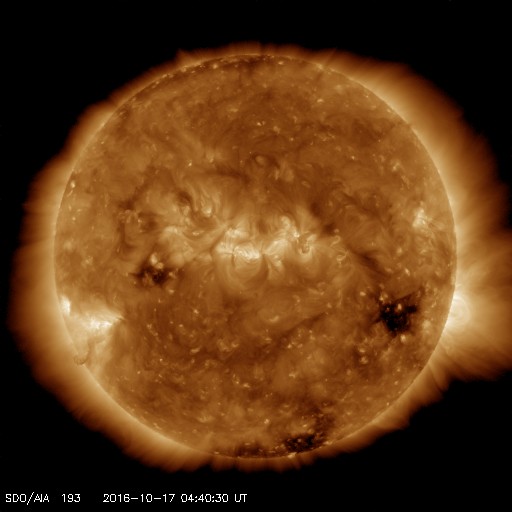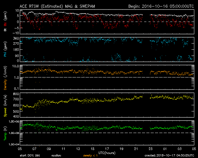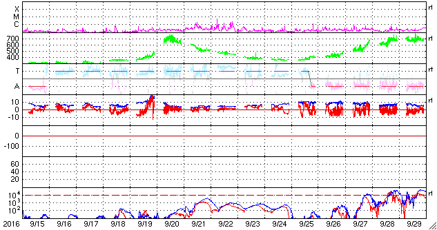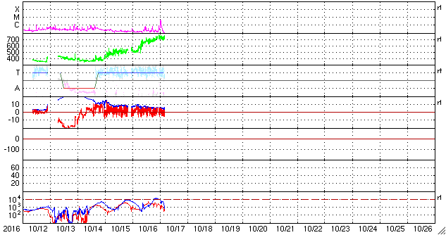 2016/10/17 13:50 更新 太陽風の速度は700km/秒台に高まっています。C4のフレアが発生しました。 担当 篠原 太陽風の速度は、昨日から今朝にかけて一段と上昇し、 17日6時(世界時16日21時)頃に、700km/秒に達しました。 現在も700〜730k/秒とかなり高まった状態です。 一方、太陽風の磁場強度は、 10nT近かった状態から次第に下がり、 現在は5nTと平均的な強度に戻っています。 太陽風磁場の南北成分は、 ACE衛星の図の前半は北寄りですが、 後半は0nTを挟んで南北に変化するように、 傾向がやや変化しています。 磁気圏では、中規模の活動が発生していて、 AE指数は、300〜700nTの変化が繰り返し発生しています。 SDO衛星AIA193の太陽写真では、 コロナホールは西の端に次第に近づき、 高速太陽風は、これから後半に入っていくでしょう。 太陽では、西に沈んでいった2599黒点群で、 今朝、17日9時(世界時17日0時)に、 C4.2の小規模フレアが発生しています。 SDO衛星AIA131による動画を掲載します。 2599群は、こちらからは見えなくなっているので、 フレアの実際の規模は、 もう一段大きかった可能性があります。 こちらから見えている、2600群、2602群は穏やかです。 高速太陽風の影響を受けて、 放射線帯の高エネルギー電子は、 GOES15(青線)で、10,000に高まっています。