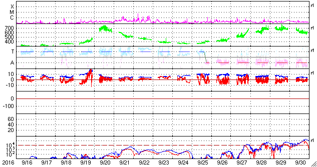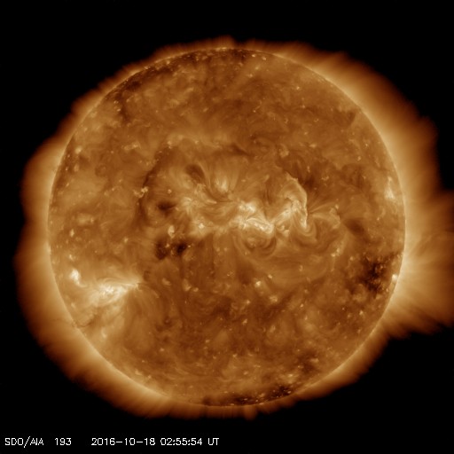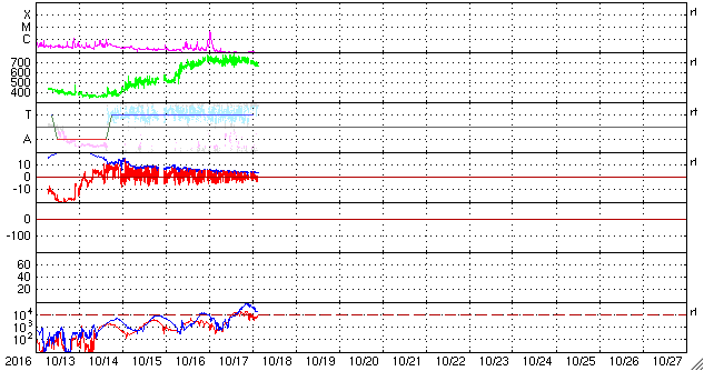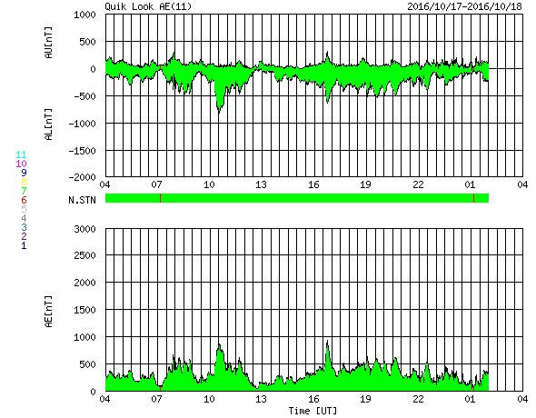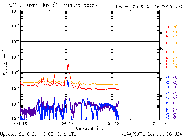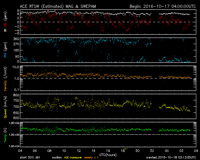 2016/10/18 12:14 更新 太陽風は670km/秒と高速の状態が続いています。 担当 篠原 太陽風の速度は、今朝まで700km/秒台を保ち、 その後少し下がりましたが、 現在も670km/秒と高速の状態が続いています。 磁場強度は、5nTから4nTへ少し下がっています。 磁場の南北成分は、 0nTを挟んで、南北に細かく変化しています。 このため、磁気圏の活動も高まった状態が続き、 オーロラの活動度を示すAE指数のグラフは、 500nT前後の中規模の活動が連続的に発生しています。 まだ満月を過ぎたばかりで、夜空は明るいようですが、 極域では活発なオーロラの活動を 見ることができたのではないでしょうか。 一方、太陽風の磁場強度と速度が少し下がったことから、 高速風の領域は後半に入ったようです。 27日周期の図で、前周期の太陽風のグラフを見ると、 ちょうど27日前の9月21日に速度が下がり始めています。 今回の高速風は、始まりは2日ほど早くなりましたが、 終わりは前回と似た様な推移をするのかもしれません。 太陽は、2599黒点群が完全に見えなくなった後、 X線グラフの変化はほとんどなくなり、 とても穏やかになっています。 放射線帯の高エネルギー電子は、 GOES15(青線)に続いて、 GOES13(赤線)も10,000を超えています。 明日にかけて、更に高まるでしょうか。