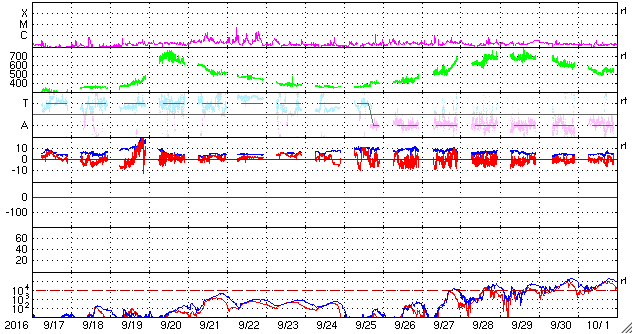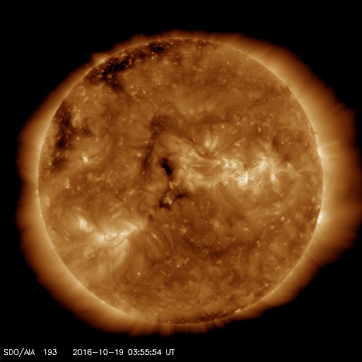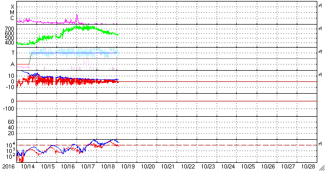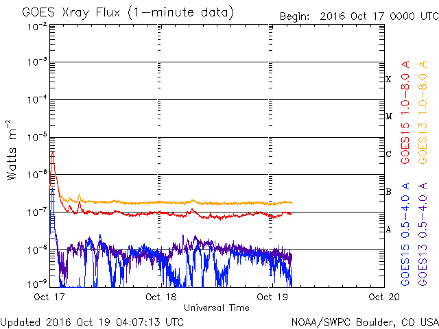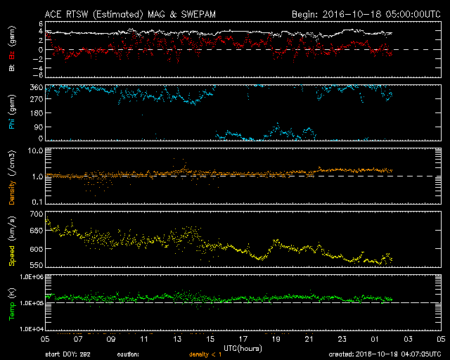 2016/10/19 13:07 更新 高速太陽風は続いていますが、速度は下がり始めています。 担当 篠原 太陽風の速度は、ゆっくりと低下が続いて、 560km/秒まで下がりましたが、 現在も高速の状態を保っています。 27日周期の図を見ると、 前周期の太陽風速度の下がり方と似た変化になっていますが、 速さとしては、少し高めに推移しています。 このため、明日か明後日まで高速の風が続くかもしれません。 太陽風の磁場強度は、3〜4nTに下がっています。 南北成分は、0nT付近か、やや北寄りで、 磁気圏への影響は弱くなっています。 AE指数のグラフは、 200nT前後の小さい変化が見られる程度になっています。 SDO衛星AIA193の太陽写真では、 太陽の中央部に広いコロナホールは見られず、 この後、太陽風は穏やかな風になりそうです。 一方、東端に顔を出しているコロナホールは、 前周期に、およそ10日にわたって 高速風をもたらした領域の先頭です。 27日周期の図を参考にすると、 10月24日頃から速度が高まりそうです。 太陽では、東側(左側)にとても小さい黒点が 新しく現れているようです。 X線グラフはほとんど辺がなく、太陽はとても静かです。 高速太陽風の影響を受けて、 放射線帯の高エネルギー電子は、更に増加しています。 太陽風の速度は下がり始めているので、 こちらの変化もこの辺りまででしょう。