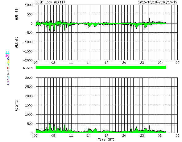 (c) SDO (NASA) ![]() SDO衛星による太陽の可視光写真。マウスの矢印を写真に重ねると、黒点番号付きの写真に切り替わります。 (c) SDO (NASA) ![]() ACEが観測した太陽風の磁場(1番上の枠、白線は全体の強度、赤線は南北成分) および、太陽風の密度(3番目の橙線)、速度(4番目の黄線) (c) NOAA/SWPC ![]() リアルタイムAE指数 下段のAEグラフの値が高くなると、オーロラ活動が活発化しています。 (c) 京都大学, NICT ![]() 27日の太陽周期に合わせたデータプロット 太陽が同じ面を地球に向けていた27日前の変化から、今後を予想することができます。 (c) 作図:宇宙天気ニュース