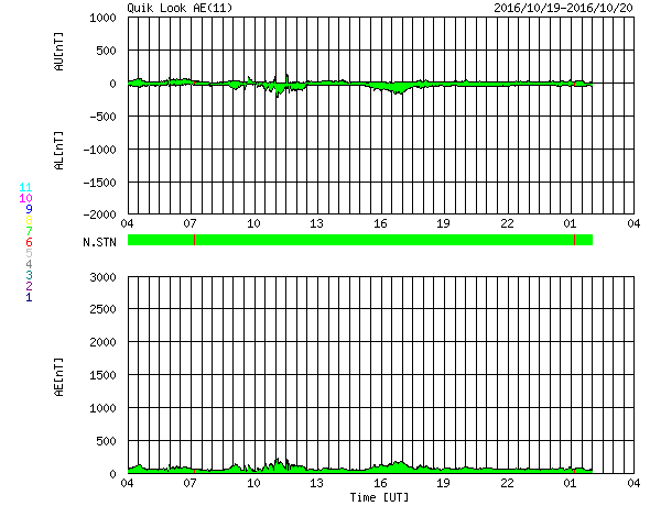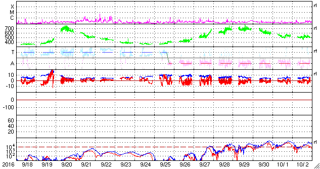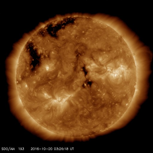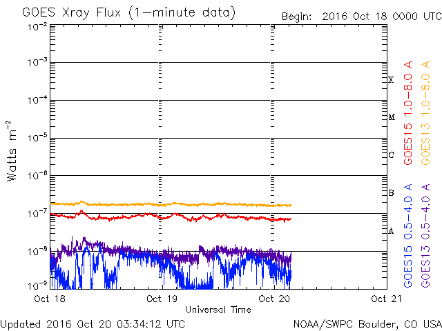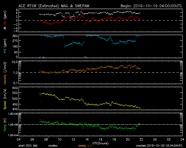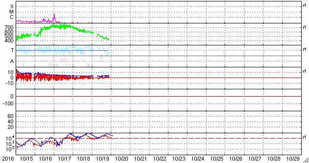 2016/10/20 12:32 更新 太陽風は平均的な速度に戻りました。磁気圏は穏やかです。 担当 篠原 太陽風の速度は、昨夜のうちに450km/秒へ下がり、 その後、今朝にかけて420km/秒へ下がっています。 高速太陽風は終わって、平均的な速さに戻っています。 磁場強度は、4nT付近で安定しています。 南北成分は、0nT付近で小さく変化する程度で、 磁気圏の活動は更に弱まり、 AE指数のグラフは特に変化が見られない状況です。 SDO衛星AIA193の太陽写真では、 中央部は小さいコロナホールが見える程度で、 太陽風はしばらく穏やかになりそうです。 その後、東端(左端)に姿を現している領域の影響を受けて、 高速の太陽風が始まると予想されます。 前周期の変化を参考にすると、10月24日頃になりそうです。 太陽は、昨日東側に新しく現れた黒点に、 2603群と番号が付きましたが、 現在の写真ではほとんど見えなくなっています。 フレアの発生は特になく、太陽はとても穏やかです。 放射線帯の高エネルギー電子は、 高まった状態が続いていますが、 増加は終わり、これからゆっくりと減少に向かいそうです。 次の土曜、日曜は、鹿児島高専祭として、 文化祭、体育祭が行われます。 明日はリハーサルと会場設営です。 この3日間は、記事更新の時刻が大きくずれる可能性があります。 ご了解下さい。 ![]() SDO衛星のAIA193カメラによる太陽コロナの様子 (c) SDO (NASA) ![]() SDO衛星による太陽の可視光写真。マウスの矢印を写真に重ねると、黒点番号付きの写真に切り替わります。 (c) SDO (NASA) ![]() ACEが観測した太陽風の磁場(1番上の枠、白線は全体の強度、赤線は南北成分) および、太陽風の密度(3番目の橙線)、速度(4番目の黄線) (c) NOAA/SWPC ![]() リアルタイムAE指数 下段のAEグラフの値が高くなると、オーロラ活動が活発化しています。 (c) 京都大学, NICT ![]() 27日の太陽周期に合わせたデータプロット 太陽が同じ面を地球に向けていた27日前の変化から、今後を予想することができます。 (c) 作図:宇宙天気ニュース