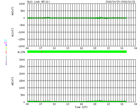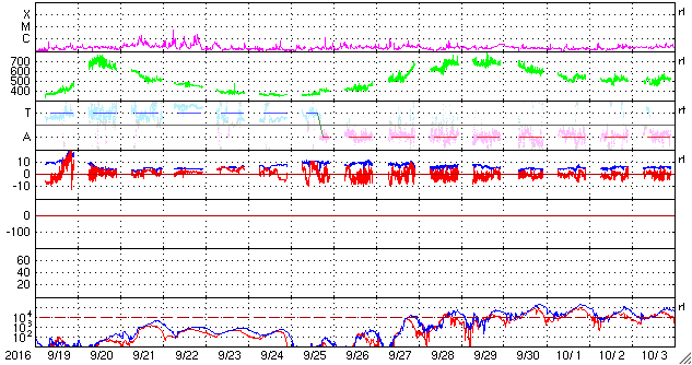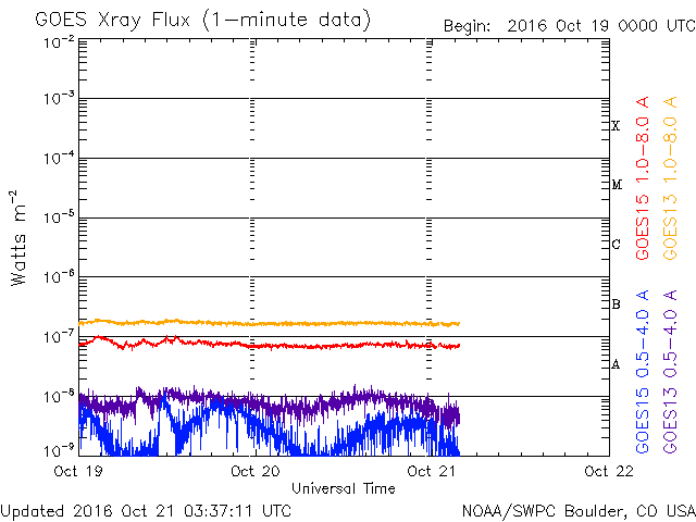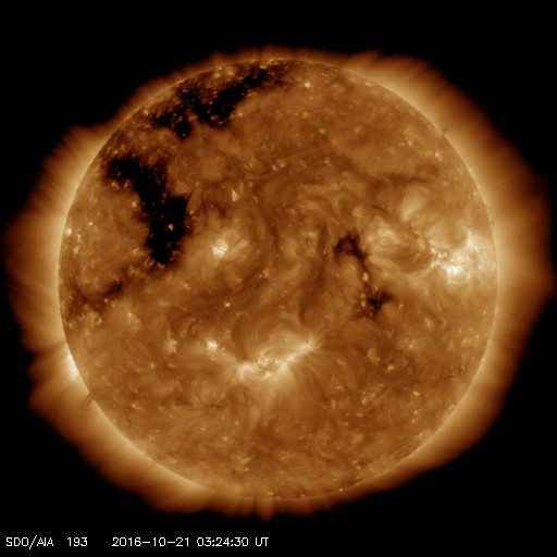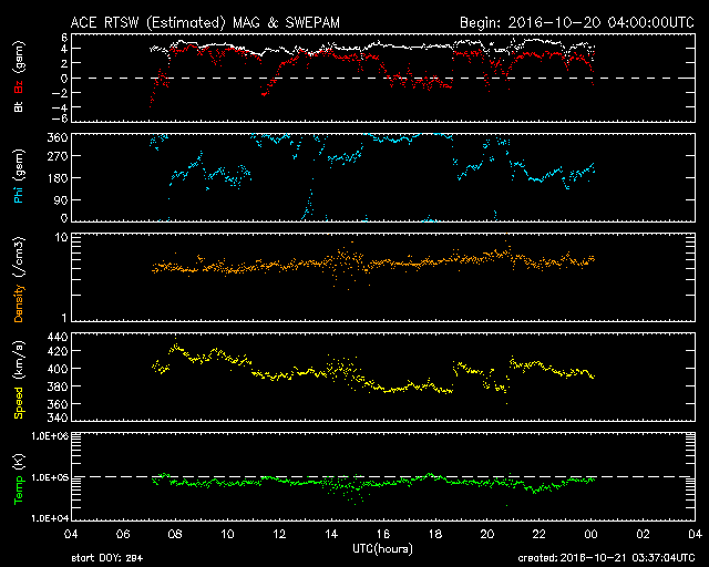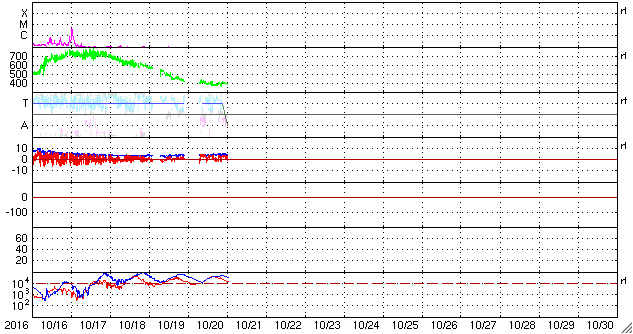 2016/10/21 12:37 更新 太陽風は平均的な状態です。太陽も穏やかです。 担当 篠原 太陽風は、速度400km/秒、磁場強度4〜5nTと、 どちらも平均的な状態で安定しています。 太陽風磁場の南北成分は、北寄りに推移しています。 このため、磁気圏は静穏になっていて、 AE指数のグラフはほとんど変化が起きていません。 SDO衛星AIA193の太陽コロナの写真では、 東側のコロナホールが、太陽の自転のため、 少しずつ中央部に近づいています。 STEREO Ahead衛星の写真を参照すると、 コロナホールは、東端の向こう側にかけて大きく広がっていて、 今回も太陽風の高まりは長い時間続きそうです。 太陽は、2602黒点群が西の端近くに見えるだけです。 X線グラフもほとんど変化がなく、 とても静かな状態が続いています。 放射線帯の高エネルギー電子は、 高まった状態が続いています。 太陽風が落ち着くと、ゆっくりと減少していきます。 ![]() SDO衛星のAIA193カメラによる太陽コロナの様子 (c) SDO (NASA) ![]() SDO衛星による太陽の可視光写真。マウスの矢印を写真に重ねると、黒点番号付きの写真に切り替わります。 (c) SDO (NASA) ![]() ACEが観測した太陽風の磁場(1番上の枠、白線は全体の強度、赤線は南北成分) および、太陽風の密度(3番目の橙線)、速度(4番目の黄線) (c) NOAA/SWPC ![]() リアルタイムAE指数 下段のAEグラフの値が高くなると、オーロラ活動が活発化しています。 (c) 京都大学, NICT ![]() 27日の太陽周期に合わせたデータプロット 太陽が同じ面を地球に向けていた27日前の変化から、今後を予想することができます。 (c) 作図:宇宙天気ニュース