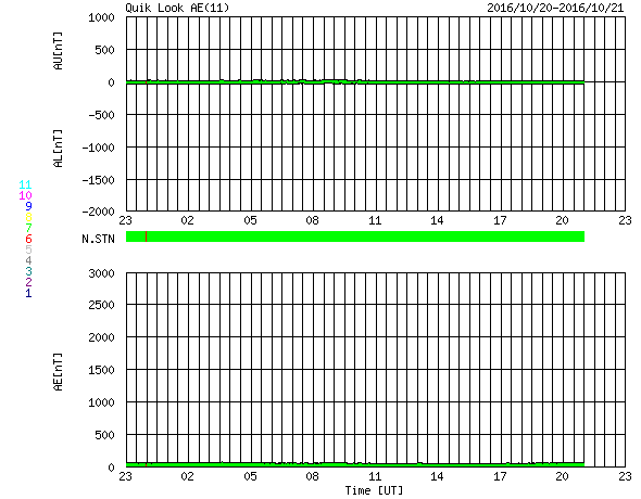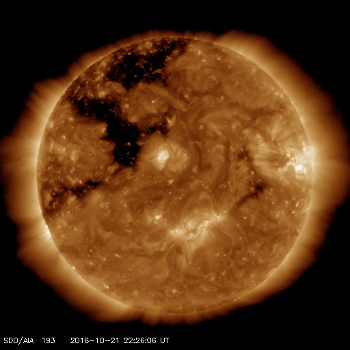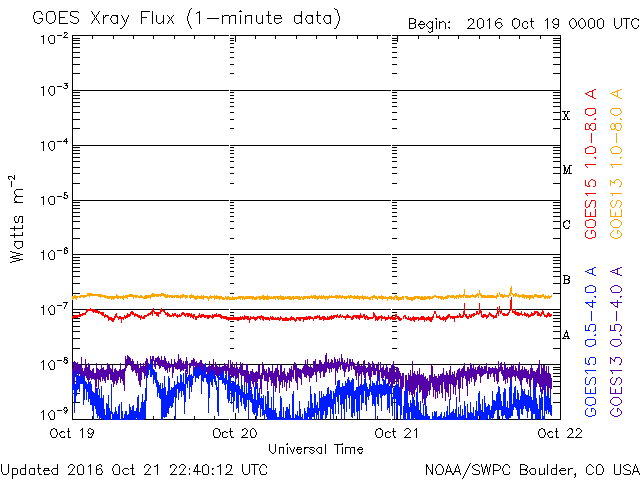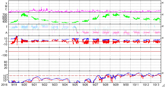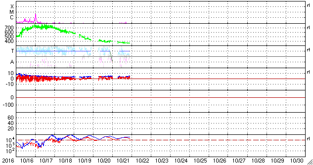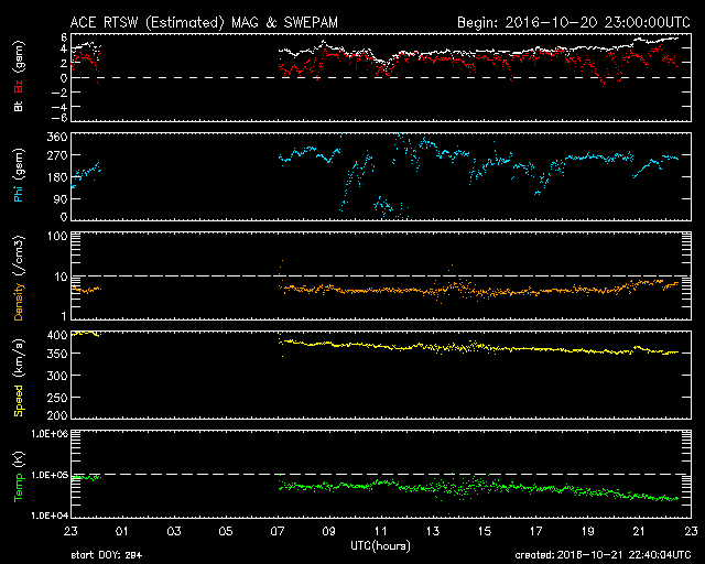 2016/10/22 07:40 更新 太陽風は低速になっています。磁気圏はとても穏やかです。 担当 篠原 太陽風の速度は、400km/秒から350km/秒へ下がり、 低速の風になっています。 27日周期の図の前周期と同様の変化です。 磁場強度は、4nTから5nTへ少し上がりかけていて、 ここで落ち着くのか、上昇を続けるのか、 前周期は、 このあたりから磁場の強まりが始まっていたのですが、 今回はどうなるでしょうか。 太陽風磁場の南北成分は、北向きの状態が続いています。 このため、磁気圏はとても静穏で、 AE指数のグラフは変化が見られません。 SDO衛星AIA193の太陽写真では、 コロナホールが太陽の中心線に近づいています。 今後、前周期の様な活発なオーロラ活動をもたらすでしょうか。 太陽では、中央部に2603黒点群が再び現れています。 小さな活動が見られる程度です。 放射線帯の高エネルギー電子は、 高まった状態が続いていますが、ゆっくりと減少しています。 今日は、文化祭のため、 朝の早い時間に記事を更新しています。 残念ながら夜から雨が降り続いています。