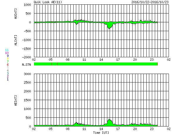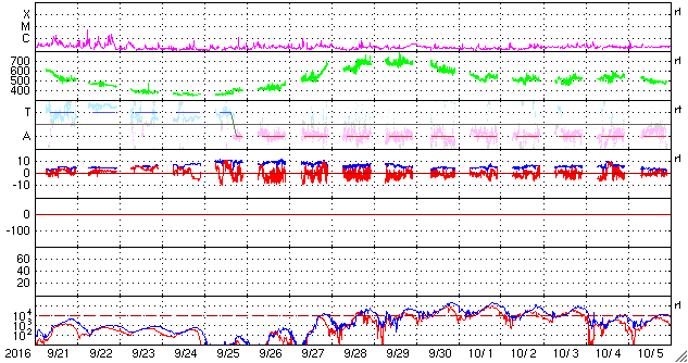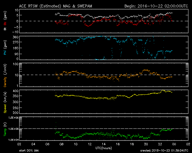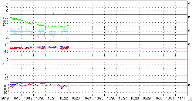 2016/10/23 10:40 更新 太陽風は平均的な状態で、磁気圏も穏やかです。 担当 篠原 太陽風の速度は、 350km/秒から400km/秒近くへ少し上がっています。 磁場強度は、5nTから3nTへ少し下がり、 再び5nTへ戻っています。 どちらも平均的な状態で、太陽風は穏やかです。 磁気圏も概ね静穏で、 AE指数のグラフは、400nTの高まりがひとつある程度です。 SDO衛星AIA193では、 コロナホールの先頭(右端)が、太陽の中心線に達しています。 この領域から噴き出している速度の高い太陽風が、 これからやって来ます。 前周期の変化を参考にすると、 明日から変化が始まるかもしれません。 太陽は、2603黒点群が小さく見えるだけで、 穏やかです。 放射線帯の高エネルギー電子は、低下が続き、 両衛星とも10,000近くまで減少しています。 高専祭は、今日は体育祭です。 雨は強弱を繰り返しながら、今日も降り続いています。 延期するのも難しく、雨の中、ぬれながら実施しています。