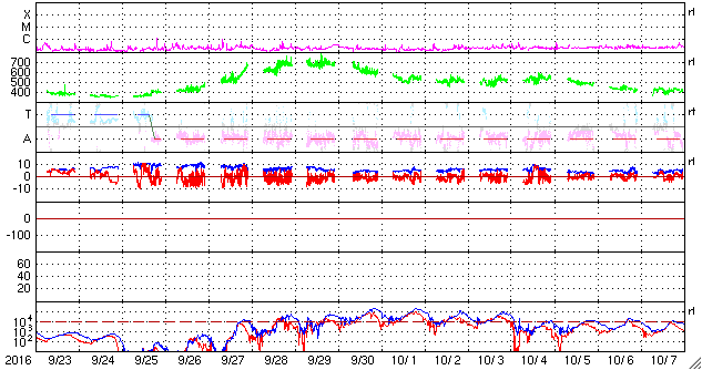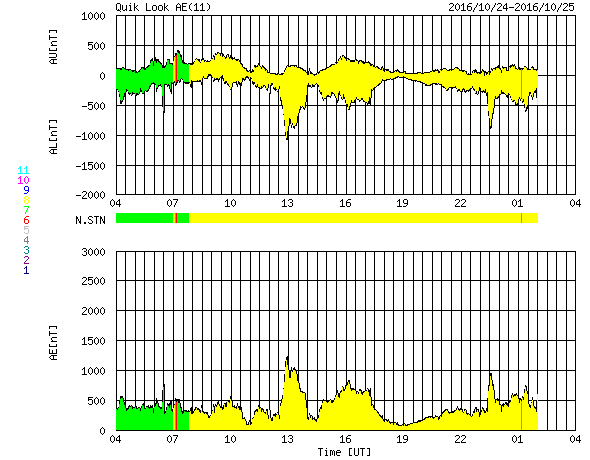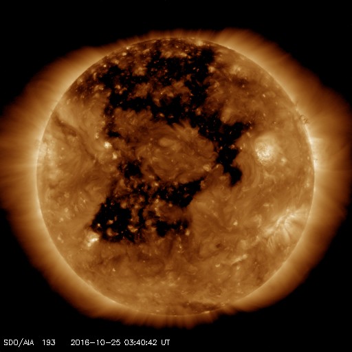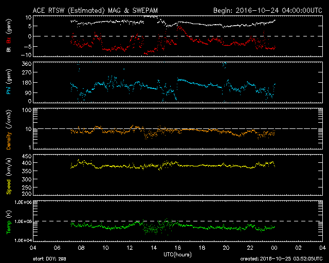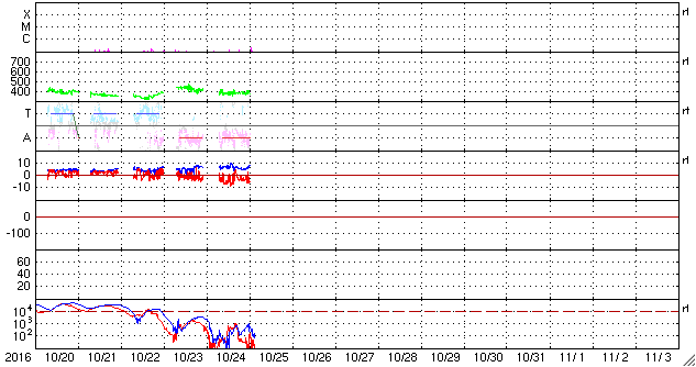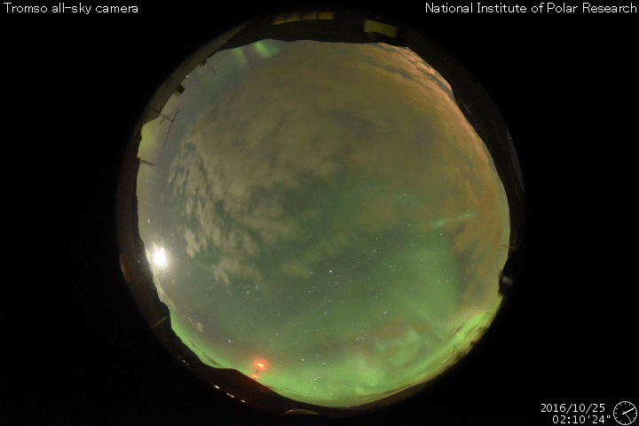 2016/10/25 12:53 更新 太陽風磁場が南寄りに変化して、磁気圏の活動を高めています。高速風の到来が近づいています。 担当 篠原 太陽風の速度は、まだ変化がなく、 400km/秒付近と平均的な値に留まっています。 一方、磁場強度は、 7nTに少し強まった状態が続いています。 特に、南北成分は南向きの変化が続いていて、 -5nTを超えるような変化も起きています。 このため、磁気圏の活動度は高まっていて、 AE指数では、800nTから1000nTに達する規模の 変化も発生しています。 この中で、最後の高まりに近い、 世界時25日2〜3時のノルウェー、トロムソの 全天カメラの動画を掲載します。 3月以来、半年ぶりの掲載です。 曇っていた空が、この頃から晴れ上がり、 オーロラの光が空全体を覆うように活動しています。 SDO衛星AIA193の太陽写真では、 コロナホールの広がりは、太陽の西側に進んでいて、 速度の高まりが始まる目安の位置に近づいています。 今日、明日には、太陽風の変化が始まるのではないでしょうか。 太陽は、2603黒点群が見えるだけで、 目立ったフレアの発生はありません。 西の端でフィラメント噴出が起きているようですが、 地球への影響はないでしょう。 ![]() ノルウェー・トロムソの全天カメラにより撮影された、世界時25日2〜3時頃のオーロラ。 (c) 国立極地研究所、(動画加工 : 宇宙天気ニュース) ![]() SDO衛星のAIA193カメラによる太陽コロナの様子 (c) SDO (NASA) ![]() SDO衛星による太陽の可視光写真。マウスの矢印を写真に重ねると、黒点番号付きの写真に切り替わります。 (c) SDO (NASA) ![]() ACEが観測した太陽風の磁場(1番上の枠、白線は全体の強度、赤線は南北成分) および、太陽風の密度(3番目の橙線)、速度(4番目の黄線) (c) NOAA/SWPC ![]() リアルタイムAE指数 下段のAEグラフの値が高くなると、オーロラ活動が活発化しています。 (c) 京都大学, NICT ![]() 27日の太陽周期に合わせたデータプロット 太陽が同じ面を地球に向けていた27日前の変化から、今後を予想することができます。 (c) 作図:宇宙天気ニュース