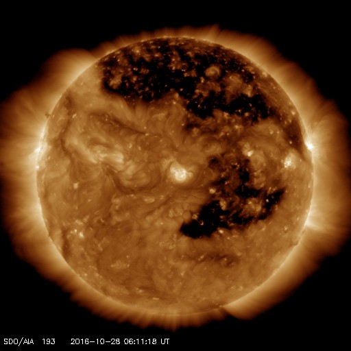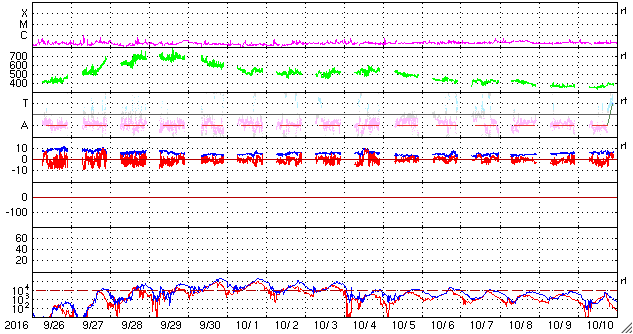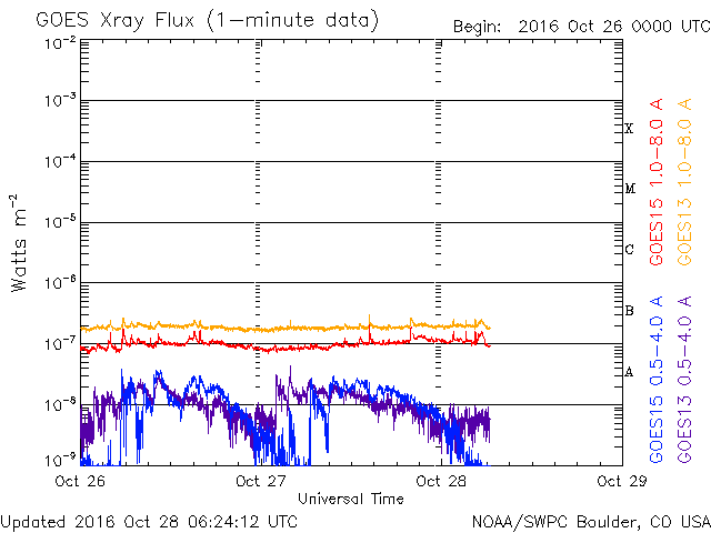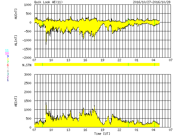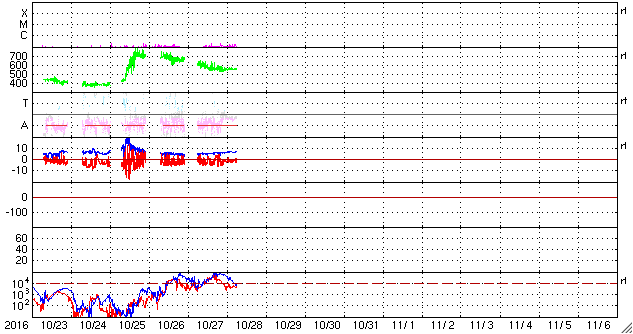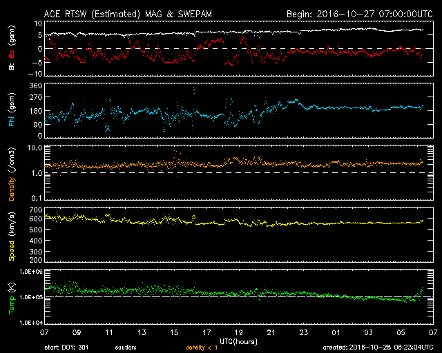 2016/10/28 15:24 更新 高速太陽風は550km/秒へやや下がっています。磁気圏の活動も少し落ち着いています。 担当 篠原 太陽風の速度は、昨夜くらいで600km/秒を割り、 現在にかけて、550km/秒付近で推移しています。 700km/秒を超えた最高速度と比べると、 だいぶ下がった印象ですが、 高速の状態は続いています。 太陽風の磁場強度は、5nTから7nTへやや高まっています。 速度の高まった状態は、このまま続きそうです。 太陽風磁場の南北成分は、 ACE衛星のグラフの前半は南に振れていますが、 後半は0nT付近で小さい変化に変わっています。 この影響で、磁気圏の活動度もやや変化していて、 AE指数は、グラフの前半は500〜1000nTと 中規模の活発な活動が続いていますが、 後半に入ると、250nT前後と小規模の変化に留まっています。 極域のオーロラの輝きも、 少し落ち着いているのではないでしょうか。 SDO衛星AIA193では、 低緯度のコロナホールはちょうど中央線を超えたくらいで、 この後も、4日程度は影響が残りそうです。 27日周期の図の前周期の太陽風では、 5日くらい高速風が続いています。 太陽は、西側と中央部に新しい黒点が見えています。 中央部の黒点では、小さい活動が起きているようで、 X線グラフに変化を作っています。 放射線帯の高エネルギー電子は、昨日よりも増加していますが、 100,000には達していません。 引き続き注目してください。