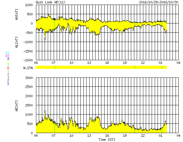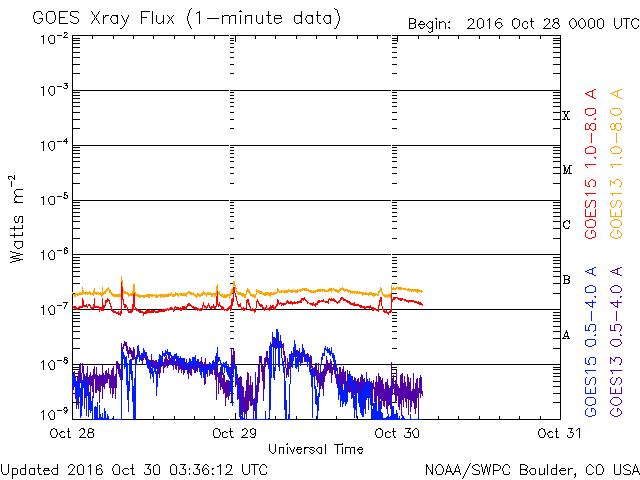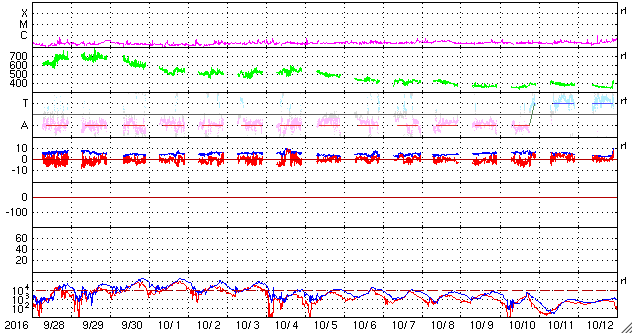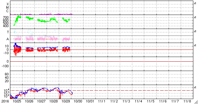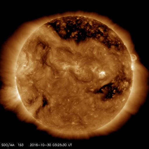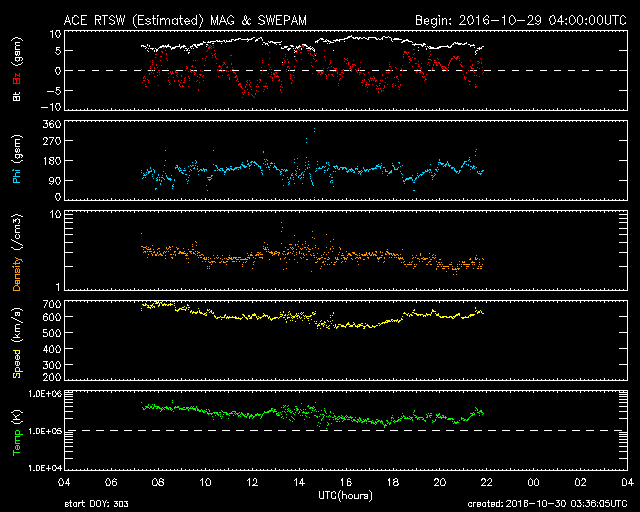 2016/10/30 12:37 更新 600km/秒台の高速太陽風が続いています。太陽は無黒点になりそうです。 担当 篠原 太陽風の速度は、600km/秒前後と高い状態が続いています。 昨夜から今日の未明にかけて、 600km/秒台を割るような変化も見られましたが、 その後、再び上昇して、 ACE衛星のグラフではデータが途切れていますが、 DSCOVR衛星の観測によると、 650km/秒まで回復しています。 25日の夜に始まった高速太陽風は、 5日が経過しようとしています。 太陽風の磁場強度は、7nTから5nTへ、 小幅ですが下がりつつあるようです。 高速太陽風の領域は、 後半に入ってきたのではないかと思います。 SDO衛星AIA193の太陽コロナ写真でも、 低緯度域のコロナホールは西半球(右側)に通り過ぎて、 これから影響は弱まっていきそうです。 太陽風磁場の南北成分は、 0nTを挟んで、南北に変化しています。 南への振れ幅が大きくなると、 速度も高まっているので、磁気圏の活動は強まります。 AE指数のグラフは、前半に800nT前後の大きめの活動が続き、 後半はやや小さくなっていますが、 500nTに達する変化が発生しています。 高速太陽風は次第に弱まると思われるので、 オーロラの活動も次第に弱まっていくでしょう。 2604黒点群は、今日の写真ではほとんど見えなくなっています。 太陽は無黒点になりそうです。 放射線帯の高エネルギー電子は、 GOES15(青線)の最大値は、100,000を保ちましたが、 昨日の時点で大きく減少しています。 ![]() SDO衛星のAIA193カメラによる太陽コロナの様子 (c) SDO (NASA) ![]() SDO衛星による太陽の可視光写真。マウスの矢印を写真に重ねると、黒点番号付きの写真に切り替わります。 (c) SDO (NASA) ![]() ACEが観測した太陽風の磁場(1番上の枠、白線は全体の強度、赤線は南北成分) および、太陽風の密度(3番目の橙線)、速度(4番目の黄線) (c) NOAA/SWPC ![]() リアルタイムAE指数 下段のAEグラフの値が高くなると、オーロラ活動が活発化しています。 (c) 京都大学, NICT ![]() 27日の太陽周期に合わせたデータプロット 太陽が同じ面を地球に向けていた27日前の変化から、今後を予想することができます。 (c) 作図:宇宙天気ニュース
