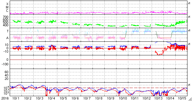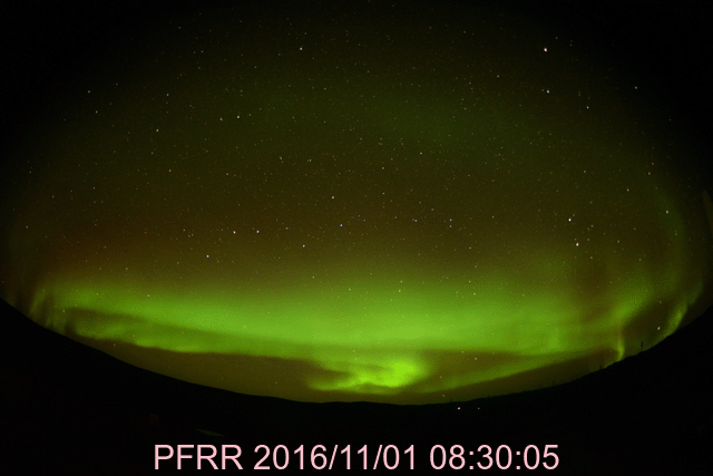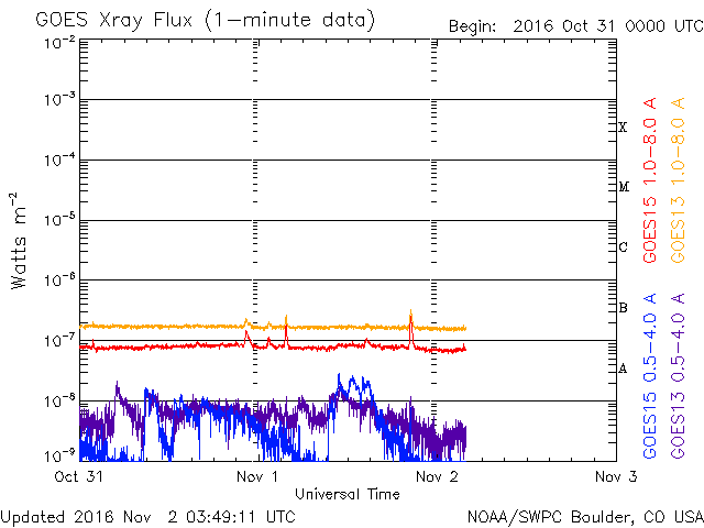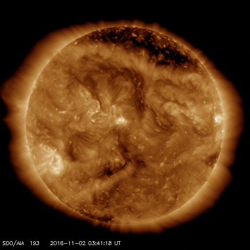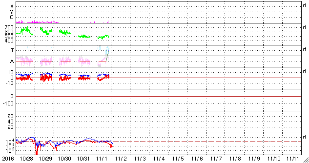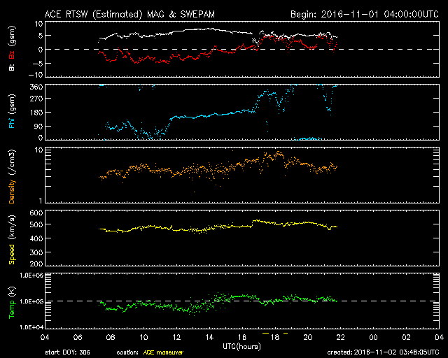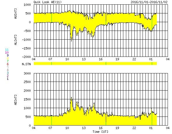 2016/11/ 2 12:49 更新 太陽風は平均的な状態にほぼ戻っています。 担当 篠原 太陽風は、昨夜から今日の未明にかけて、 磁場強度が、3nTから7nTへ、 速度が、480km/秒から520km/秒へ、 それぞれやや高まる変化が見られています。 その頃に、太陽風磁場の南北成分が、 -5nTと南向きにやや強まった状態が続き、 磁気圏の活動を高めています。 AE指数は、データエラーの影響で読み取りにくくなっていますが、 1000nTに達する大きい規模の活動が発生したようです。 この頃のオーロラの様子を、 アラスカのオーロラカメラの動画で紹介します。 活発な変動が空に大きく広がり、 素晴らしいオーロラの夜になったようです。 太陽風は、その後、今日の昼にかけてゆっくりと弱まり、 DSCOVRの観測では、速度は既に430km/秒ほどに下がり、 磁場強度も、5nTと平均的な値に戻っています。 太陽風は、高速風の領域を通り過ぎたのではないかと思います。 SDO衛星AIA193の写真では、 低緯度域に目立ったコロナホールはなく、 太陽風はしらばく穏やかになりそうです。 太陽は、中央部の2605黒点群がほとんど見えなくなり、 無黒点と言えそうな状態です。 放射線帯の高エネルギー電子は、 低下が始まっていて、 両衛星ともちょうど10,000程度に下がっています。