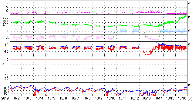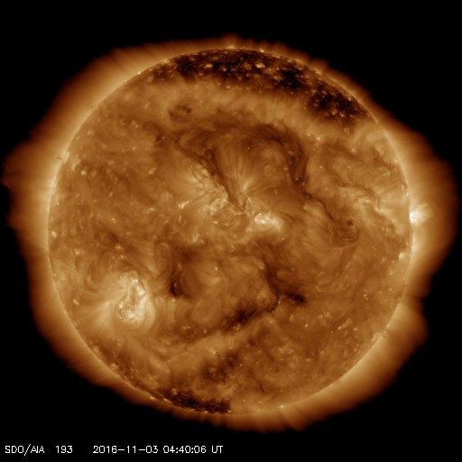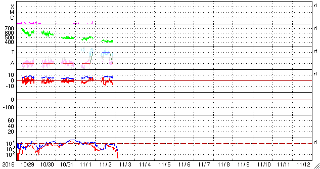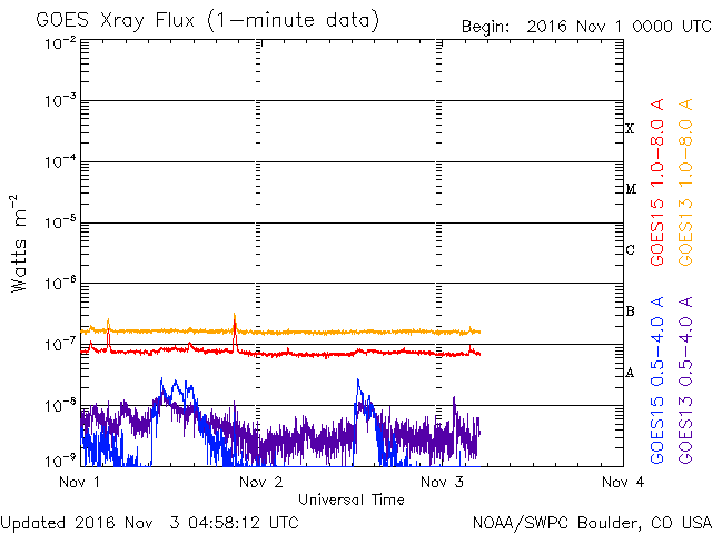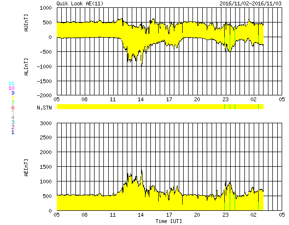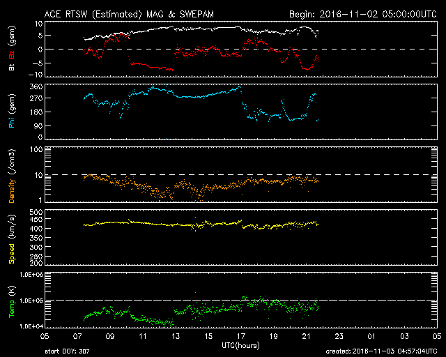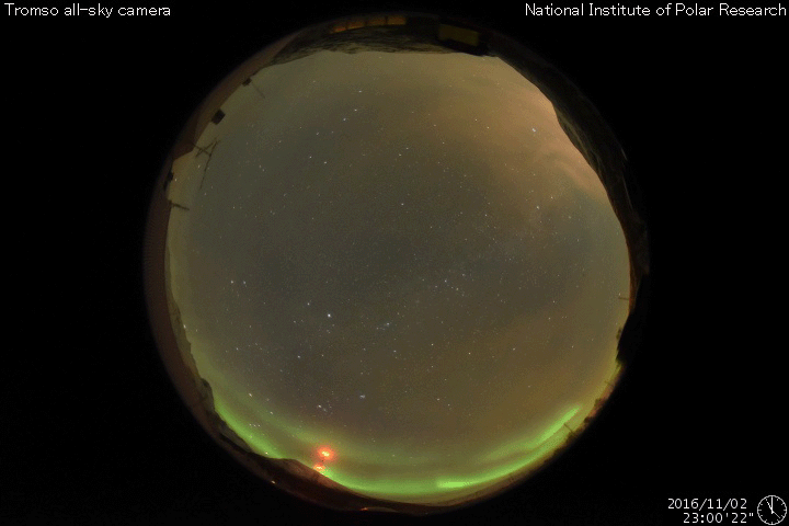 2016/11/ 3 13:58 更新 太陽風磁場が南向きにやや強まって、磁気圏の活動を高めています。 担当 篠原 太陽風の速度は、420km/秒と平均的な状態で安定しています。 一方、磁場強度は、7〜8nTと少し強まっています。 南北成分も、南向きに振れる傾向になって、 -5nT程度の変化が長く続くようになっています。 このため、磁気圏の活動は高まっていて、 AE指数のグラフは、 データエラーの関係で見にくくなっていますが、 500nT前後の中規模の活動が繰り返し発生しているようです。 このうち、世界時2日23時の高まりの頃のオーロラの様子を、 ノルウェー、トロムソの全天カメラの動画で紹介します。 地平線近くに見えていたオーロラの光が、 空全体に一気に広がる様子がきれいです。 27日周期の図を参考にすると、 太陽風は、基本的には平均的な状態が続くと思われます。 その中でも、磁場が南向きにある程度強まると、 このような磁気圏活動の高まりを見ることができます。 太陽は、中央部に小さい黒点が現れているようです。 2605群の位置に近いのですが、少し左側にずれています。 番号としてはどうなるでしょうか。 放射線帯の高エネルギー電子は、減少が続いています。