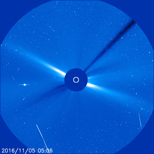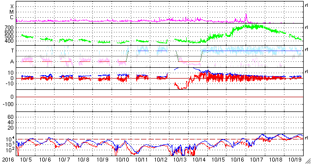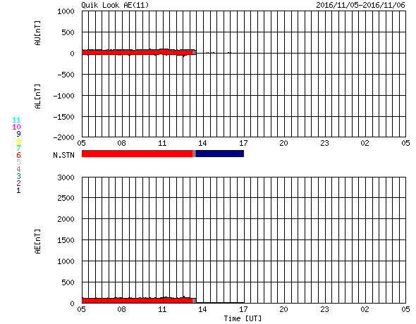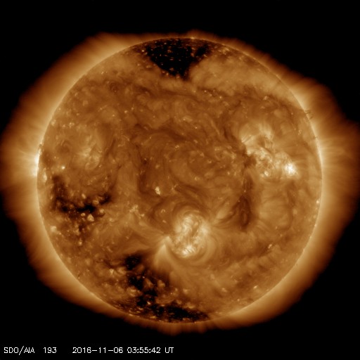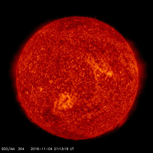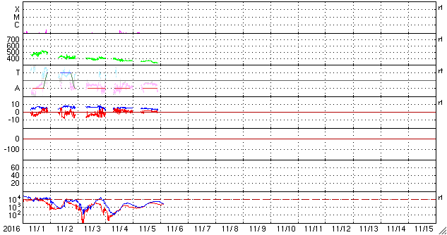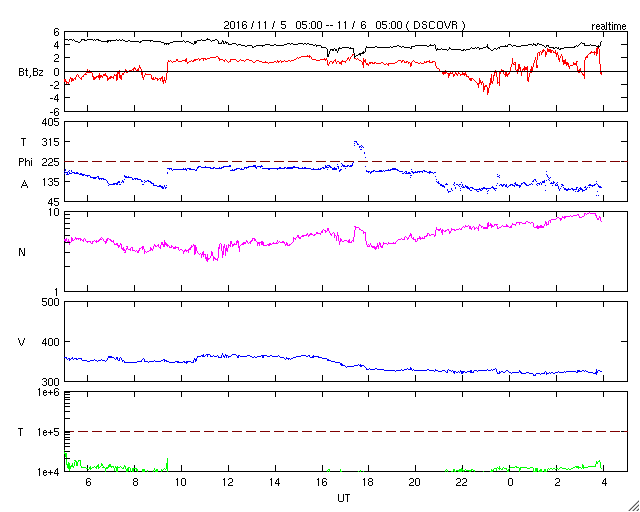2016/11/ 6 13:10 更新 太陽風は更に低速になり、磁気圏も静穏です。 担当 篠原 昨日の昼、5日12時(世界時5日3時)頃に、 太陽の北部でフィラメント噴出が発生しました。 SDO衛星AIA304による動画を掲載します。 太陽の上側に向かって、黒く見える太陽のガスが噴き出しています。 太陽全体の写真では、ほぼ同時に東側(左側)でも、 淡いフィラメントの噴出が起きています。 この現象により、CME(太陽ガスの放出現象)が発生しています。 SOHO衛星LASCO C3の動画を掲載します。 主に、太陽の右上に向かってガスは飛び出しているようです。 発生地点が、太陽の中央部に近いので、 地球へも影響がやって来るかもしれません。 4〜5日後くらいの太陽風の変化、 特に磁場の乱れに注目してください。 太陽では、この他に目立った現象はなく、穏やかです。 黒点は、2605群と2606群がかろうじて見えています。 太陽風は、今日に入った頃からもう一段速度が下がり、 320km/秒と更に低速の状態になっています。 磁場強度も、5nTから4nTへ少し弱まっています。 磁場の南北成分は、比較的北寄りに推移しています。 速度が下がっていることもあり、磁気圏はかなり静穏のようです。 AE指数は、グラフが途中までしか表示されていませんが、 ここまでは全く変化がありません。 SDO衛星AIA193では、 東端のコロナホールが見やすくなってきました。 この領域の影響が及び始めるまで、 太陽風は穏やかな状態が続きそうです。 宇宙天気ニュースで参照する太陽風のデータを、 ACE衛星からDSCOVR衛星へ少しずつ切り替えています。 先週よりリアルタイムデータの取り込みができるようになり、 情報BOXの数値を切り替えました。 今日から、記事中に参照する太陽風の1日グラフを、 DSCOVR衛星に切り替えます。 残りは、27日周期の図です。