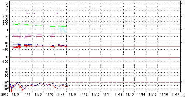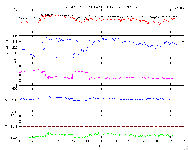 2016/11/ 7 14:01 太陽風はかなり低速になっていますが、弱いオーロラが発生しています。