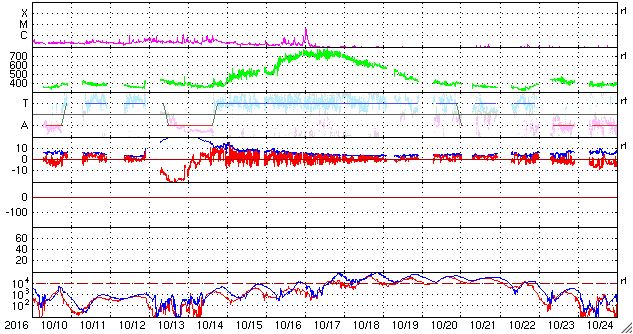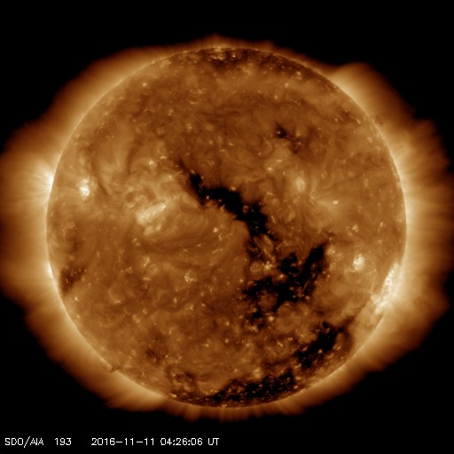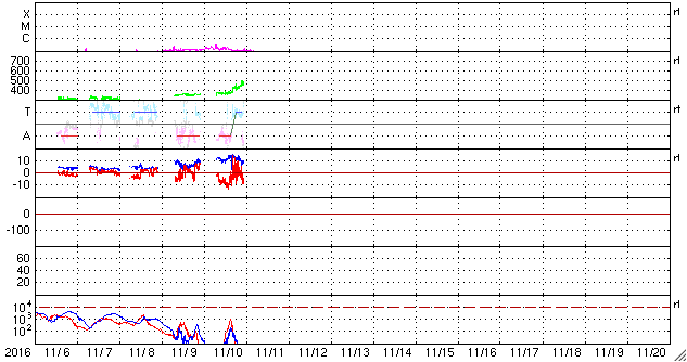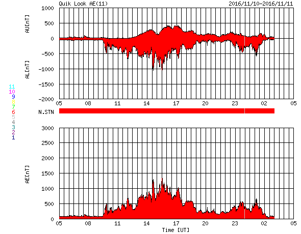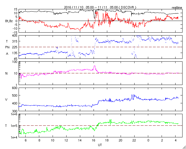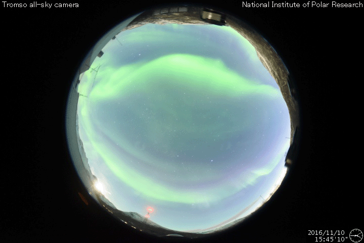 2016/11/11 13:39 更新 太陽風磁場が南向きに強まり、磁気圏の活動が高まりました。高速太陽風が始まりそうです。 担当 篠原 昨日のニュースの後、太陽風磁場は強まったまま、 南北成分が北向きから南向きにゆっくりと切り替わり、 深夜には -10nTまで強まりました。 CMEによる磁場のかたまりが流れてきて、 磁場の南北方向がゆっくりと切り替わって行ったようです。 この強い南向きの影響で、磁気圏の活動度も高まり、 AE指数は、1000nTを越える変化に強まっています。 この最も強まった頃のオーロラの様子を、 ノルウェー・トロムソの全天カメラの動画で紹介します。 現地が暗くなる時刻の関係で、 撮影開始時点でオーロラは既に最も激しい変化をしています。 もう少し前の時間帯から見てみたかったです。 太陽風は、11日2時(世界時10日17時)頃に、 速度が350km/秒から430km/秒へ高まる変化が発生しています。 そして、その後も速度はゆっくりと上昇の傾向を示しています。 太陽風磁場の大まかな方向が切り替わる、 セクター境界がやって来たようです。 また、コロナホールの影響も及び始めているのかもしれません。 27日周期の図を見ると、 前周期は、10月15日から速度が本格的に高まり始めています。 今回もそろそろ高速太陽風に繋がっていきそうです。 太陽は、2607黒点群が西の端に近づいています。 となりの小さい黒点には、番号は付いていません。 また、昨日、東端に見えていた小さい黒点も、 現在は見えなくなっています。