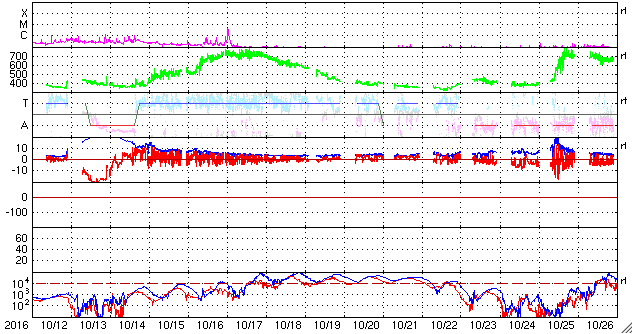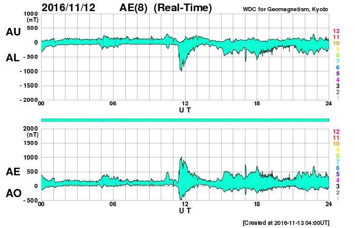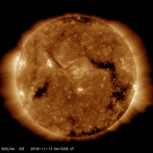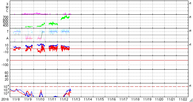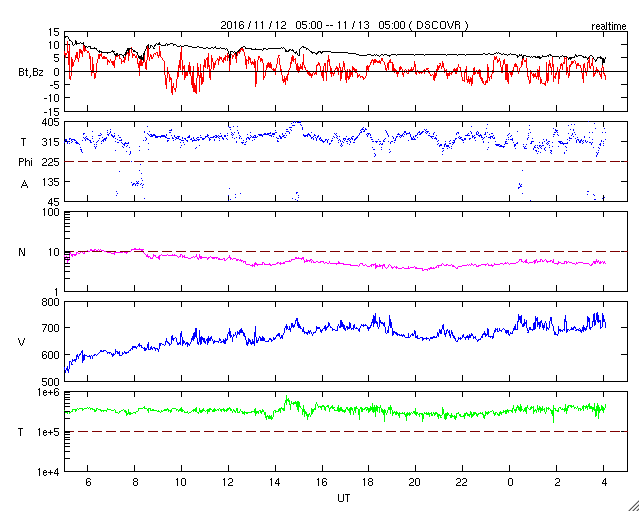 2016/11/13 13:18 更新 太陽風は700km/秒の高速風になっています。磁気圏の活動もやや高まっています。 担当 篠原 高速太陽風が始まりました。 昨日のニュースの直後から、太陽風の速度は上昇を始めて、 12日15時(世界時12日6時)には、600km/秒に達し、 更に、夜にかけて700km/秒へ高まっています。 27日周期の図の前周期の太陽風と同様の変化になり、 かなり高速の太陽風に変わっています。 太陽風の磁場強度は、一時、15nTに強まっていましたが、 速度が上がりきると少し下がって、 現在は7nTとやや強まった状態です。 磁場の南北成分は、グラフの前半は北寄りに推移して、 後半は0nT付近で変化するようになっています。 このため、磁気圏の活動はあまり大きくはならず、 1000nTの変化が1回起きていますが、 以降は500nT前後の変化に留まってます。 SDO衛星AIA193の太陽写真を見ると、 コロナホールは、全体が既に西側(右側)に進んでいます。 高速太陽風は、前周期と同様に比較的短い期間で終わりそうです。 太陽は、中央部に2609黒点群、 東側に2610黒点群が発生しています。 X線グラフに目立った変化はなく、太陽は穏やかです。