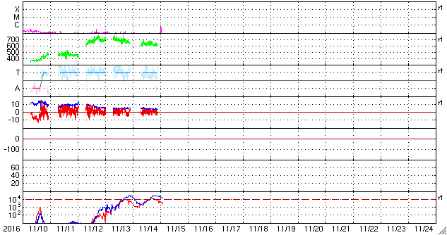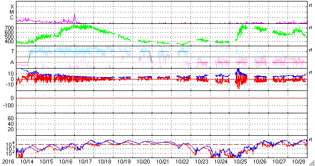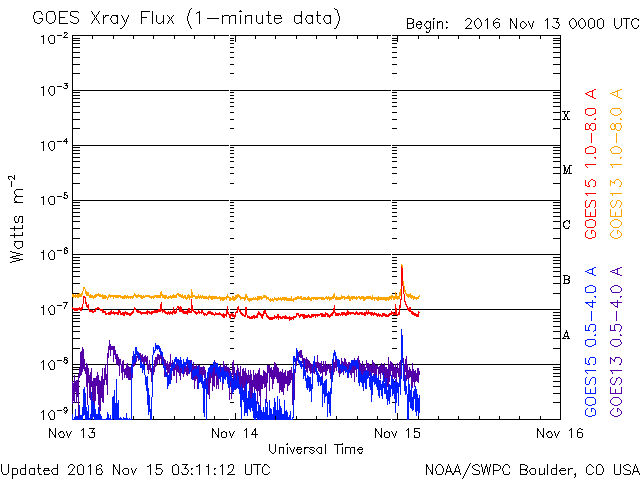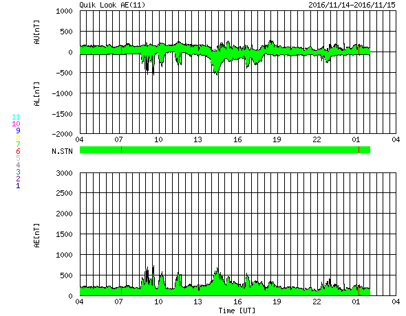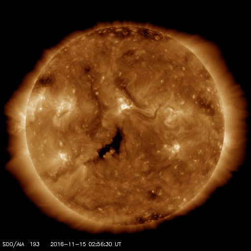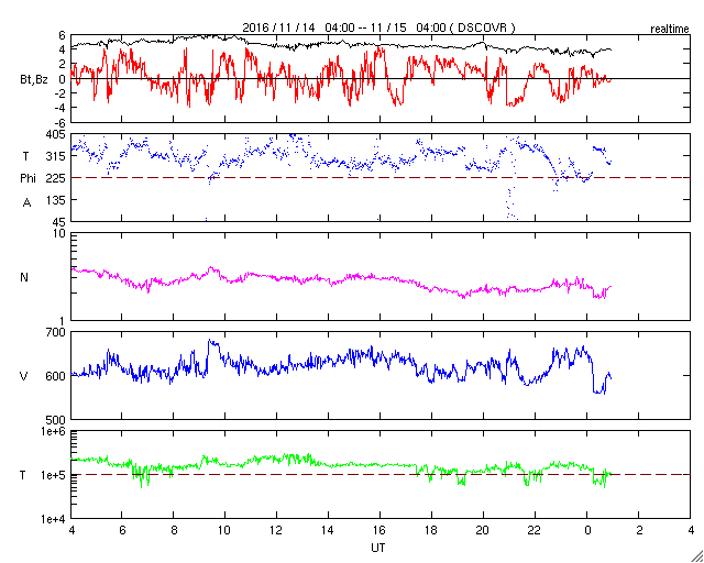 2016/11/15 12:11 更新 600km/秒台の高速太陽風が続いています。 担当 篠原 太陽風の速度は、600km/秒まで下がったところで落ち着いて、 以降、600〜650km/秒の状態で安定しています。 磁場強度は、5nTから4nTと、 変化は小さいですが弱まっています。 高速風は後半に入っているのでしょう。 太陽風磁場の南北成分は、 0nTを挟んで、南北に小さく変化しています。 磁気圏では、ある程度の活動は続いていて、 AE指数は、500nTくらいの中規模の変化が発生したり、 変化のない穏やかな状態になったりしています。 27日周期の図を見ると、前周期の太陽風は、 今日に対応する10月19日に大きく速度を下げています。 今回の高速風も、終わりが近づいていると思われます。 SDO衛星AIA193では、 太陽の中心部にやや小さいコロナホールがあります。 4日後の11月19日くらいに、 この領域による弱い影響が見られるかもしれません。 また、今日の写真ではまだ見えていませんが、 この後、東端から大きなコロナホールが見え始めます。 前周期のグラフの10月25日に始まる変化をもたらした領域です。 今回も、11月21日くらいから注意が必要でしょう。 太陽では、中央の2610黒点群で、 Bクラスの小さいフレアが発生しています。 また、中央部の北西側(右上)で、 小規模のフィラメント噴出も発生しています。 SOHO衛星の画像では、 目立つほどのCMEにはなっていないようです。 高速太陽風の影響を受けて、 放射線帯の高エネルギー電子が増加しています。 GOES13(赤線)、GOES15(青線)の両衛星で、 10,000を超えています。 ![]() SDO衛星のAIA193カメラによる太陽コロナの様子 (c) SDO (NASA) ![]() SDO衛星による太陽の可視光写真。マウスの矢印を写真に重ねると、黒点番号付きの写真に切り替わります。 (c) SDO (NASA) ![]() DSCOVRが観測した太陽風の磁場(1番上の枠、黒線は全体の強度、赤線は南北成分) および、太陽風の密度(3番目の紫線)、速度(4番目の青線) (c) データ:NOAA/SWPC、作図:宇宙天気ニュース ![]() リアルタイムAE指数 下段のAEグラフの値が高くなると、オーロラ活動が活発化しています。 (c) 京都大学, NICT ![]() 27日の太陽周期に合わせたデータプロット 太陽が同じ面を地球に向けていた27日前の変化から、今後を予想することができます。 (c) 作図:宇宙天気ニュース