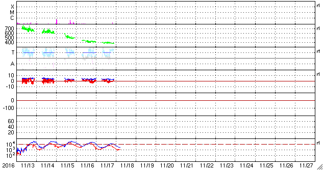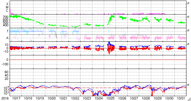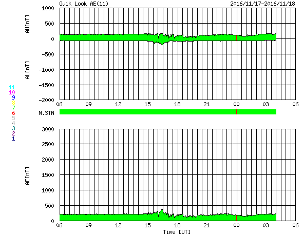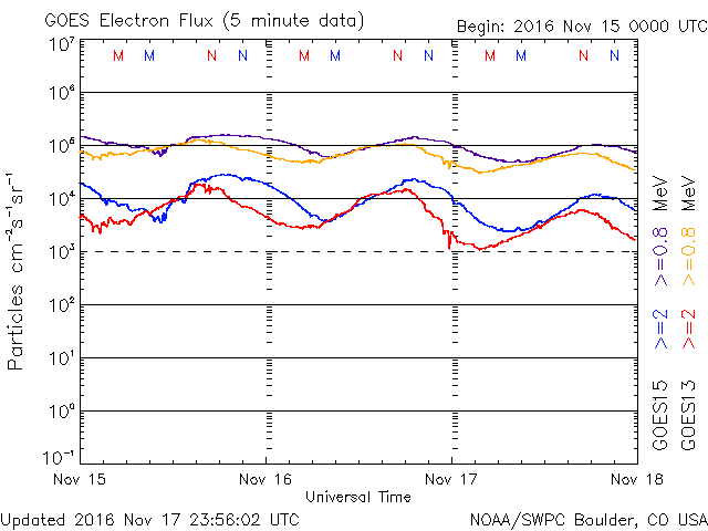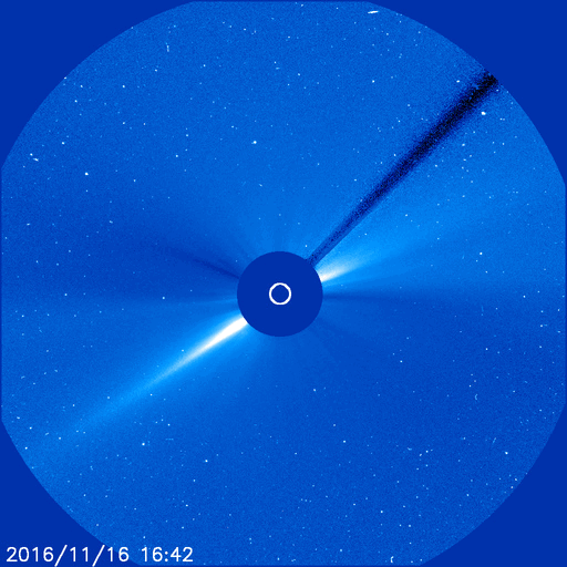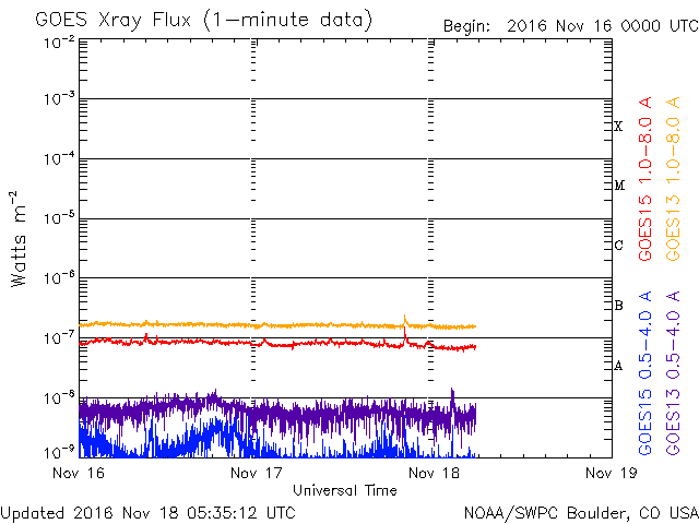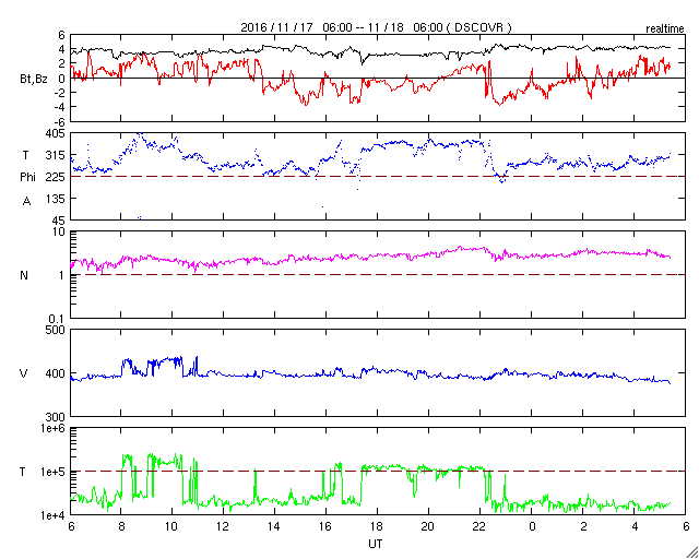 2016/11/18 14:35 更新 太陽は穏やかです。太陽風も平均的な状態で、磁気圏も穏やかです。 担当 篠原 15日から17日にかけて、SOHO衛星の写真で、 小型の彗星が太陽に接近する様子が見られました。 LSDCO C3とC2による動画を掲載します。 この写真では、彗星は最接近付近で消えてしまったように見えます。 その太陽では、東端の黒点に2611群と番号が付きました。 X線グラフに目立った変化はなく、 太陽は穏やかな状態が続いています。 太陽風は、速度400km/秒、磁場強度4nTと、 平均的な状態で安定しています。 磁気圏も穏やかで、AE指数は目立った変化はありません。 SDO衛星AIA193の太陽写真では、 南半球の小型のコロナホールが、西側に半分ほど進み、 地球に影響が及び始める目安の位置に達しています。 この後の太陽風に、弱い変化が見られるかもしれません。 また、北半球のコロナホールも、 太陽の中心線に達しようとしています。 こちらの影響も、3日後くらいから始まるかもしれません。 前周期の様な低緯度域の広がりがなくなって、 どのような太陽風の到来になるでしょうか。 放射線帯の高エネルギー電子は減少が続き、 赤線のGOES13は、10,000を割っています。 今日、18日の午後から19日にかけて、 高専のネットワークが、工事のため停止します。 このため、最新情報の更新もしばらく停止します。