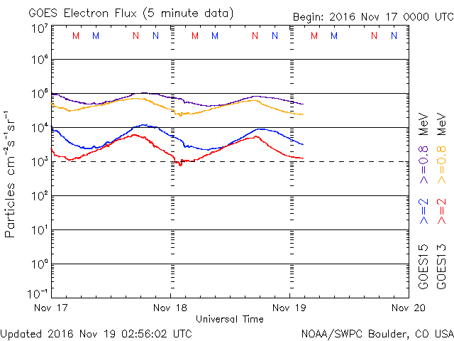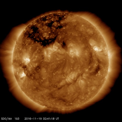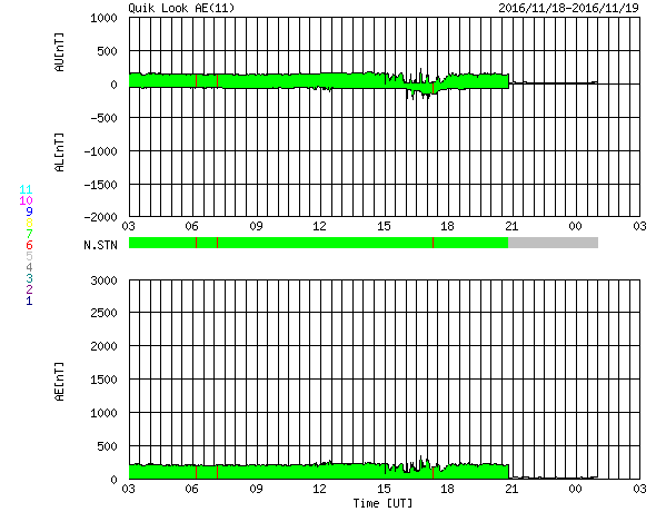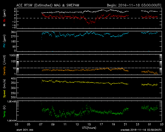 2016/11/19 11:59 更新 太陽風は低速になっています。磁気圏も静穏です。 担当 篠原 太陽風の速度は、400km/秒台を割って、 330km/秒に下がっています。 低速の風に変わっています。 一方、磁場強度は、4nTと平均的な値で安定しています。 太陽風磁場の南北成分は、 弱い北寄りの傾向が続いています。 このため、磁気圏は穏やかで、 AE指数のグラフは、ほとんど変化が見られません。 SDO衛星AIA193の太陽コロナ写真では、 北半球中高緯度域のコロナホールの右端が、 太陽の中央線にちょうど達しています。 やや緯度は高めですが、 3日後くらいから太陽風に影響がやって来る可能性があります。 太陽は、2つの黒点群がかろうじて見えている程度です。 X線グラフは変化がなく、穏やかな状態が続いています。 放射線帯の高エネルギー電子は、減少が続き、 GOES15(青線)も10,000を割っています。 19日中に高専内のLANが回復して、 最新情報の更新も再開できる予定です。 夕方くらいまでお待ち下さい。 ![]() SDO衛星のAIA193カメラによる太陽コロナの様子 (c) SDO (NASA) ![]() SDO衛星による太陽の可視光写真。マウスの矢印を写真に重ねると、黒点番号付きの写真に切り替わります。 (c) SDO (NASA) ![]() ACEが観測した太陽風の磁場(1番上の枠、白線は全体の強度、赤線は南北成分) および、太陽風の密度(3番目の橙線)、速度(4番目の黄線) (c) NOAA/SWPC ![]() リアルタイムAE指数 下段のAEグラフの値が高くなると、オーロラ活動が活発化しています。 (c) 京都大学, NICT ![]() GOES衛星の太陽X線データ (c) NOAA/SWPC ![]() GOES衛星による、静止衛星軌道における高エネルギー電子の変化 (c) NOAA/SWPC ![]() | ||||||||||||||||||||||||||||||||||||||||||||||||||||||||