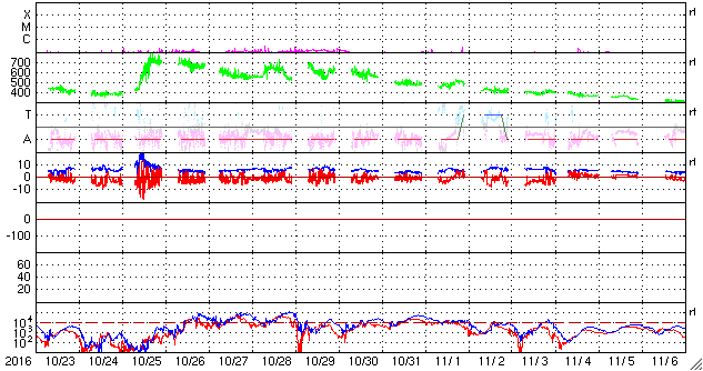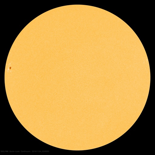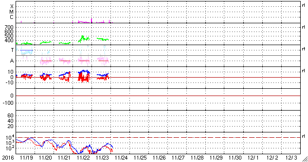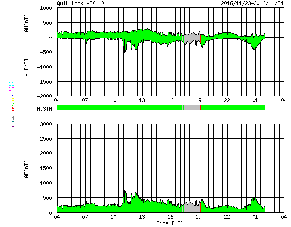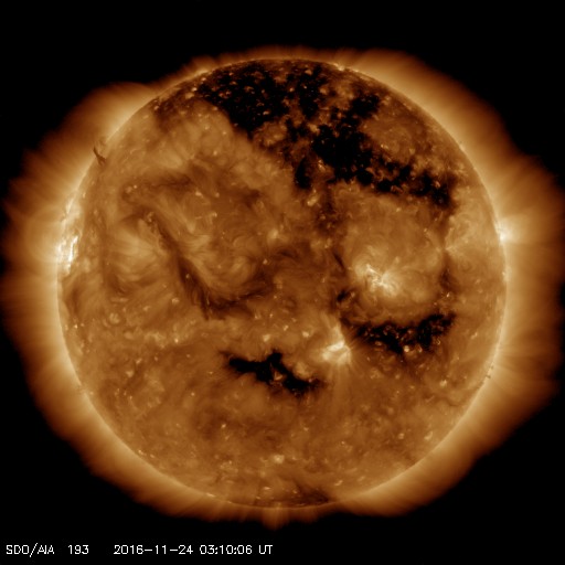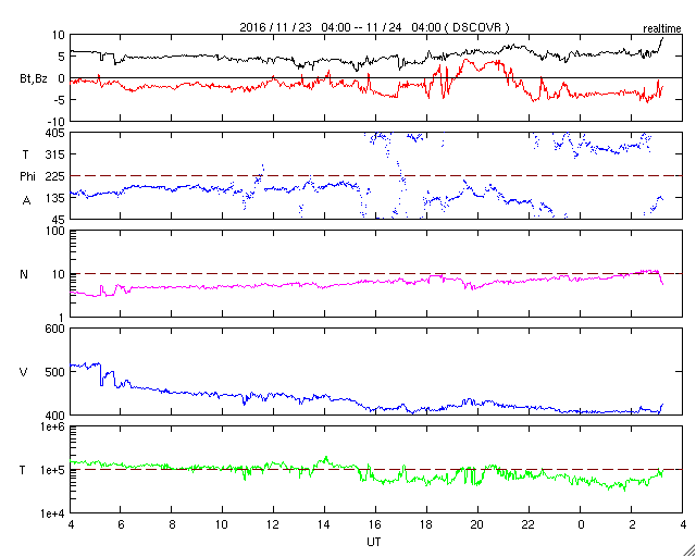 2016/11/24 12:27 更新 高速の太陽風は一旦終わり、平均的な速度に戻っています。 担当 篠原 太陽風の速度は、 昨日のニュースの後、550km/秒まで上がりましたが、 23日14時(世界時23日5時)には下がり始めて、 すぐに500km/秒を割り、 現在は400km/秒と平均的な状態に戻っています。 磁場強度も、5nT付近と平均的な状態です。 高速の太陽風は、最高速度もあまり高まらず、 1日ほどで終わっています。 SDO衛星AIA193の太陽コロナ写真では、 北極から南半球へ伸びるコロナホールの領域が、 太陽の西側に進み、地球に影響がやって来てもよい頃です。 これから第二波として、速度の上昇が始まりそうですが、 27日周期の図の前周期の太陽風の推移とは、 ずいぶん様子が変わっています。 太陽風磁場の南北成分は、 南に振れている時間が多くなっていますが、 振れ幅が小さいため、 磁気圏の活動の高まりは限定的で、 AE指数は、800nTと500nTの中規模の変化が起きていますが、 その他は、小さい変化に留まっています。 引き続き、太陽風の変化に注目してください。 太陽は、東端の黒点に2612群と番号が付き、 B6.0と小さい規模ですが、フレアも発生しています。 ![]() SDO衛星のAIA193カメラによる太陽コロナの様子 (c) SDO (NASA) ![]() SDO衛星による太陽の可視光写真。マウスの矢印を写真に重ねると、黒点番号付きの写真に切り替わります。 (c) SDO (NASA) ![]() DSCOVRが観測した太陽風の磁場(1番上の枠、黒線は全体の強度、赤線は南北成分) および、太陽風の密度(3番目の紫線)、速度(4番目の青線) (c) データ:NOAA/SWPC、作図:宇宙天気ニュース ![]() リアルタイムAE指数 下段のAEグラフの値が高くなると、オーロラ活動が活発化しています。 (c) 京都大学, NICT ![]() 27日の太陽周期に合わせたデータプロット 太陽が同じ面を地球に向けていた27日前の変化から、今後を予想することができます。 (c) 作図:宇宙天気ニュース