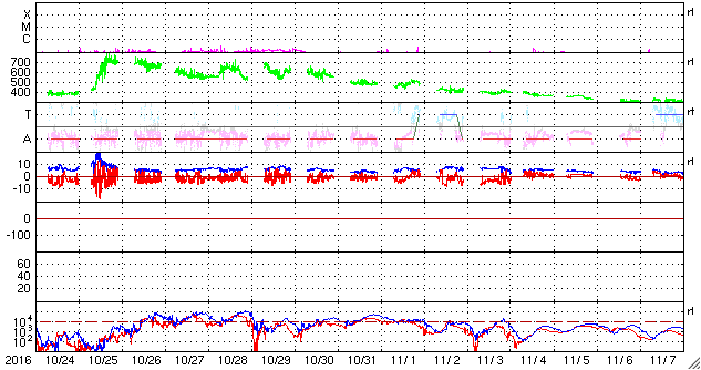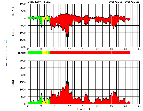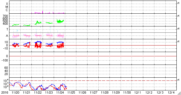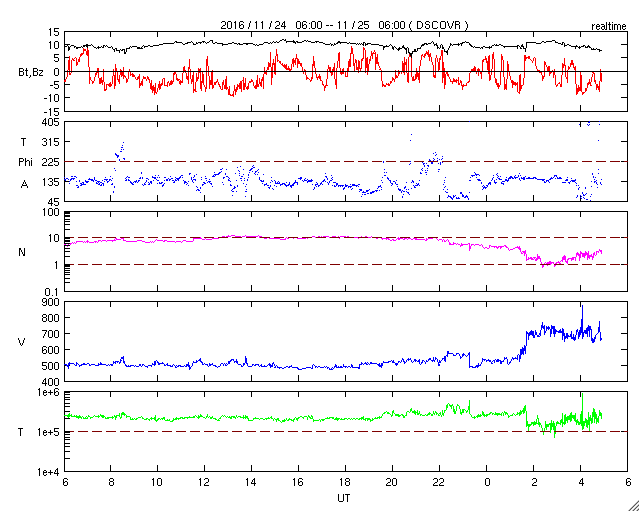 2016/11/25 14:07 更新 太陽風の速度は700km/秒に高まり、磁気圏の活動も強まっています。 担当 篠原 太陽風の速度は再び高まり、高速風に戻っています。 昨日のニュースの後、24日14時(世界時24日5時)に、 太陽風の速度は、400km/秒から500km/秒に高まりました。 そのまま、今朝まで500km/秒付近を推移していましたが、 25日10時半(世界時25日1時半)に、 700km/秒へ更に速度が高まっています。 太陽風の磁場強度は、昨日の昼以降、10nTに強まって、 そのまま現在まで続いています。 27日周期の図の前周期の、 10月28日以降に続く高速風領域の回帰だと思われます。 SDO衛星AIA193の太陽写真では、 コロナホールは全体が西半球に進んでいます。 現在は、高速風のピークに差しかかっているのではないでしょうか。 太陽風磁場の南北成分は、 5nT程度に振幅が強まった状態で、南北に変化しています。 速度の高まりもあって、磁気圏の活動は一気に強まり、 AE指数は、1800nTに達する激しい変化と、 その前後に、500〜800nTの中規模の変化が連続して発生しています。 この中の、世界時24日10〜13時のオーロラの様子を、 アラスカの全天カメラの動画で紹介します。 27日前の前周期は、ここから更に4日程度高速風が続きました。 今回は、コロナホールの広がりが小さくなっていて、 高速風の終わりも早まる可能性があります。 引き続き注目して下さい。 太陽は、東側に2612黒点群が見えていますが、 X線グラフに目立った変化はなく、穏やかな状態が続いています。 ![]() アラスカ、フェアバンクス近くのPoker Flatで、世界時24日10〜13時に撮影されたオーロラ。 (c) 情報通信研究機構、(動画加工 : 宇宙天気ニュース) ![]() SDO衛星のAIA193カメラによる太陽コロナの様子 (c) SDO (NASA) ![]() SDO衛星による太陽の可視光写真。マウスの矢印を写真に重ねると、黒点番号付きの写真に切り替わります。 (c) SDO (NASA) ![]() DSCOVRが観測した太陽風の磁場(1番上の枠、黒線は全体の強度、赤線は南北成分) および、太陽風の密度(3番目の紫線)、速度(4番目の青線) (c) データ:NOAA/SWPC、作図:宇宙天気ニュース ![]() リアルタイムAE指数 下段のAEグラフの値が高くなると、オーロラ活動が活発化しています。 (c) 京都大学, NICT ![]() 27日の太陽周期に合わせたデータプロット 太陽が同じ面を地球に向けていた27日前の変化から、今後を予想することができます。 (c) 作図:宇宙天気ニュース