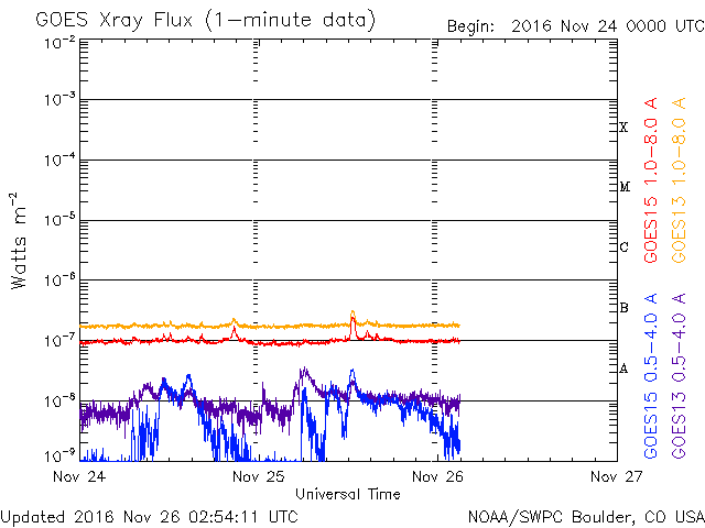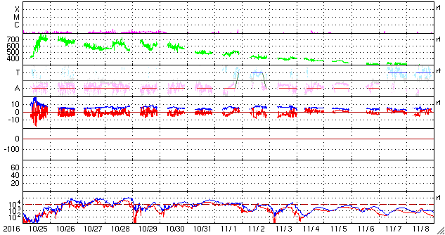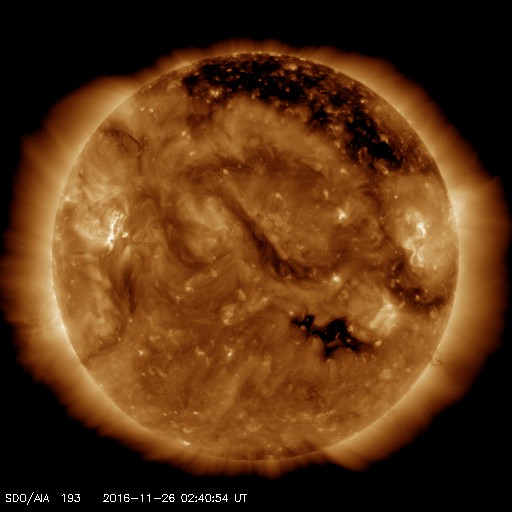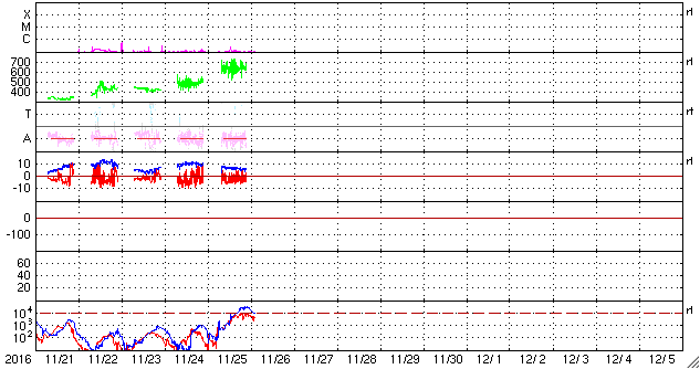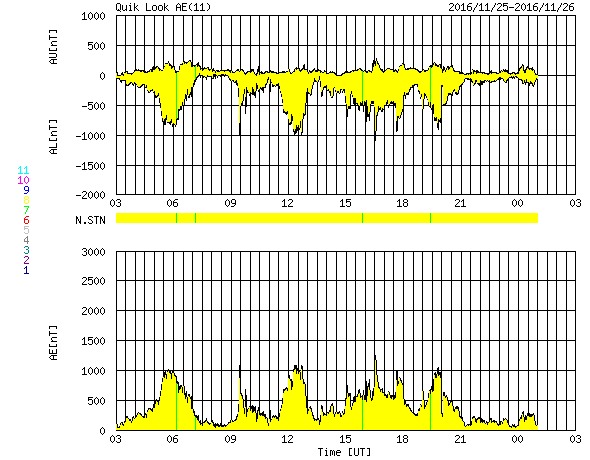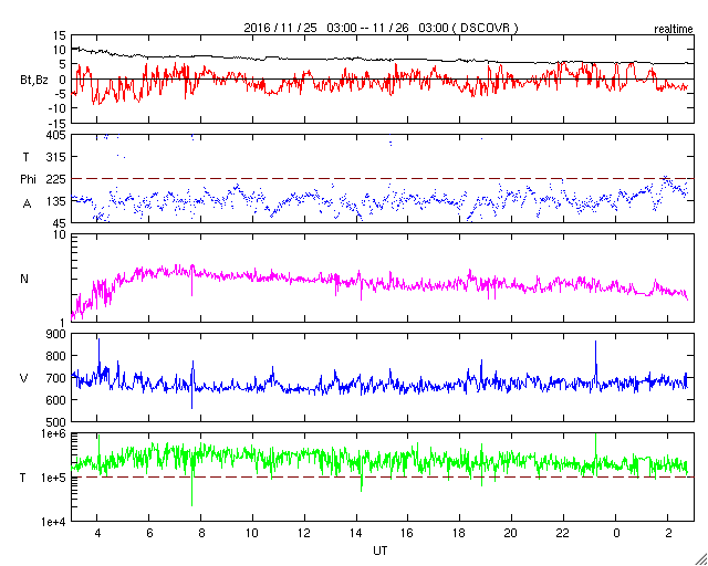 2016/11/26 11:54 更新 600km/秒台後半の高速太陽風が続いています。磁気圏も活動的です。 担当 篠原 高速の太陽風が続いています。 太陽風の速度は、昨日以降670km/秒前後で推移しています。 磁場強度は、10nTから5nTヘゆっくりと下がっています。 高速風の領域は、中盤に入っているようです。 27日周期の図の前周期を見ると、 もう1日ほど、600km/秒台と高い速度が続き、 以降も高速風は続いていますが、500km/秒へ下がっています。 SDO衛星AIA193では、 コロナホールは全体的に西半球に遠ざかりつつあります。 現在の高速風も、これから後半に入っていくでしょう。 太陽風磁場の南北成分は、0nTを挟んで南北に変化しています。 速度がかなり高まっていることもあり、磁気圏の活動は強めで、 AE指数は、1000nTに達する大きい変化が、 繰り返し発生しています。 今後は、磁場強度が下がってきたことと、 速度も次第に低下に向かうと思われるため、 磁気圏の活動も次第に規模が小さくなっていくでしょう。 太陽は、2612黒点群が見えるだけで、 目立った活動はなく、穏やかな状態が続いています。 また、放射線帯の高エネルギー電子が増加して、 GOES15(青線)が10,000を超え、 GOES13(赤線)も10,000に近い値に高まっています。 高速の太陽風が続いているので、更に増加する可能性があります。