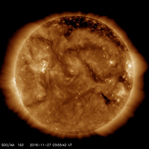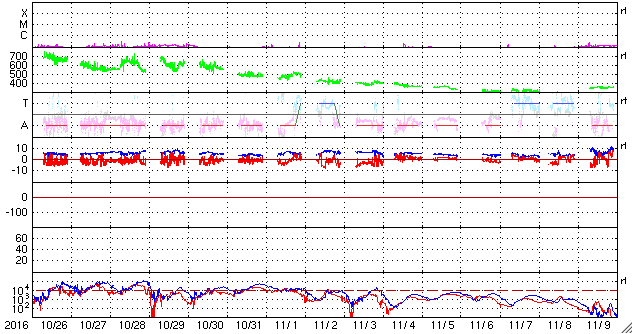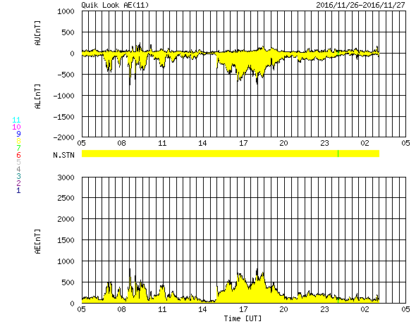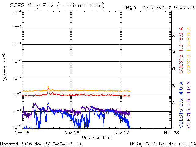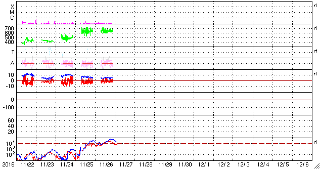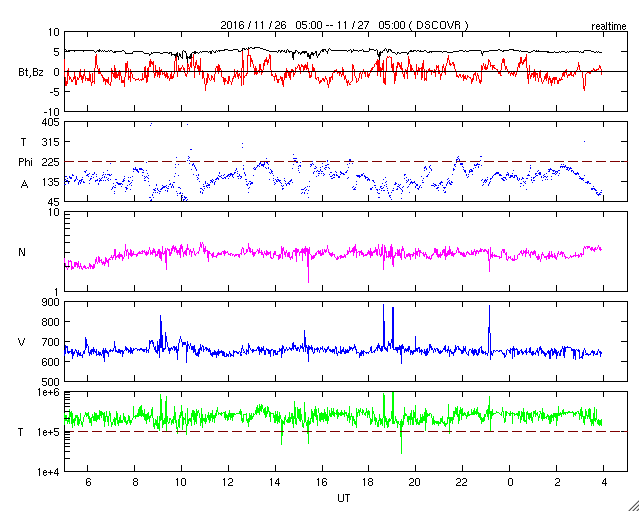 2016/11/27 13:05 更新 太陽風は650km/秒の高速風が続いています。磁気圏の活動は次第に弱まっています。 担当 篠原 太陽風は、650km/秒の高速状態が続いています。 昨日と比べると、低下の傾向が見られます。 一方、磁場強度は、5nTと平均的な値が続いています。 太陽風磁場の南北成分は、 0nTを挟んで小さく南北に変化する程度です。 磁気圏への影響は次第に小さくなっていて、 AE指数は、500〜700nTの中規模の変化が 中心になっています。 27日周期の図では、前周期の速度は、 今日に当たる10月31日から、500km/秒に下がっています。 今回はどこまで600km/秒台が続くでしょうか。 SDO衛星AIA193の太陽写真では、 太陽の中央から東側(左側)にかけて、 コロナホールは特に見られません。 今回の高速風が通り過ぎた後は、 しばらく、穏やかな太陽風になりそうです。 太陽は、特に変化は見られず、 静かな状態が続いています。 放射線帯の高エネルギー電子は、 GOES13(赤線)も10,000を超えて高まっています。 更に増加して、 GOES15(青線)は、100,000に達するでしょうか。