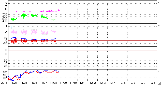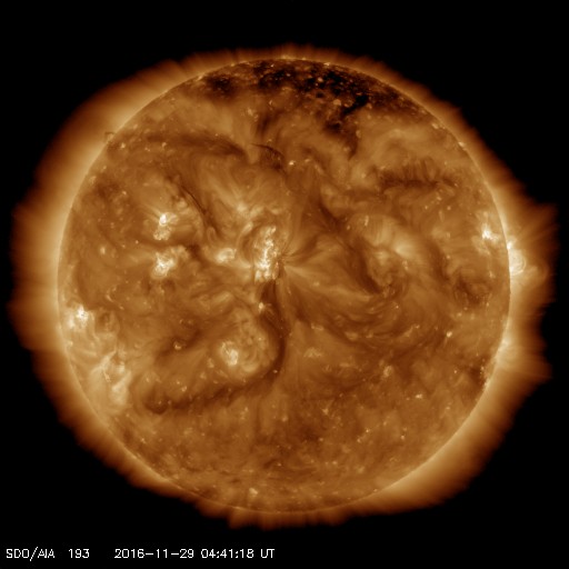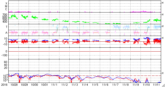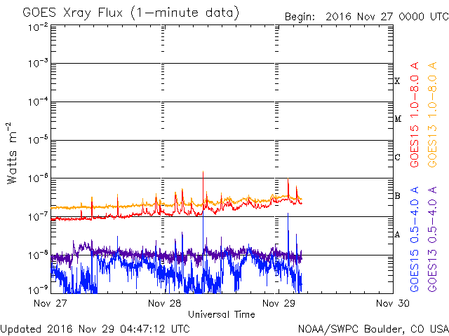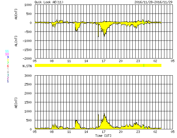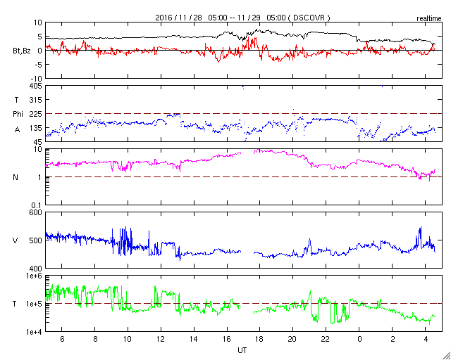2016/11/29 13:47 更新 高速太陽風は終わりに近づいています。ニュージーランドのオーロラをどうぞ。 担当 篠原 ニュージーランド・ダニーデンの中村太一さんより、 今回の高速太陽風の速度が700km/秒に達した頃、 先週の金曜日の夜に撮影されたオーロラの写真をいただきました。 夏を迎えている南半球のダニーデンは、 南緯46度近くにあるため(日本だと稚内くらいです)、 夜がずいぶん短くなっているようです。 その短い時間に、オーロラの光が2回強くなるのが観測できたとのことです。 中村さんによると、 1枚目の写真は、一部に夕日の影響も残っているそうです。 ただし、天の川も写っていて、あくまで天体写真レベルでの影響です。 2枚の写真の頃、太陽風の速度は700km/秒に高まり、 AE指数は1000nTに達する活発な変化をしていました。 しかし、太陽風磁場の南北成分は、あまり大きく振れなかったので、 速度はかなり高まったものの、 AE指数の変化はほどほどだったように思います。 中村さんもこのことを指して、 オーロラは予想よりは小さかったと感じたそうです。 とても参考になる貴重な写真を、どうもありがとうございます。 現在の太陽風は、 昨夜にかけて、速度が一旦450km/秒まで下がりましたが、 今朝になると盛り返して、再び500km/秒に近づいています。 しかし、これ以上高まることはなく、一時的な変化だと思います。 太陽風の磁場強度も、3nTくらいへ下がっていて、 高速風領域の終わりは近そうです。 AE指数は、800nTに達する中規模の変化もありますが、 全体としては、変化は小さくなっています。 太陽風が落ち着いてくると、 磁気圏もさらに穏やかになっていくでしょう。 太陽は、東側に2614黒点群が発生しています。 また、西の端(右端)で、C1.4の小さいフレアが発生しています。 小さいとは言っても、Cクラスに達するフレアは、 10月17日のC4.2以来で、40日ぶりの発生です。 放射線帯の高エネルギー電子は、 10,000を超えて高まった状態が続いています。 ![]() ニュージーランド南島ダニーデンで、現地25日23時12分(世界時25日10時12分)に撮影されたオーロラ。 (c) 中村太一氏 ![]() ニュージーランド南島ダニーデンで、現地26日1時25分(世界時25日12時25分)に撮影されたオーロラ。 (c) 中村太一氏 ![]() SDO衛星のAIA193カメラによる太陽コロナの様子 (c) SDO (NASA) ![]() SDO衛星による太陽の可視光写真。マウスの矢印を写真に重ねると、黒点番号付きの写真に切り替わります。 (c) SDO (NASA) ![]() DSCOVRが観測した太陽風の磁場(1番上の枠、黒線は全体の強度、赤線は南北成分) および、太陽風の密度(3番目の紫線)、速度(4番目の青線) (c) データ:NOAA/SWPC、作図:宇宙天気ニュース ![]() リアルタイムAE指数 下段のAEグラフの値が高くなると、オーロラ活動が活発化しています。 (c) 京都大学, NICT ![]() 27日の太陽周期に合わせたデータプロット 太陽が同じ面を地球に向けていた27日前の変化から、今後を予想することができます。 (c) 作図:宇宙天気ニュース