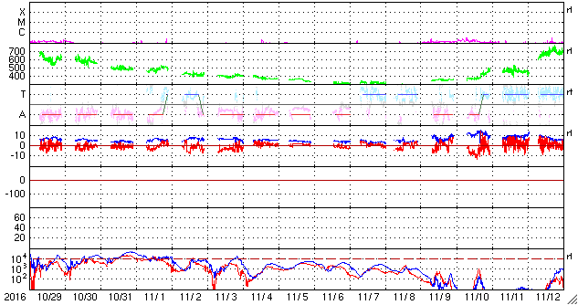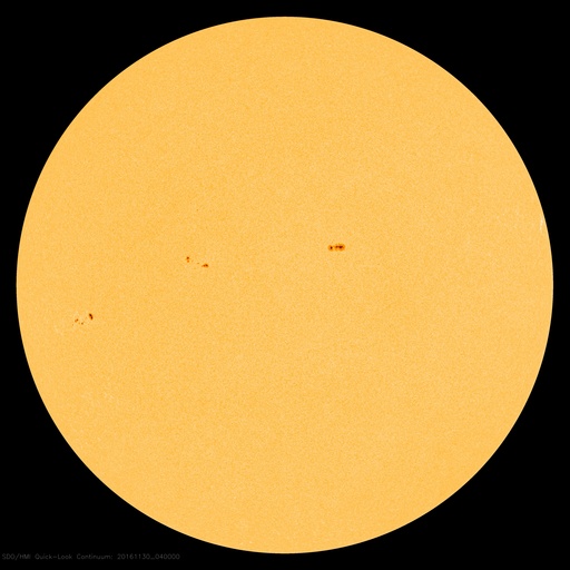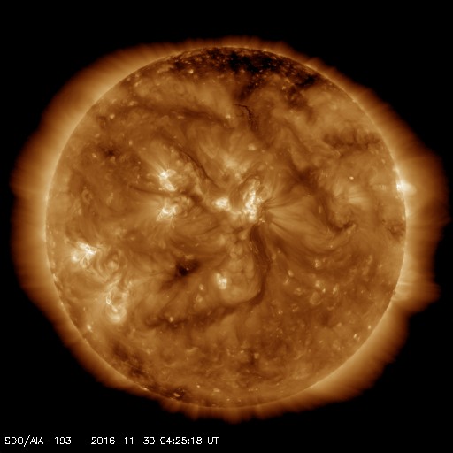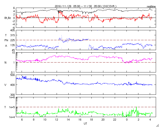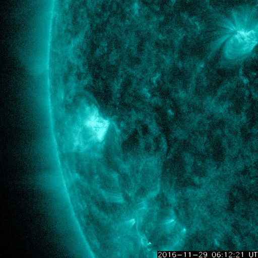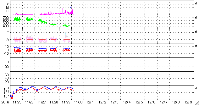 2016/11/30 13:38 更新 Mクラスのフレアが2回発生しました。Mクラスは4か月ぶりです。 担当 篠原 昨日の2614黒点群に続いて、 東端近くに2615黒点群が発生しました。 この黒点群はなかなか活動的で、 昨日の午後、29日16時(世界時29日7時)に、 C7.5とやや大きいCクラスフレアを起こすと、 その後、30日2時半(世界時29日17時半)にM1.0、 30日8時半(世界時29日23時半)にM1.2と、 Mクラスの中規模フレアを2回起こし、 その後も、C6.0、C3.1を起こしています。 活発なフレアの様子を、SDO衛星AIA131の動画で紹介します。 Mクラスのフレアが発生したのは、 8月7日のM1.3以来で(記事)、およそ4か月ぶりです。 2016年のフレアは、ここまで、Xクラスは発生せず、 Mクラスも今日のフレアを加えて16回だけです。 2月に4回、7月に7回と短い期間に集中していて、 全体としては、珍しい現象になってしまった印象です。 2615群は、 発達を続けて、更に大きいフレアを起こすのか、 今日のフレアが今年最後のMクラスになってしまうのか、 今後の活動に注目してください。 太陽風は、今日に入る頃に400km/秒へ速度が下がり、 平均的な風に戻りました。 磁場強度も、4〜5nTと平均的な値に戻っています。 SDO衛星AIA193では、コロナホールは特に見られず、 太陽風はしばらく穏やかな風になりそうです。 磁気圏もだいぶ穏やかになっていて、 AE指数は300nTの小規模の変化が 2回発生した程度です。 放射線帯の高エネルギー電子は、 10,000を超えて高まった状態が続いています。 太陽風が落ち着いたため、ゆっくりと減少しています。 ![]() 活発にフレアを起こしている2615黒点群。SDO衛星AIA131。 (c) SDO (NASA)、(動画加工 : 宇宙天気ニュース) ![]() SDO衛星のAIA193カメラによる太陽コロナの様子 (c) SDO (NASA) ![]() SDO衛星による太陽の可視光写真。マウスの矢印を写真に重ねると、黒点番号付きの写真に切り替わります。 (c) SDO (NASA) ![]() GOES衛星の太陽X線データ (c) NOAA/SWPC ![]() DSCOVRが観測した太陽風の磁場(1番上の枠、黒線は全体の強度、赤線は南北成分) および、太陽風の密度(3番目の紫線)、速度(4番目の青線) (c) データ:NOAA/SWPC、作図:宇宙天気ニュース ![]() リアルタイムAE指数 下段のAEグラフの値が高くなると、オーロラ活動が活発化しています。 (c) 京都大学, NICT ![]() 27日の太陽周期に合わせたデータプロット 太陽が同じ面を地球に向けていた27日前の変化から、今後を予想することができます。 (c) 作図:宇宙天気ニュース