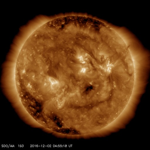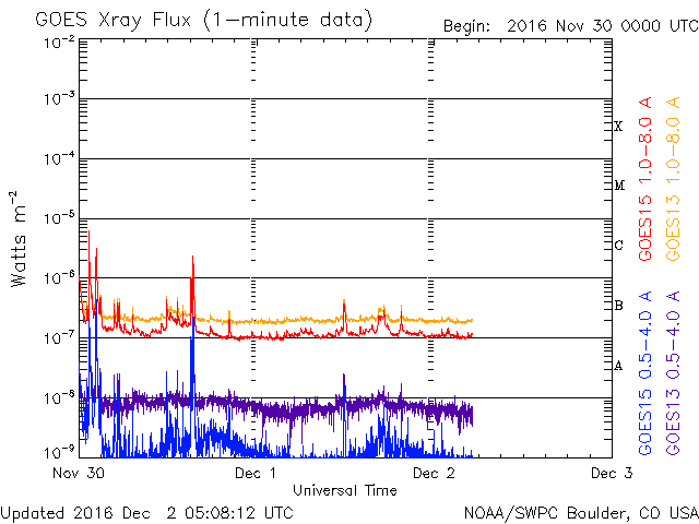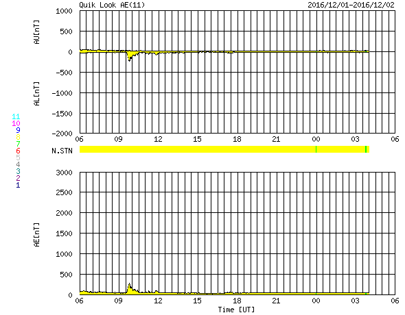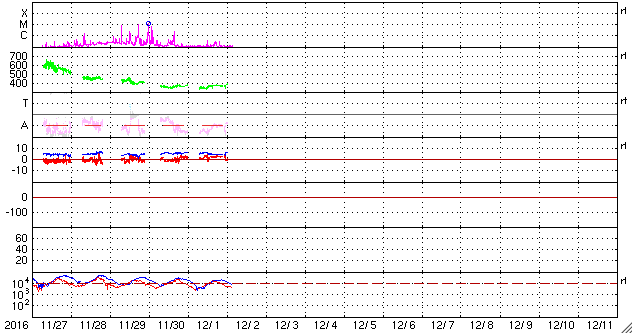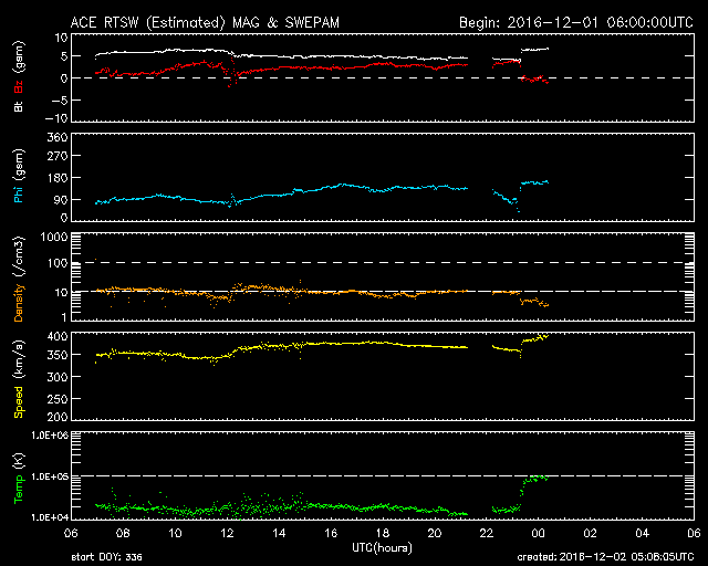 2016/12/ 2 14:08 更新 太陽風に小さい変化が到来しました。再び、アラスカのオーロラをどうぞ。 担当 篠原 高坂雄一さんより、昨日に続いて、 アラスカ・アンカレッジに近いタルキートナで撮影された 素敵なオーロラの写真をいただきました。 撮影は、現地11月30日4時頃(世界時30日12時)頃です。 午前3時まではほとんどオーロラは現れず、 4時頃になって、赤を伴ったものが撮影できたそうです。 この頃の太陽風は、350km/秒近くと低速で、 磁場強度は、5nT程度ありましたが、 南北成分は0nT付近にあり、 磁気圏の状態はかなり穏やかだったようです。 AE指数も、小さい変化があるかないかというところです。 写真のオーロラも、地平線近くにやっと見えているくらいですが、 デナリの山並みと重なって、とても素敵な風景になっています。 また、1枚目の写真の光の列は、 アラスカ鉄道の鉄橋を走る列車だそうです。 写真の左上に伸びる天の川と重なって、銀河鉄道を思い出しますと 高坂さんのコメントです。 AE指数は小さくても、素敵な光景です。 どうもありがとうございます。 現在の太陽風は、昨日より350km/秒付近の低速風が続いていましたが、 今朝、2日9時(世界時2日0時)に、 急に速度が500km/秒近くに上がる変化が到来しています。 その後、400km/秒に下がったり、また上がったりして、 現在は再び400km/秒です。 磁場強度は、5nTと平均的な強さで、 南北成分は、0nTから少しだけ南寄りに振れています。 AE指数は、ほとんど変化が見られず、 磁気圏は静穏です。 太陽風の変化は、一時的な変化に留まりそうです。 基本的には、この後も穏やかに推移しそうです。 太陽は、2614黒点群の上に新しい黒点が出現しています。 X線グラフは、Bクラスの小さい変化がいくらか見られますが、 規模は大きくなる様子は見られません。 放射線帯の高エネルギー電子は、ゆっくりと減少していますが、 2つの衛星とも10,000を超えています。 昨日のオーロラの紹介記事では、 書いている途中で日付を勘違いしてしまったようで、 太陽風の状況について、間違った紹介をしてしまいました。 正しくは、450km/秒と平均的な風に戻り、 磁気圏もだいぶ穏やかになっていた頃の様子です。 申し訳ありません。